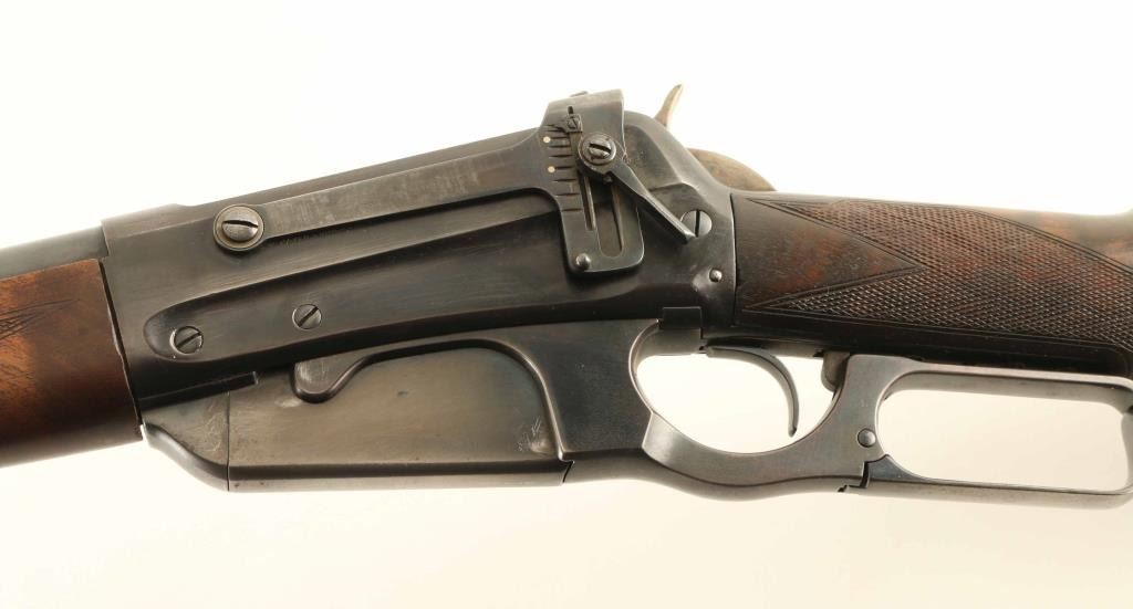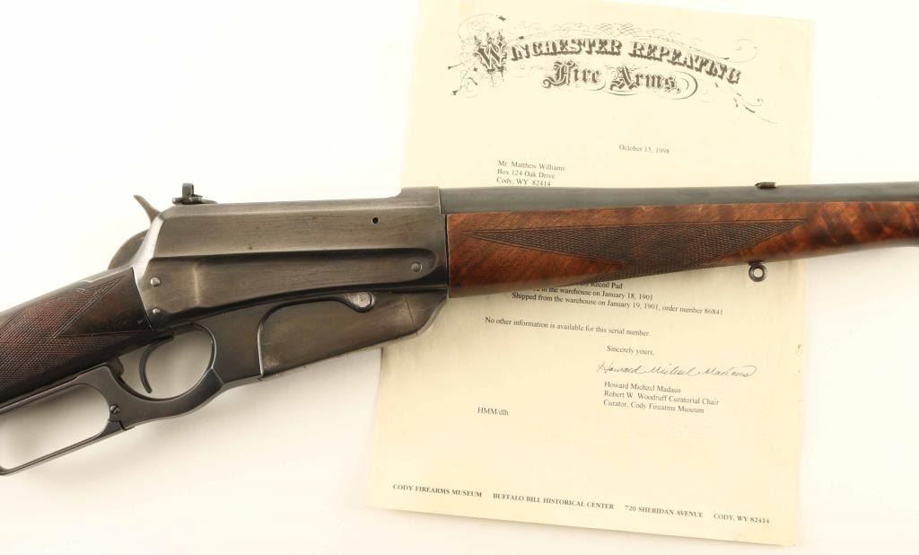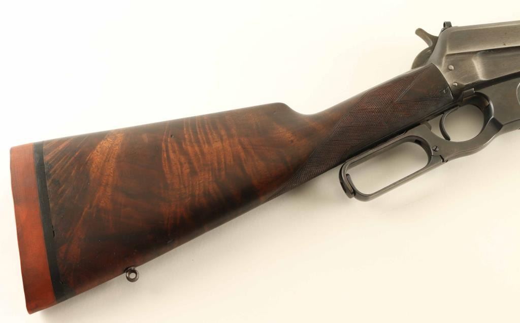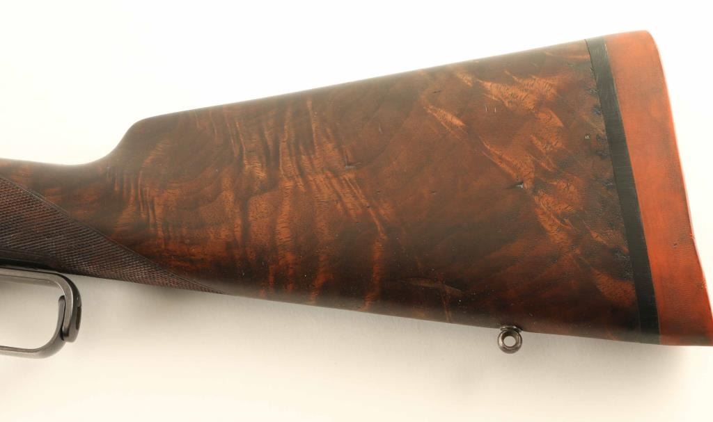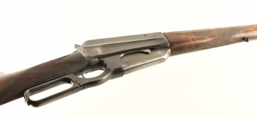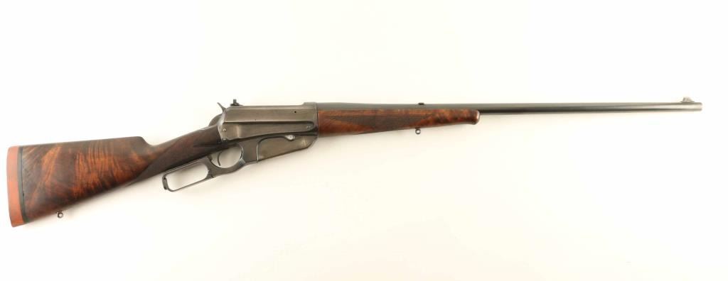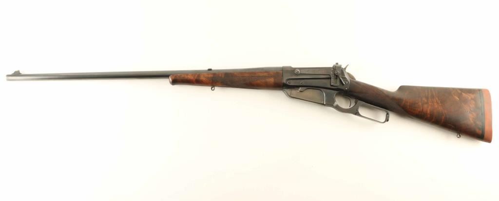 'Fancy Sporting Rifle' manufactured 1901. Features 26" barrel, blade front sight, Lyman rear peep sight with quick throw lever for elevation adjustments & selectable aperture for peep, dovetail in barrel for rear sight filled with blank, vertical box magazine, straight grip, solid rubber recoil pad, eyelet type sling studs, checkered panels at wrist & forend, extra fancy figured walnut stock & forend. Bore is very good to excellent condition. Retains 80% blued finish. Barrel appears to be a later replacement, with few signs of use or handling. Action appears reblued, with small pits and long scratches under the finish, some dishing to surfaces. Finish is thinning or graying on high spots & edges of action, where lever rubs on magazine. Wood is very good or better condition, some dents & small gouges, visible lines from light sanding, slight shrinkage at wrist. Checkering is fairly sharp, some thinning of outside border lines, fairly even depth. Recoil pad is hard to the touch, good fit to stock. Two line address under rear sight shows some shallowness in places and pits over letters. Markings on barrel are crisp. No proofs observed on receiver ring or breech. Action operates smoothly. Includes letter from Cody Firearms Museum / Buffalo Bill Historical Center listing manufacturer's data for this rifle as shipped from the factory. Factory records confirm caliber, barrel length, fancy checkered stock, shotgun butt with recoil pad, does not mention Lyman sight. Condition is NRA Good++ as restored *** C&R Firearm ***