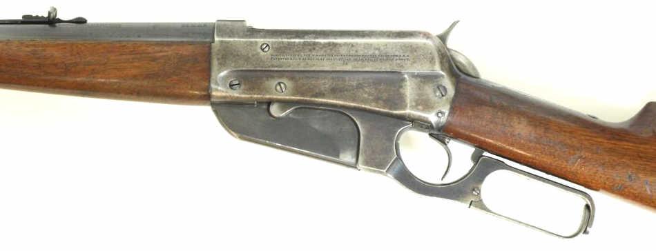 lever action rifle 24" round barrel, straight grain walnut stocks and iron crescent butt plate. Remains very good overall condition with 80-85% original blue, correct sights intact, receiver silver gray drifting brown, box magazine 70-80% blue, lever shows 30-40%, original walnut stocks with good fit showing 60-70% original varnish. Fine action, fair bore. FFL required. Mfg'd 1915. Includes 2 boxes ammo.