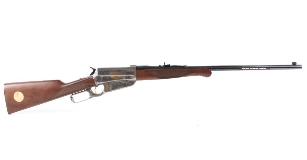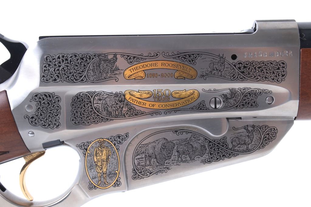 For your consideration is a Winchester Model 1895 .405 Win Teddy Roosevelt commemorative rifle. The Model 1895 chambered in .705 Win was Roosevelts preferred rifle and caliber. The left side of the barrel is marked “WINCHESTER MODEL 1895 Theodor Roosevelt High Grade – Caliber 405 Win. ONLY” and at the receiver with an oval “WP” proof. The right side of the barrel is marked “Made by Miroku-Japan – Imported by BACO, Inc. – Morgan, Utah / Winchester is a registered trademark of Olin Corporation”. The upper tang is marked “WINCHESTER / MODEL 1895”. The right front upper shoulder of the receiver is marked “TR150H0624”. The sides of the receiver are scroll engraved and with animal scenes with “THEODORE ROOSEVELT / FATHER OF CONSERVATION” in gold banners with “1858-2008 / 150 / YEARS” in the center. The left side of the magazine is engraved with a sheep and a bear, and the right side with bison and a mule deer. The left front of the trigger guard is engraved in gold with a bust of Teddy Roosevelt and on the right side with him standing. The top of the barrel is engraved in gold with Theodore Roosevelt’s signature. The barrel has a label stuck to it marked “WINCHESTER” and “Ask your dealer for a catalog / or visit Winchester.com”. The right side of the buttstock has a gold-plated medallion engraved with a bust of Theodore Roosevelt and his signature. The blue’d round barrel measures 24” in length. The front sight is a brass bead dovetailed into the top of the barrel. The rear sight is “U” notched semi-buckhorn elevator sight that is dovetailed into the barrel. This rifle comes with its factory box, paperwork and an unused cable lock. The box is white cardboard and has a black cardboard sleeve and a white Styrofoam liner. The sleeve is marked with a picture of Teddy Roosevelt and his signature and the front panel is marked “WINCHESTER / REPEATING ARMS”. Serial Number: TR150H0624. This is a modern firearm and requires a FFL transfer or NICS background check.