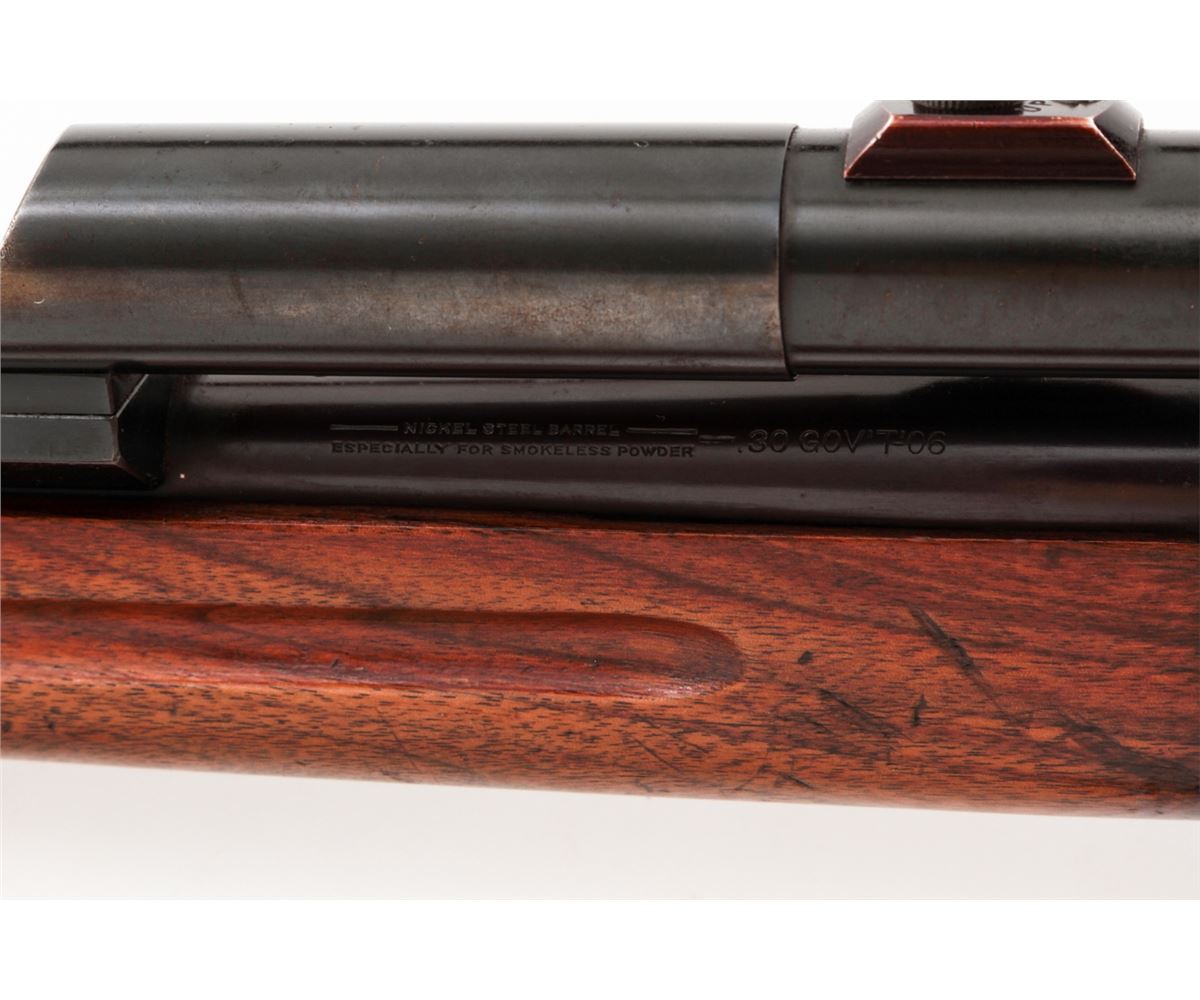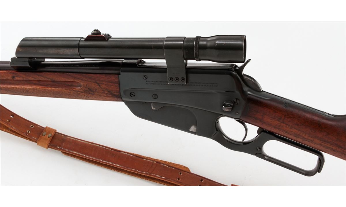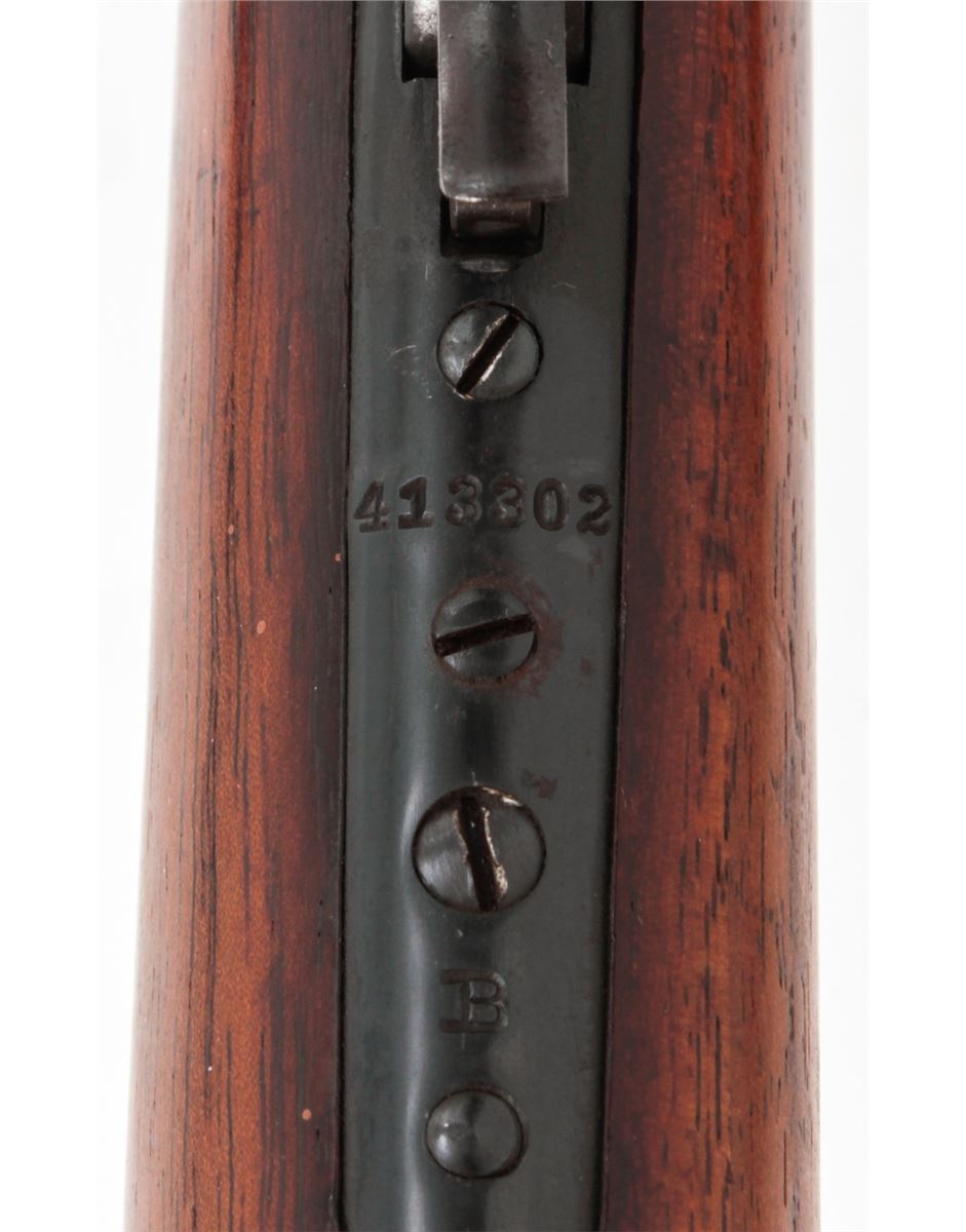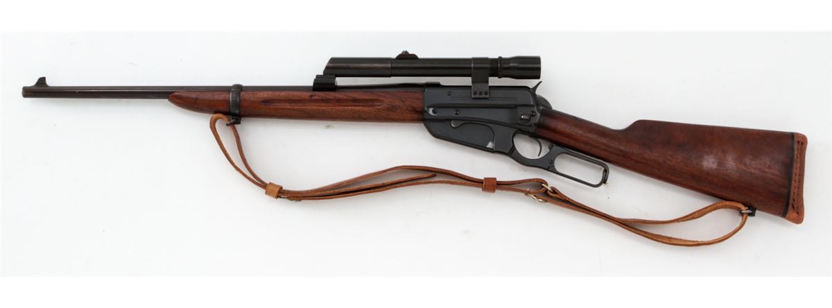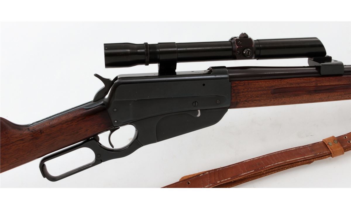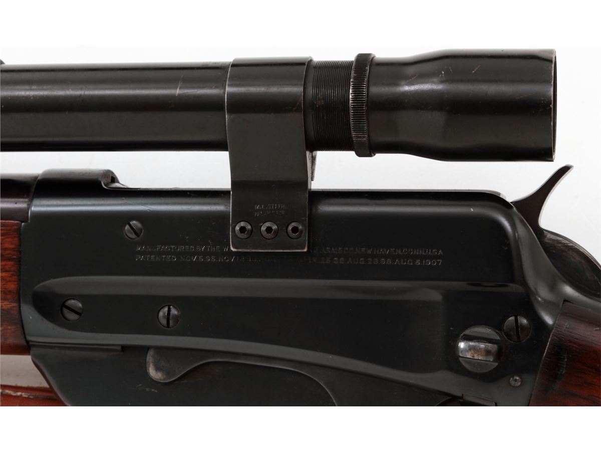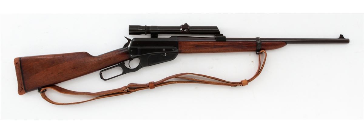 Winchester Model 1895 Lever Action Rifle, #413302, .30-06 cal., 22'' barrel, blue finish, walnut stock, with leather sling. Topped with a Weaver K2.5 scope with offset scope mounts. Mfg'd 1925. Condition is very good as refinished retaining approx. 94% immersion type blue. Receiver and top of barrel have been drilled and taped for scope. Stock with moderate dings, marks and scratches, and old red rubber butt pad has perished. Action remains crisp, bore is fine, scope optics are clear. Est.: $400-$600. (C&R)