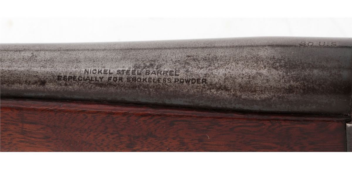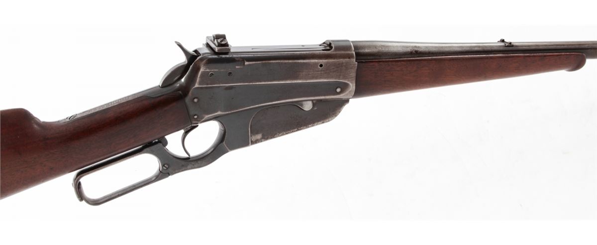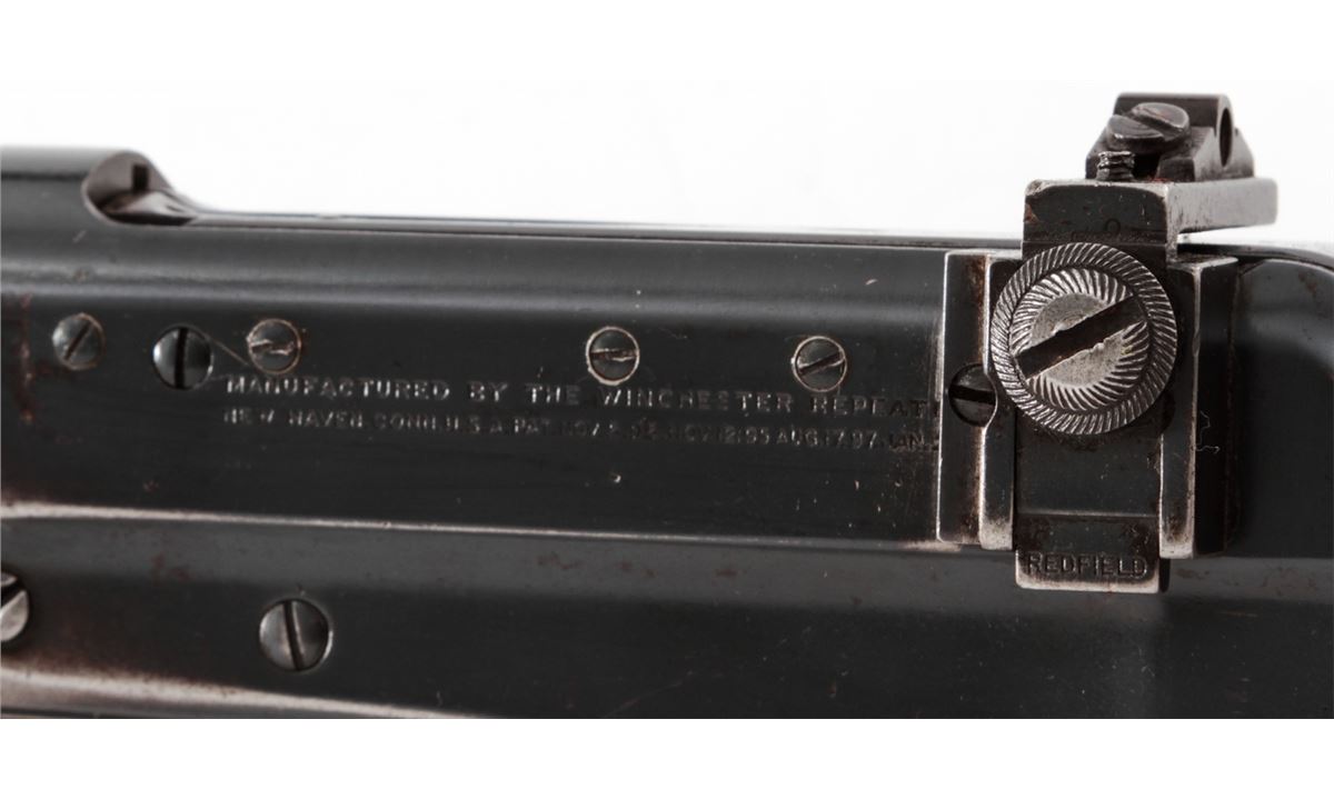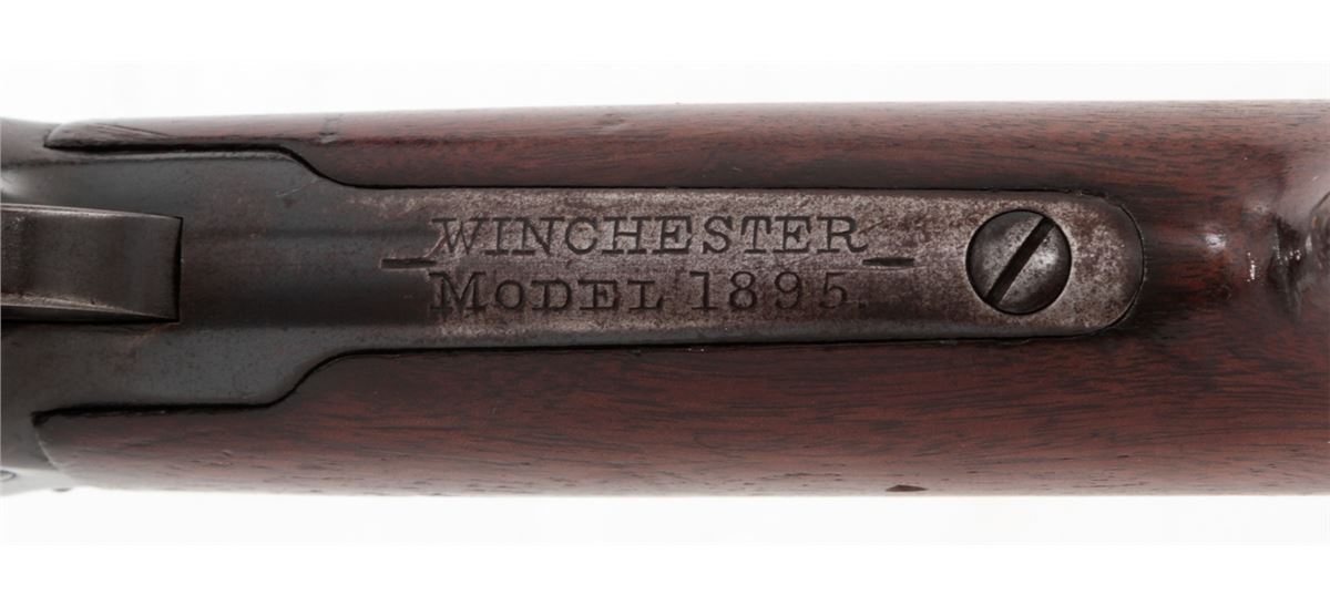 Winchester Model 1895 Lever Action Rifle, #30671, .30-40 cal., 28'' barrel, blue finish, walnut stock and forend, with added rubber butt pad and later added rear peep sight. Condition is very good as refinished retaining approx. 70% later added blue. Frame at one point was drilled and taped for scope mounts, which has later been removed and the holes having been plugged with set screws. Magazine area shows moderate corrosion from field use. Cutdown stock with scuffs and scratches, but good action and very good bore. Est.: $250-$450. (C&R)
