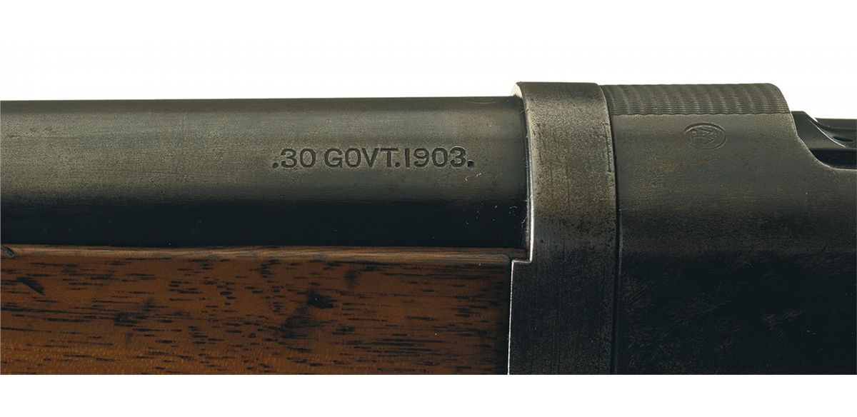 Manufactured in 1915. Standard nickel steel/smokeless powder marking on the left rear of the barrel with "30 GOVT.1903." on the left rear at the breech, the Winchester two-line address/patent dates on the left side of the receiver, the three- line model, maker, trade mark information on the upper tang and the serial number on the lower tang. Sheard Marble front blade sight, the rear sight has been removed and a filler block installed, and a receiver mounted peep sight has been installed. Mounted with a smooth Schnabel forearm with ebony insert and straight grip stock with a steel crescent buttplate.