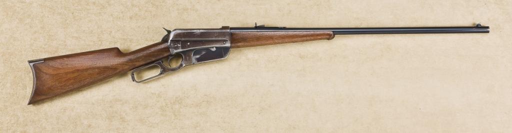 Winchester Model 1895 lever action rifle, 38-72 WCF cal., 26” round barrel, blue finish, plain wood stocks, #29409. This gun is in overall very good condition showing approx. 92% muted original finish on the barrel and approx. 70% original blue on the receiver and lever. The bore is very good, the action crisp, the markings good and the wood very good with some slight mars, dings and scratches due to carry and storage. A nice ’95 Winchester in a difficult to find caliber. Est.: $800-$1,600.