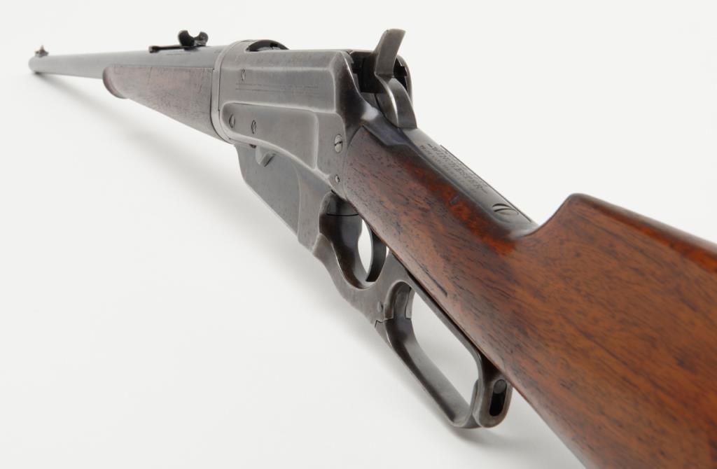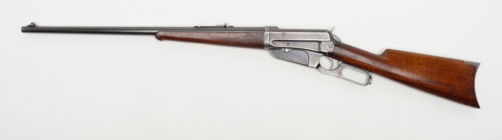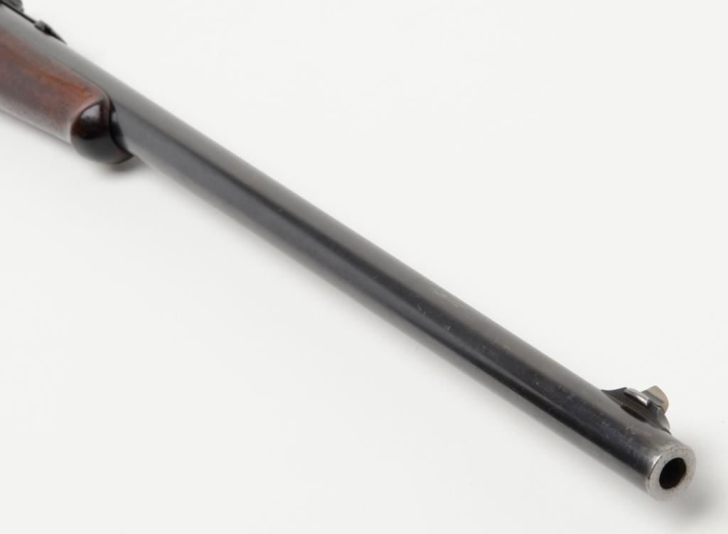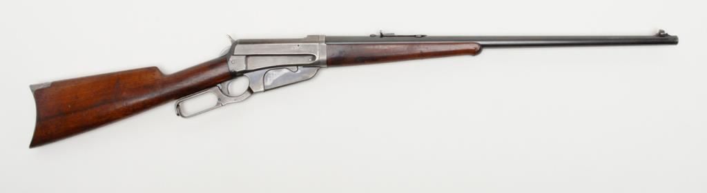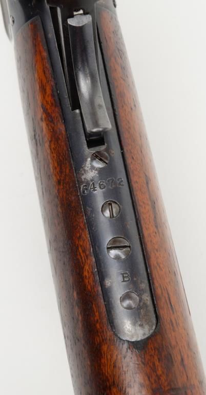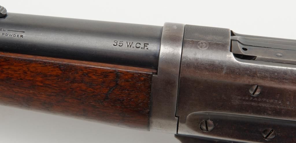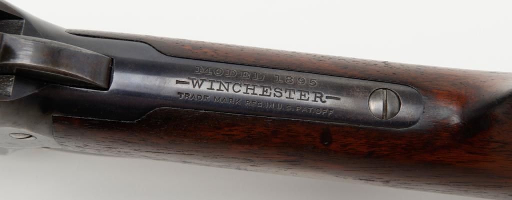 Winchester Model 1895 lever action takedown rifle, .35 W.C.F. cal., 24” round barrel, blue finish, wood stocks, #64672 in overall near fine condition showing the majority of its original blue finish on the barrel and considerable original matchingblue finish on the receiver and lever; crisp action, near fine bore, sharp markings, very good + butt stock and forend. (C&R/PPT). Est.: $1,250-$2,500.