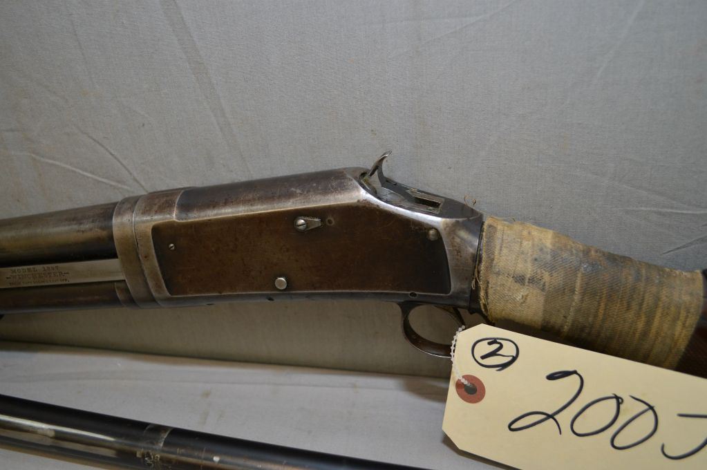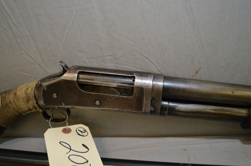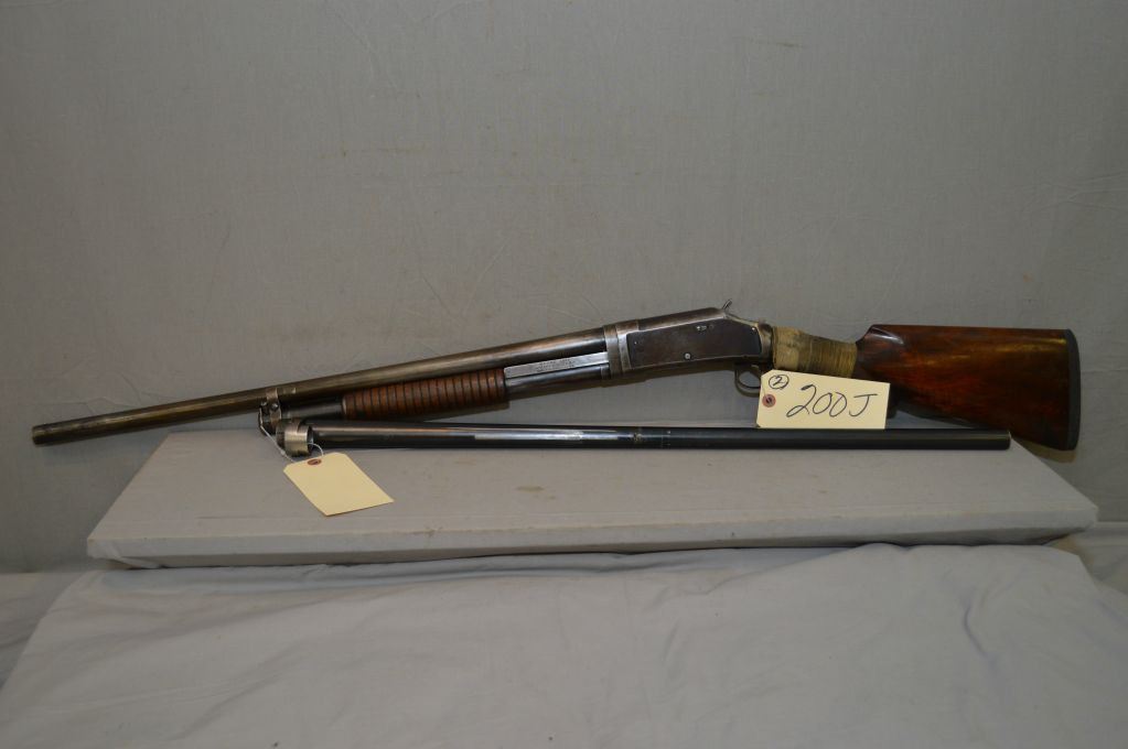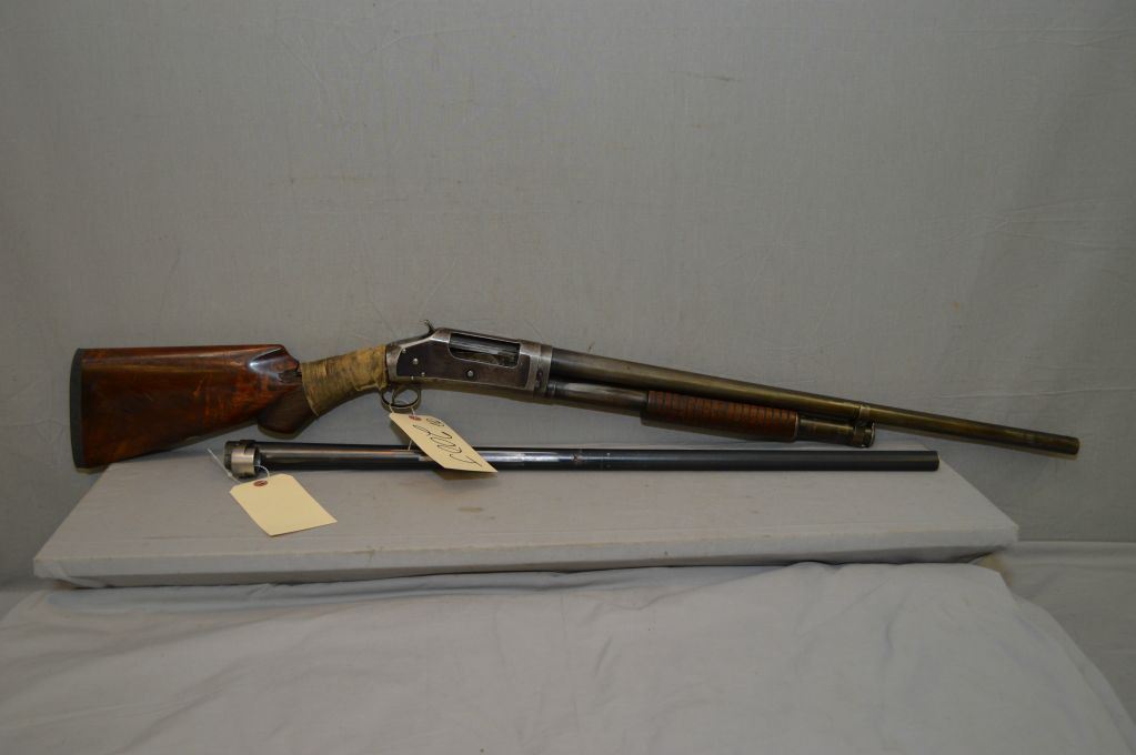Winchester Model 1897 .12 Ga Pump Action Shotgun w/ 26" bbl & c/w extra 30" barrel [ traces of faded blue fading to grey in some areas, deluxe checkered pistol grip stock, cracked, chipped and taped at wrist - missing the proper recoil pad, good forend ] Ser # 431988