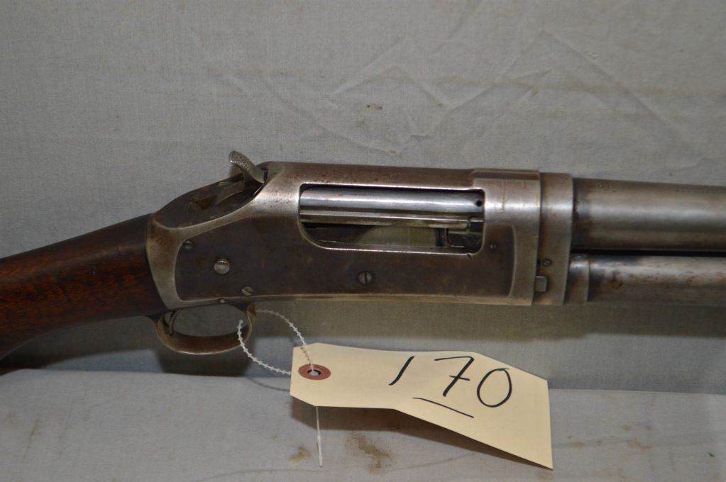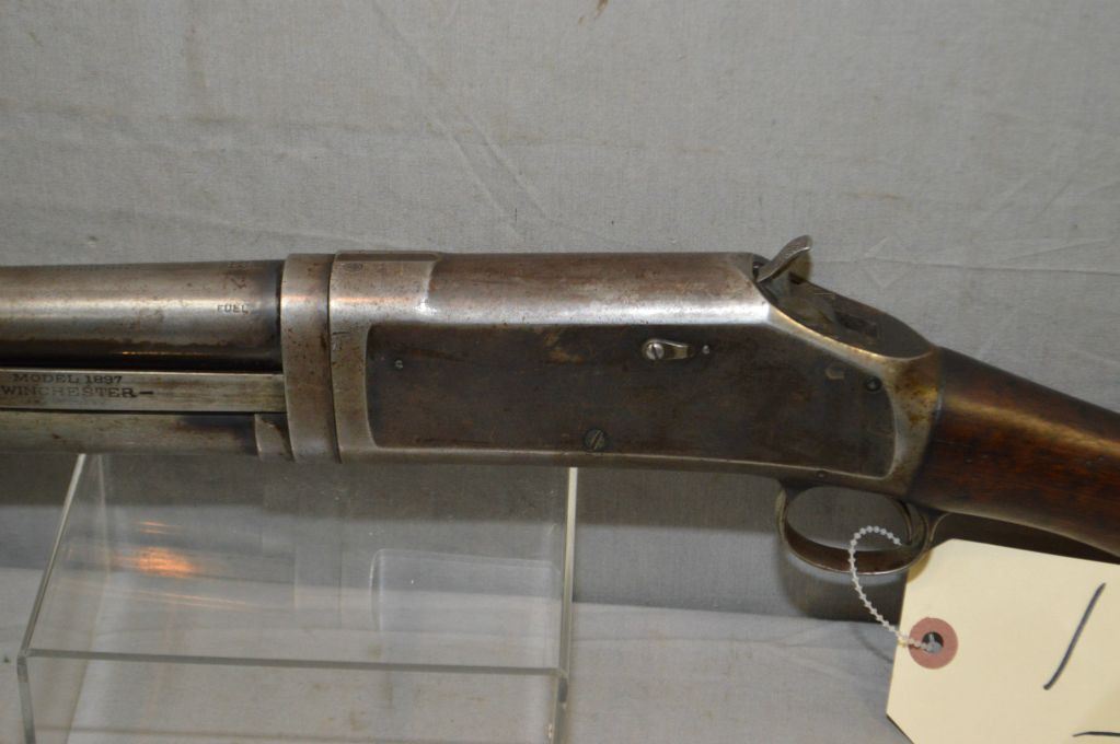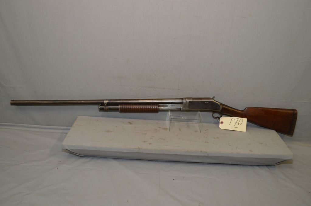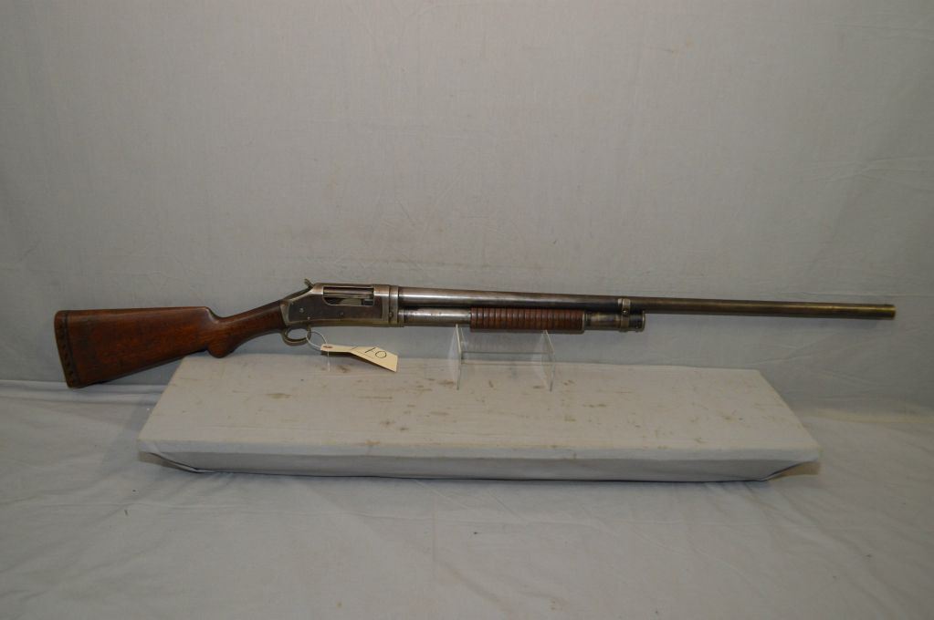 Winchester Model 1897 .12 Ga Pump Action Shotgun w/ 32" bbl [ fading blue finish, faded more in carry areas, a small ding approx. 9" from muzzle of barrel on left hand side, rounded pistol grip stock w/hand carved name right side of butt stock "Sanborn", Jostam recoil pad, Circa 1907 ] Ser # 311947