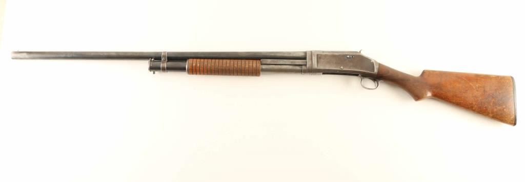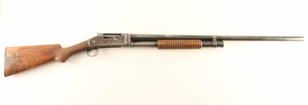 Vintage slide action repeating shotgun chambered for 2 3/4" 12 gauge shells, manufactured circa 1909. Features a blued finish, full choke 30" takedown barrel, half-length tube magazine, brass bead front sight, smooth trigger, exposed hammer with knurled spur, grooved walnut slide handle and smooth semi-pistol grip shoulder stock with factory buttplate. Shotgun retains approximately 10% of it's blued finish with the balance of the metal surfaces in-the-white displaying a browning patina. Action is sound, the bore is good, markings are good and the wood stocks are near good with many blemishes. Condition is NRA Fair. ***C&R Firearm***