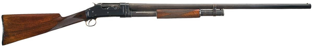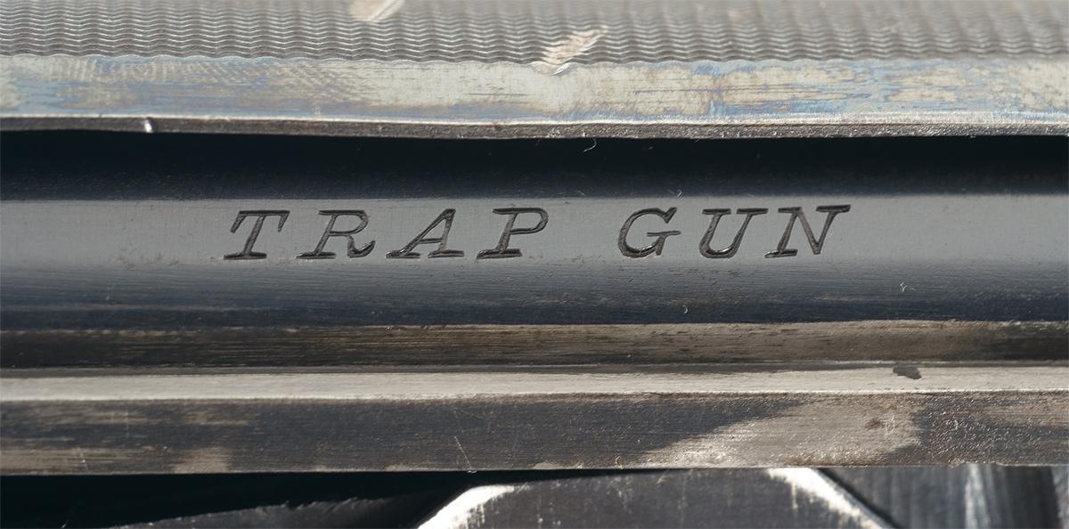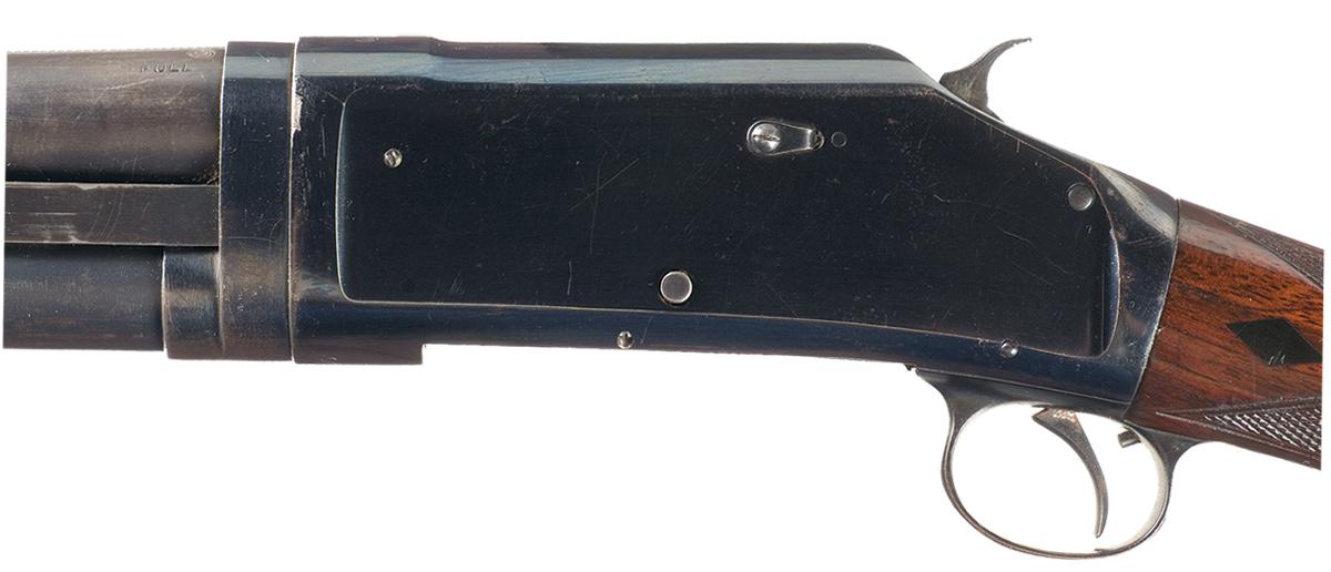 Manufactured in 1914. Single bead sight on a matted barrel with a 2 3/4 inch chamber, choked full. Standard two line marking on the left rear of the barrel with the matching serial number marked on the bottom of takedown ring and receiver. Marked "TRAP GUN" on exposed top portion of the breech bolt. Mounted with a checkered forearm and straight grip stock with ebony diamond inserts on the wrist and a checkered hard rubber Winchester buttplate. Length of pull is 13 5/8".