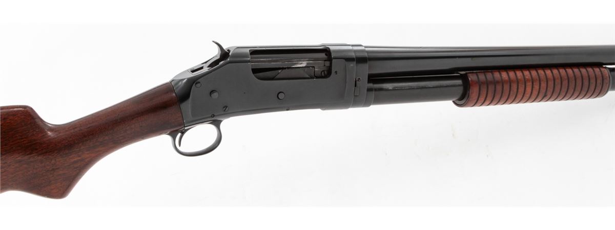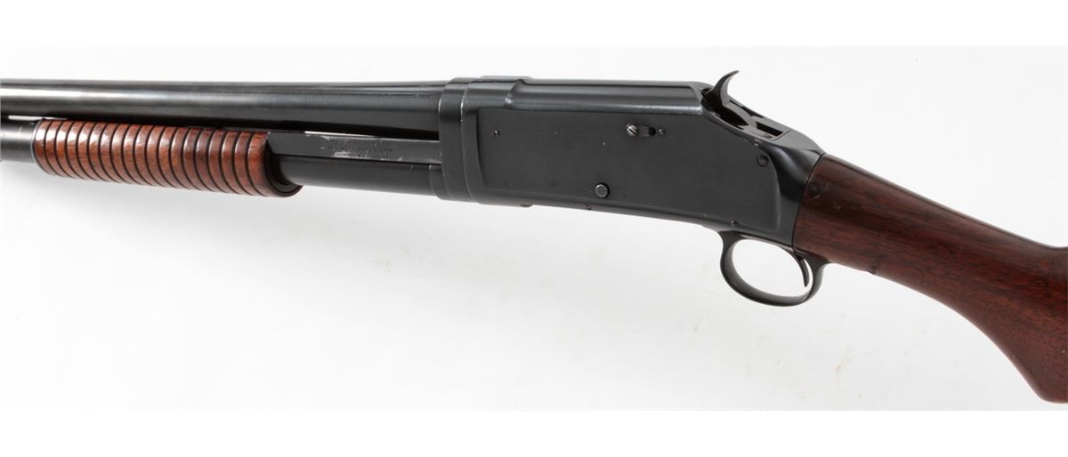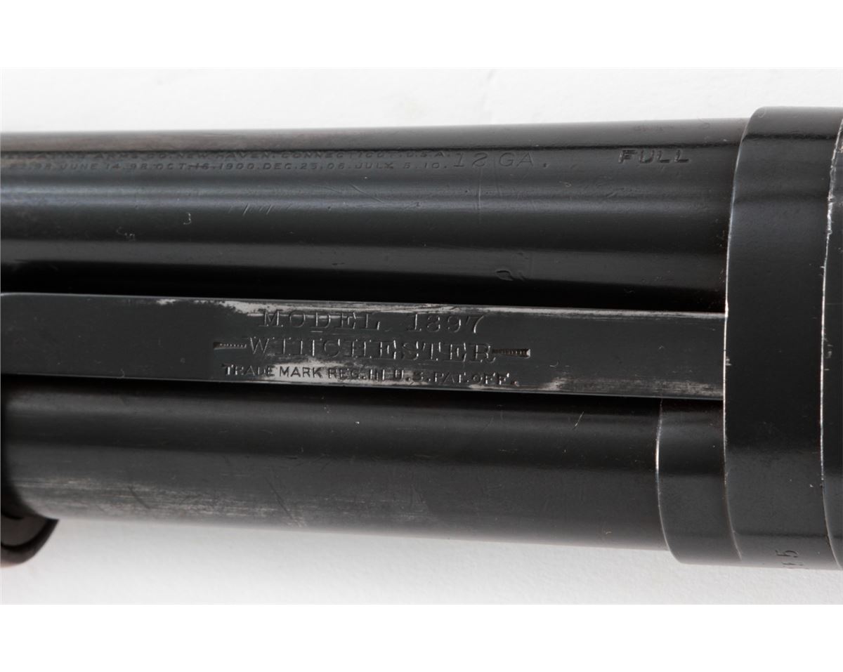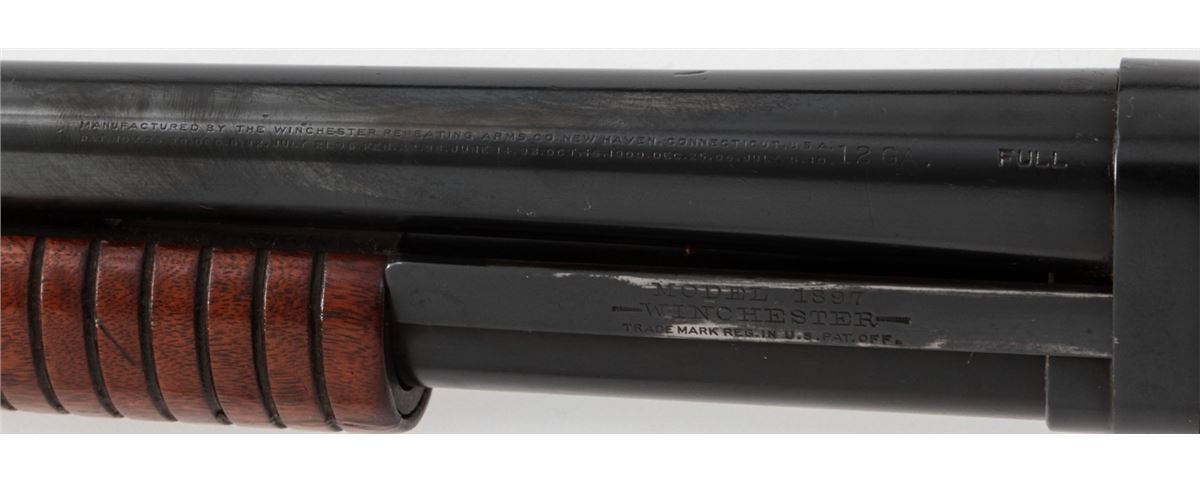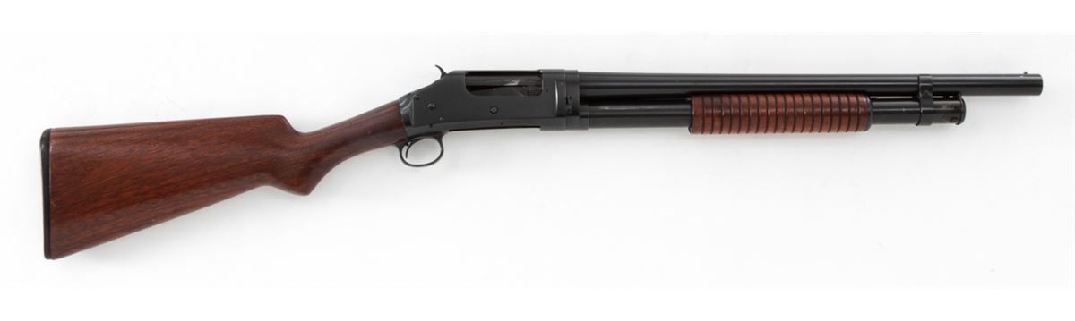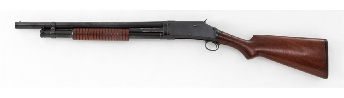 Winchester Model 1897 Pump Action Shotgun, #617355, 12 ga., barrel cut to 19'', blue finish, walnut stock and forend. Mfg'd 1917. Condition is very good as altered and refinished, retaining approx. 95% of an immersion type blue. Stock with light scuffs and scratches and an additional coat of varnish. Good action and bore. Est.: $300-$500. (C&R)