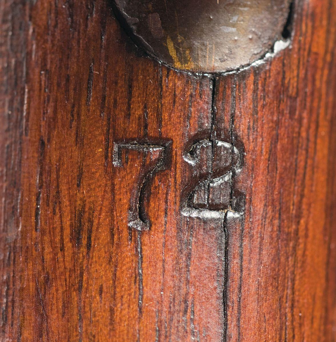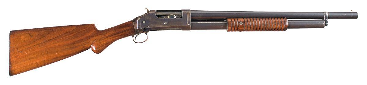 Made in 1900. Single bead sight, bore marked cylinder, 17 groove forearm and a smooth pistol grip stock marked "72" in the grip area and fitted with a smooth iron buttplate. Length of pull is approximately 13 3/4".