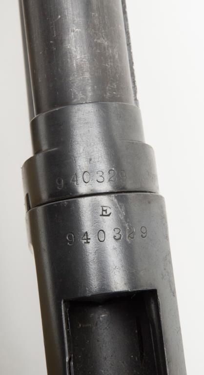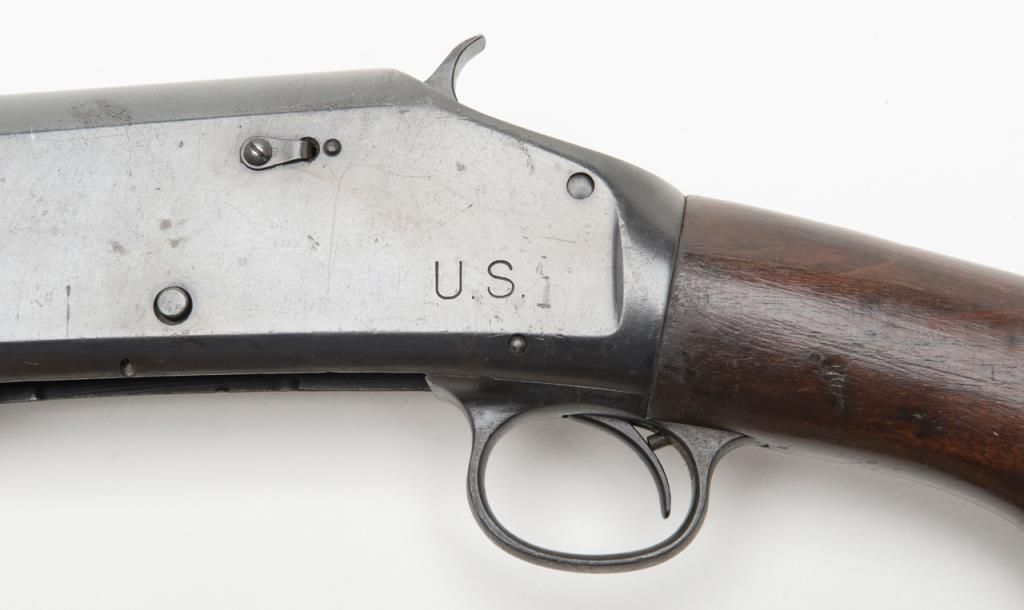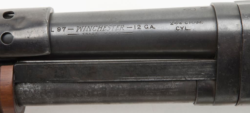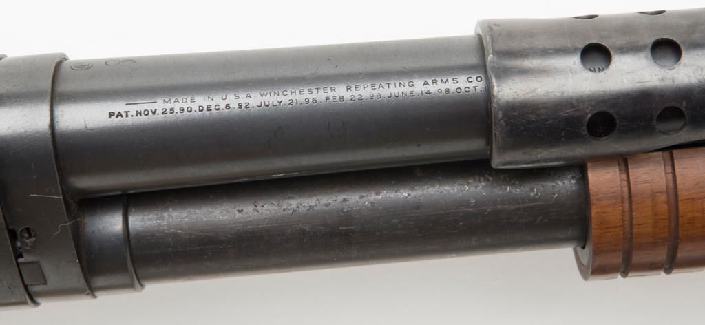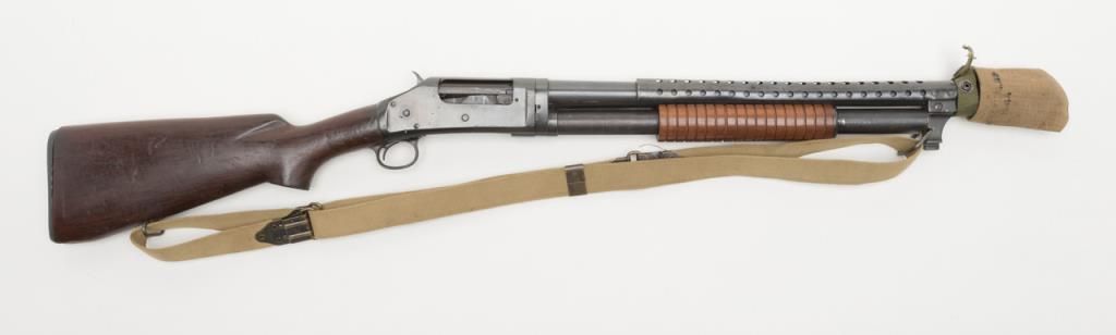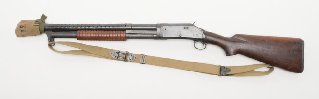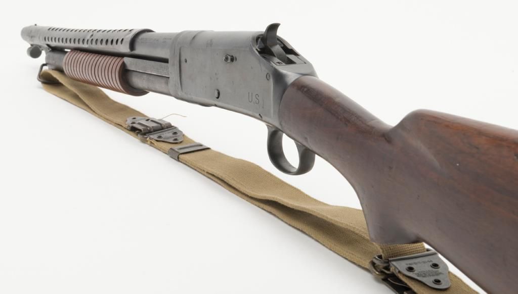 Winchester Model 1897 U.S. marked pump action Trench pump action takedown shotgun, 12 gauge, 2-3/4” chamber, CYL choke, 20” barrel, old re-blued finish, wood stocks, pat. marked ventilated hand guard on barrel with bayonet lug,woven sling, #940329 in overall used good condition showing the majority of an old re-blued finish, good bore, action and barrel markings including Winchester proof and ordinance flaming bomb proof on the top of the barrel at the breech; also “U.S.” stamped on the lower left side of the receiver; the butt stock shows wear with scattered mars and scratches, an old loss to the bottom toe, a replacement Winchester checkered hard rubber butt plate and a “W.B.” inspector’scartouche on the left side of the butt stock; the forend wood is in near fine condition and a replacement piece; the sling is in very good condition and is a “No Buck” brand with patent date of 7-21-14. Also included is a tan canvasmuzzle cover marked “US” and dated “1944”. (C&R/PPT). Est.: $1,000-$2,000.