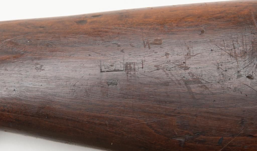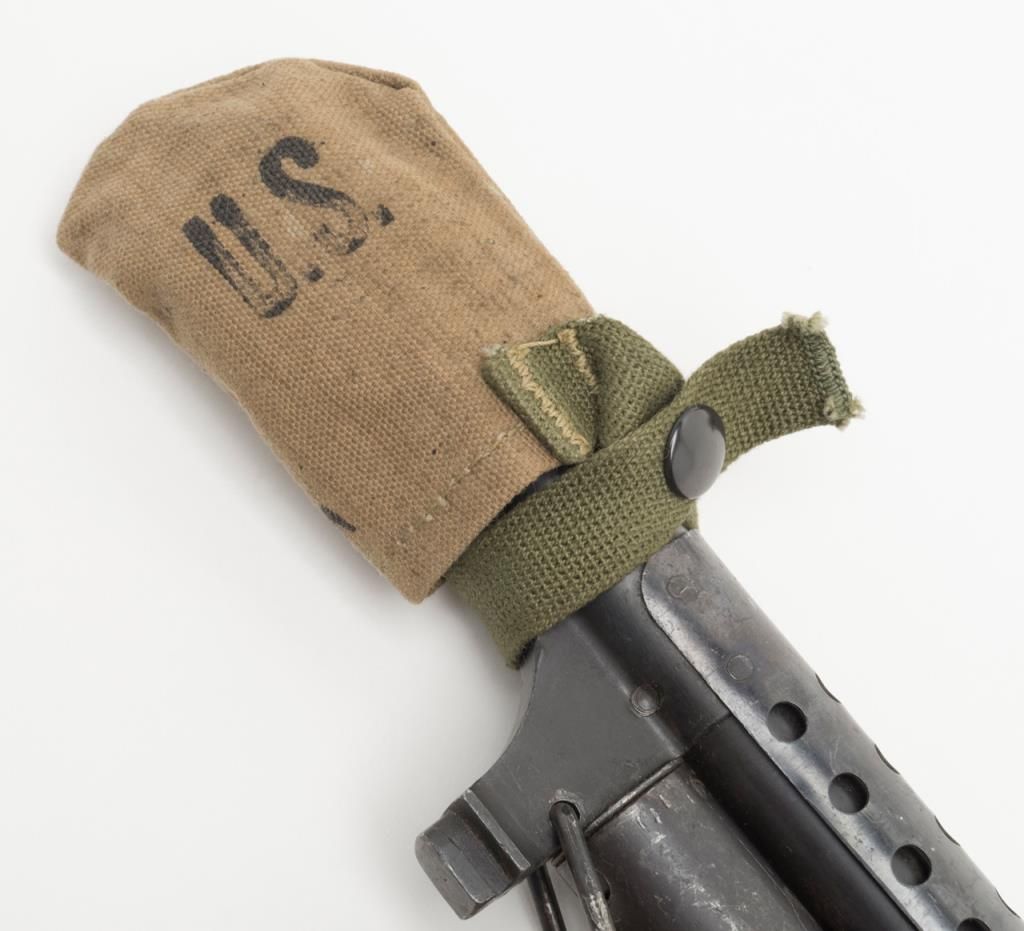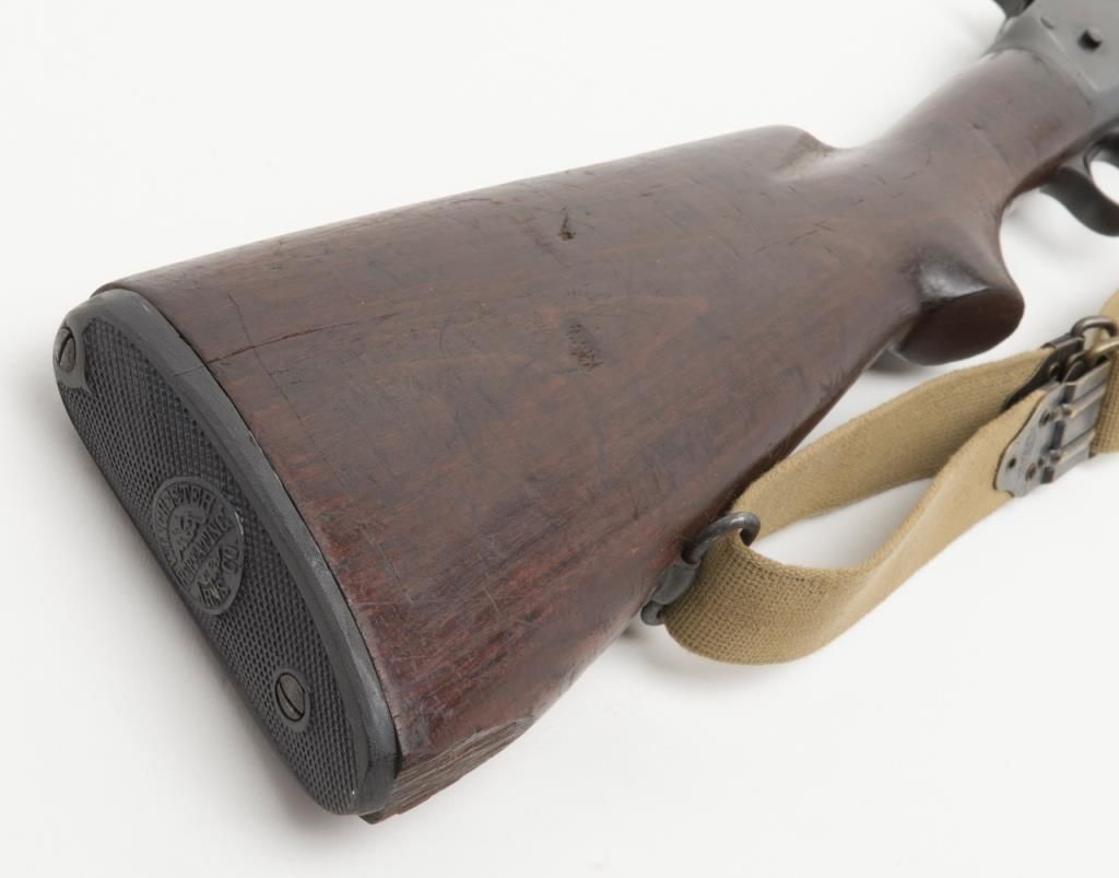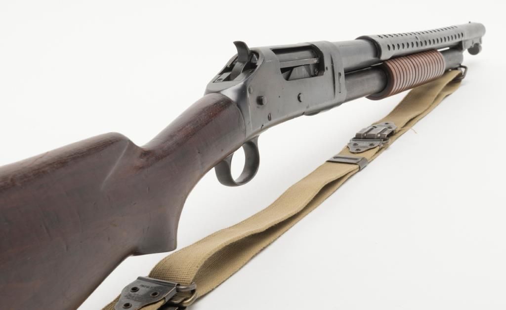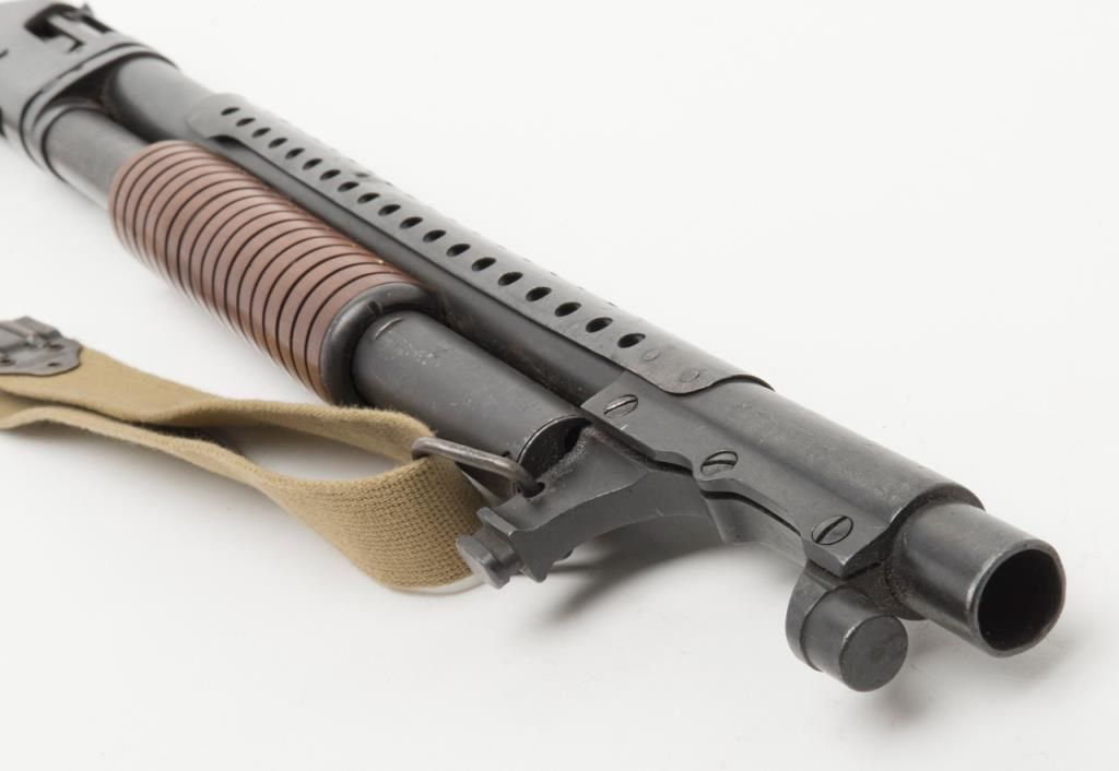 Winchester Model 1897 U.S. marked pump action Trench pump action takedown shotgun, 12 gauge, 2-3/4” chamber, CYL choke, 20” barrel, old re-blued finish, wood stocks, pat. marked ventilated hand guard on barrel with bayonet lug,woven sling, #940329 in overall used good condition showing the majority of an old re-blued finish, good bore, action and barrel markings including Winchester proof and ordinance flaming bomb proof on the top of the barrel at the breech; also “U.S.” stamped on the lower left side of the receiver; the butt stock shows wear with scattered mars and scratches, an old loss to the bottom toe, a replacement Winchester checkered hard rubber butt plate and a “W.B.” inspector’scartouche on the left side of the butt stock; the forend wood is in near fine condition and a replacement piece; the sling is in very good condition and is a “No Buck” brand with patent date of 7-21-14. Also included is a tan canvasmuzzle cover marked “US” and dated “1944”. (C&R/PPT). Est.: $1,000-$2,000.