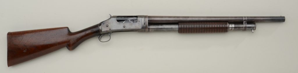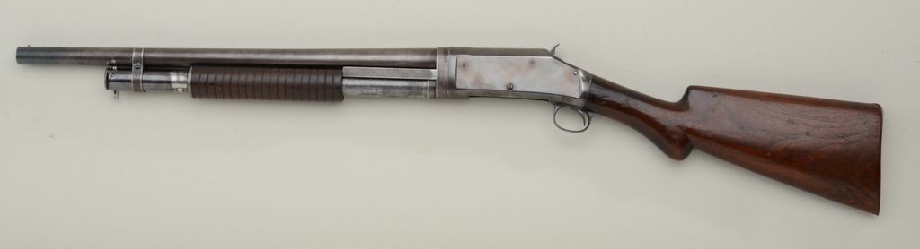 Winchester Model 1897 pump-action shotgun, 12 gauge, modified choke, takedown variation, barrel reduced to 20”, blue finish, wood stocks, #C 81069. This gun is in overall good condition showing a muted older re-finish to the receiver and brown patina to barrel assembly that is numbered 352482; good bore and action; stocks are overall good with an old repaired crack to the wrist of the butt stock with scattered mars and scratches fromcarry and storage; steel butt plate. Est.: $200-$400.