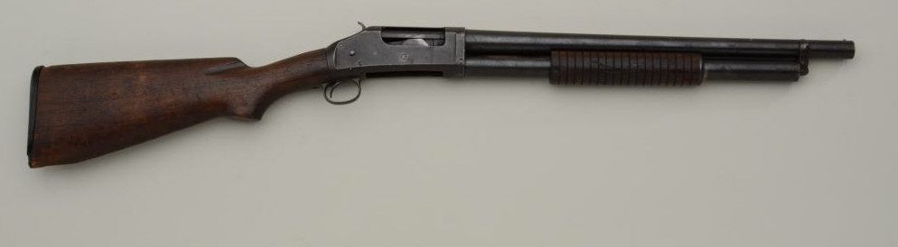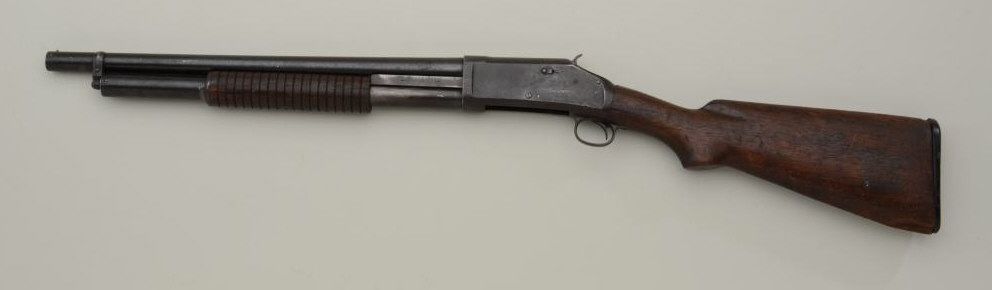 Winchester Model 1897 pump action shotgun with old shortened barrel to 19”marked on left side of frame in die stamps U S X 390700. USX stands for United States Express Company who operated as messengers,freighters and mail delivery around the like Wells Fargo. The Winchester is serial numbered 390700 and usually US Express marked their guns with factory serial number along with their marking. The metal surfacesshow a brown patina with 50% blue mixed in also some scattered rust and erosion. The stocks are fair to slightly rough with dings, mars, scratches and losses at the toe and butt plate which are what you would expectfrom a guard gun. The action is good and the bore is fair and the gun locks up tight but there are some bad cracks at the wrist. Consigned from a prominent western memorabilia collector. Est.: $750-$1500