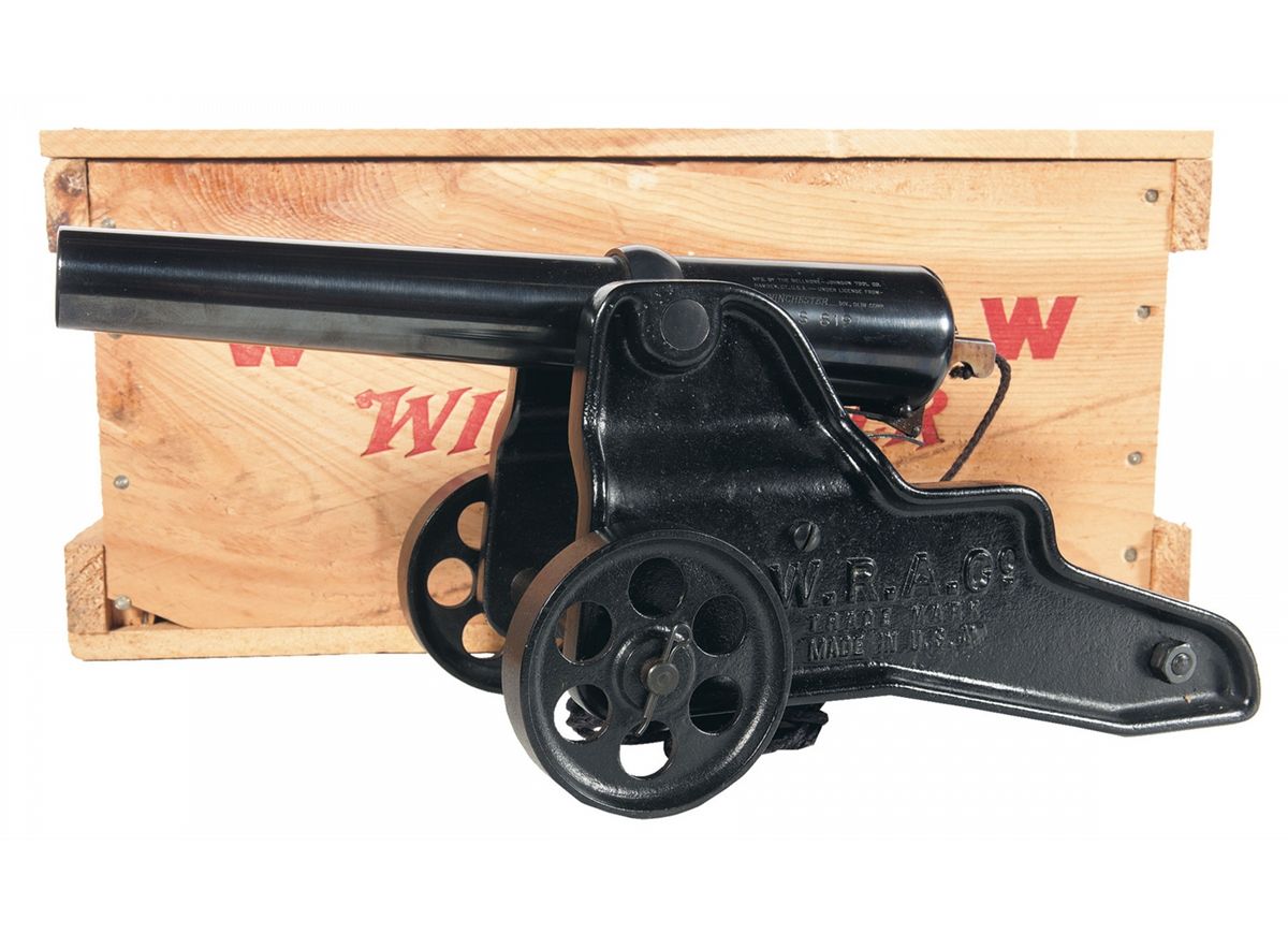All blue finish with the three-line W.R.A. Co./Made in U.S.A trademark information on the sides of the carriage, top of the cannon has caliber marking, with left side having the three line Bellmore-Johnson Tool Co. marking. Comes with Winchester crate.