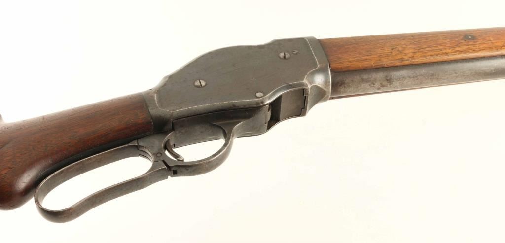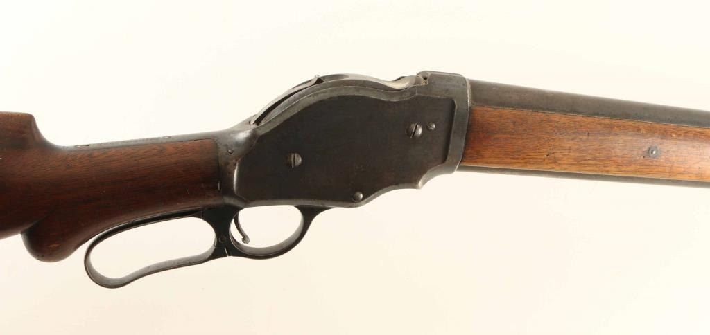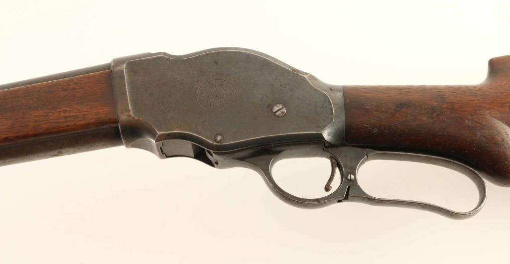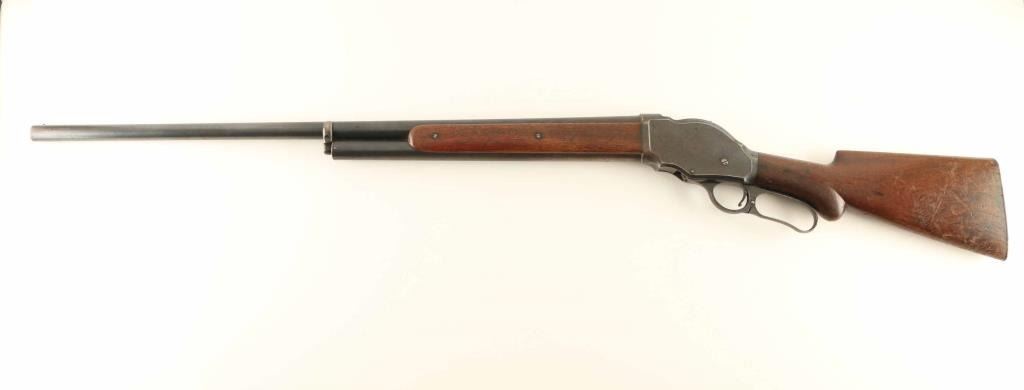Vintage lever action repeating shotgun chambered for smokeless 10 gauge shells, manufactured circa 1910. Features a blued finish, 32" full choke barrel, brass bead front sight, 'u' notched rear indexing point, 5 round tube magazine, smooth trigger, exposed hammer with knurled spur, curved two-piece finger lever, steel receiver with an intertwined WRA Co monogram, smooth two-piece walnut forend scales, and semi-pistol grip shoulder stock with knurled metal buttplate & 13 1/8" LOP. Shotgun exhibits approximately 60% of it's original blued finish showing typical wear patterns on the barrel, magazine tube, & finger lever, some scattered surface rust and a dew scrapes. Action is smooth, the bore has good lustre & shows scattered pitting, markings are clear, and the wood with many blemishes but no major defects. Condition is NRA Good ***C&R Firearm***