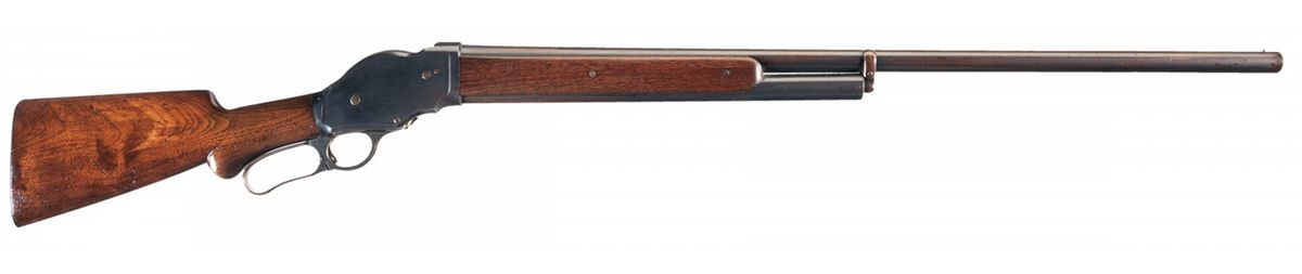 Manufactured in 1906 with a single brass bead sight, choked full and a 2 7/8 inch chamber. The top of the barrel is marked with the address and patent dates in two lines next to the model and gauge markings. The left side of the receiver has the "WRA" logo and the top tang is marked "WINCHESTER/TRADE MARK". Mounted with a smooth two piece walnut forearm and round knob pistol grip stock with checkered steel buttplate. Length of pull is 13 inches.