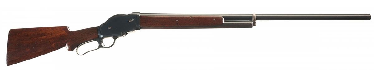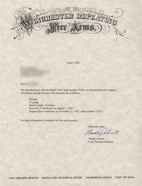Manufactured between 1901 and 1920 with a total production of approximately 65,000, the Model 1901 was a redesign of the Model 1887 shotgun and was offered in 10 gauge only. This shotgun was manufactured in 1905. The top of the barrel is marked with the two line address/patent dates followed by MODEL 1901 10 GA." and "FULL" on the left rear. The left side of the receiver is marked with the "WRACo" monogram, the upper tang is marked "WINCHESTER/TRADE MARK" and the serial number is on the bottom front of the receiver. Single brass bead sight, 2 7/8 inch chamber and mounted with a smooth walnut forearm and round knob pistol grip stock with checkered steel buttplate. Length of pull is 13 inches. The accompanying factory letter verifies the gauge, 32 inch barrel length, that it was received in the warehouse on August 1, 1905 and shipped to order number 132557 on November 23, 1907.