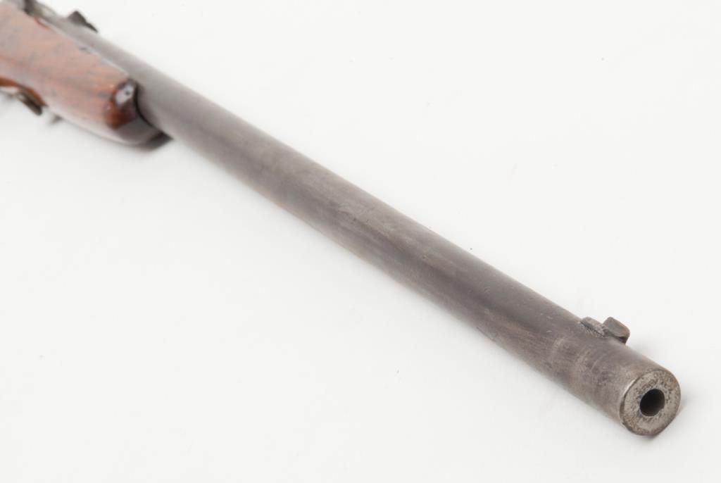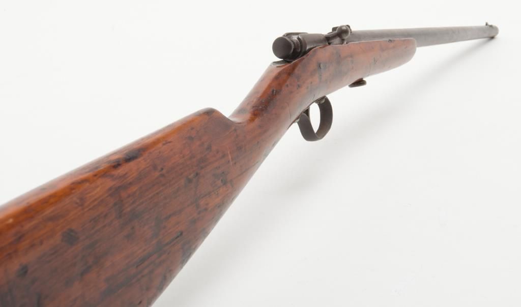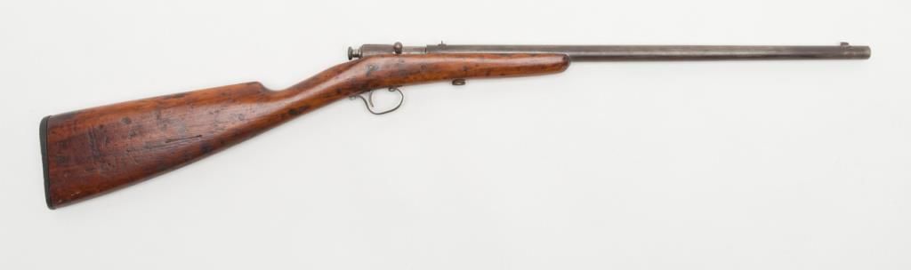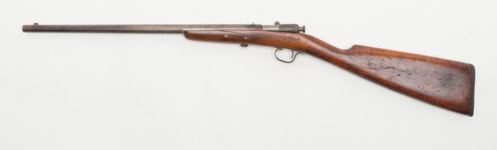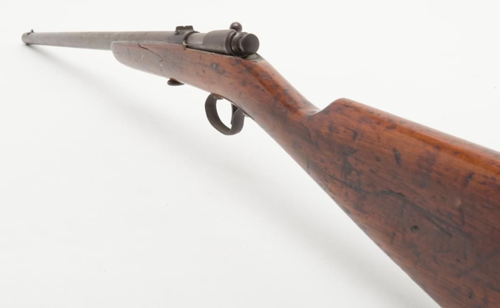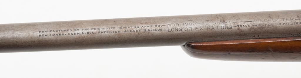 Winchester Model 1902 bolt action single shot rifle, .22 short, long or extra long cal., 18” round barrel, wood half stock, #NVSN in overall fair + condition showing a brown patina to metal surfaces, good action, rough bore, fair stock that has been re-finished with scattered old mars and scratches from carry and storage. (C&R). Est.: $75-$100.