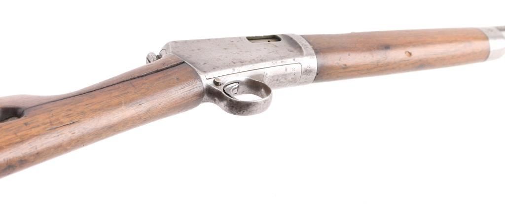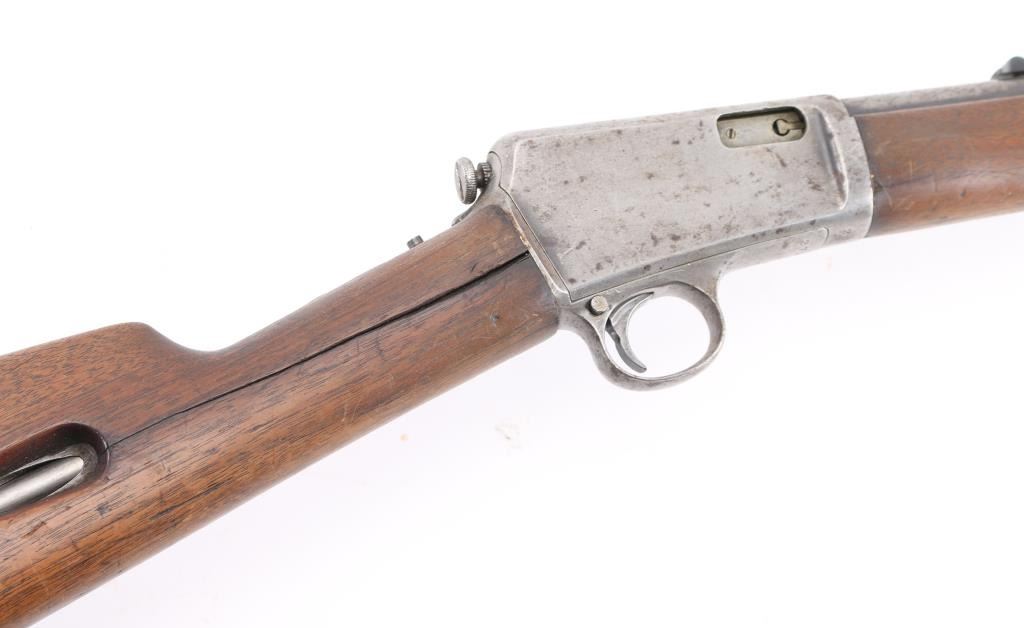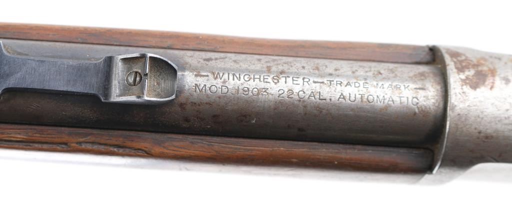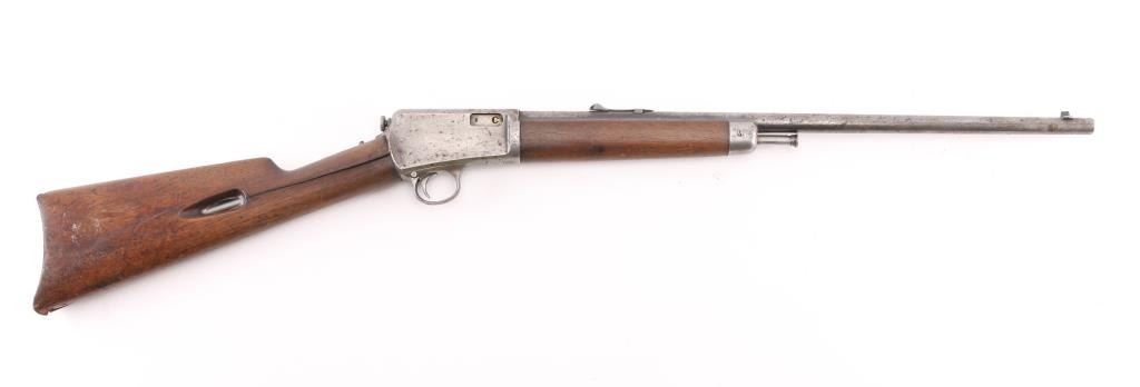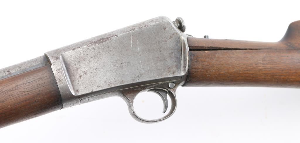 Vintage semiautomatic rimfire rifle manufactured circa 1904. Features 20" barrel, blade/bead front & adjustable rear sights ( rear sight is bright blue, appears to be a newer replacement), pushbutton safety, tube magazine in butt stock, semi crescent butt plate, takedown screw at receiver rear. Charging handle in forearm. Bore is good condition, mostly bright. Blued finish gone, mostly in the white, with scattered pin-prick pitting. Numbers match on receiver and extension. Forearm is in good condition. Buttstock is poor with 5/6" cracks on each side of the stock below the tang NRA Condition- Fair. C&R Firearm.