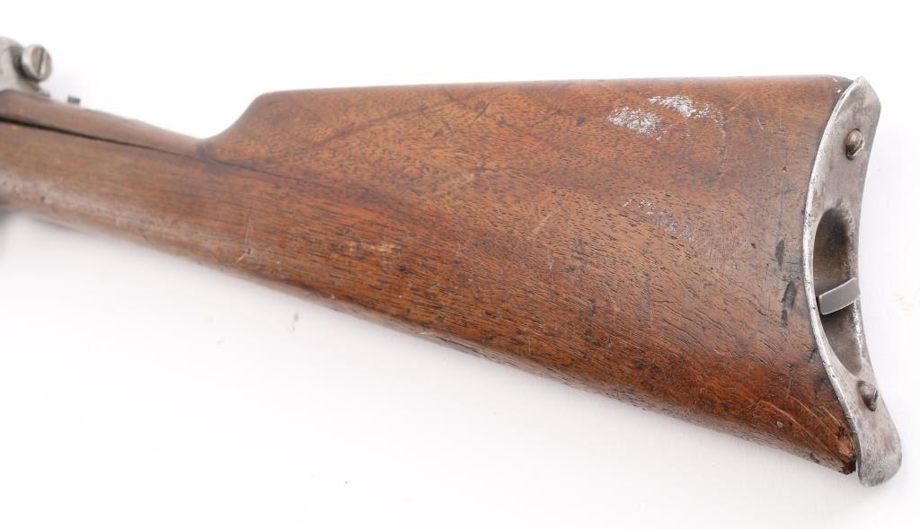 GOOD: Some minor replacement parts; metal smoothly rusted or lightly pitted in places, cleaned or re-blued; principal letters, numerals and design on metal legible; wood refinished, scratched bruised or minor cracks repaired; in good working order.