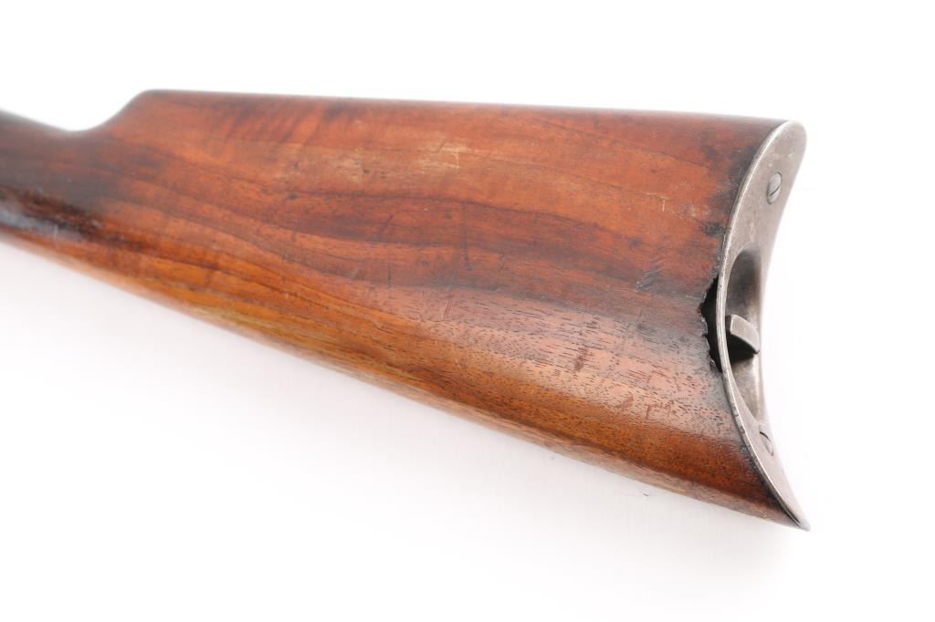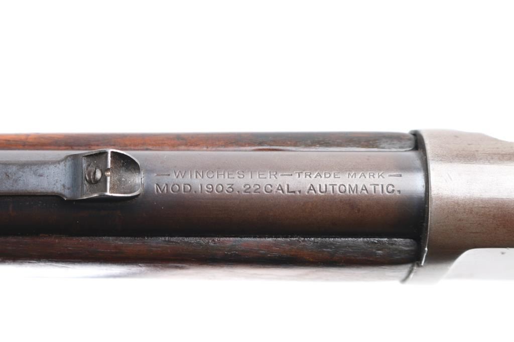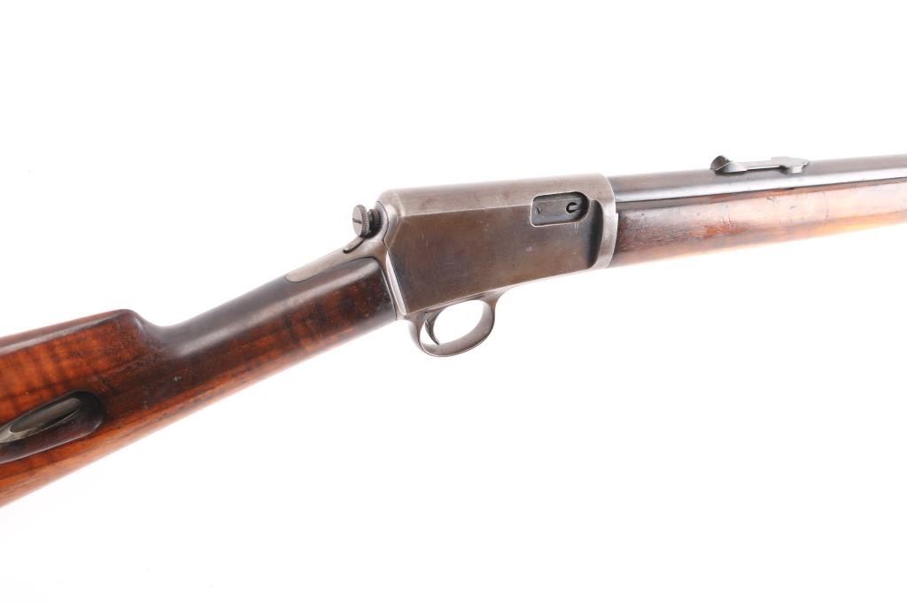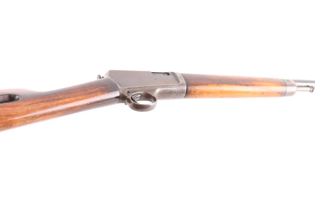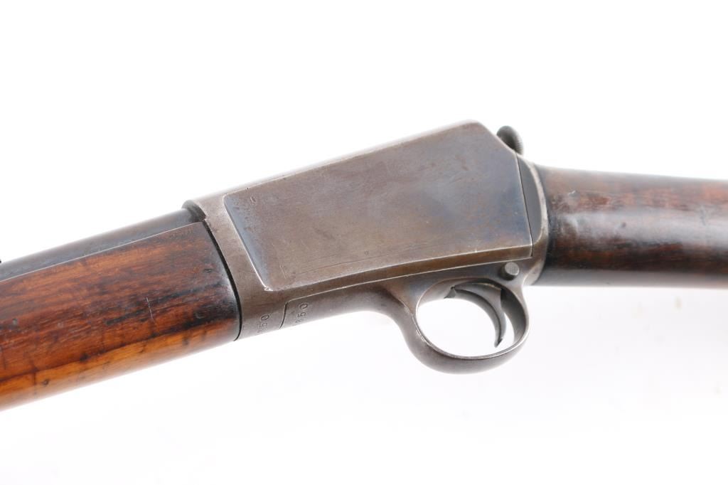 Note* Parts/Repair Gun. Vintage semiautomatic rimfire rifle manufactured circa 1906. Features 20" barrel, blade/bead front & adjustable rear sporting sights, pushbutton safety, tube magazine in butt stock, semi crescent butt plate, takedown screw at receiver rear. Charging handle in forearm. Bore is has a budge in the barrel about 5" from the muzzle. Blued finish is about 60% with handling/edge wear, dulled somewhat with minor scratches, receiver is turning a brown patina with areas of light pitting. Numbers match on receiver and trigger housing. Wood is very good condition with some scratches.