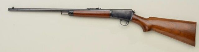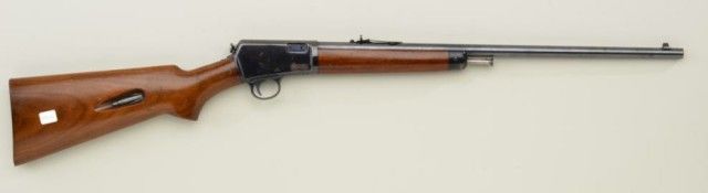 Winchester Model 1903, 22 automatic caliber rifle, serial #95266 with 20" barrel. The rifle retains 90-95% original blue on barrel, with some staining and minor beginning age. The frame shows 85-95% original blue withsome flaking and beginning age where blue has drifted. The stocks are very good plus with minor scratches, small dings, mars. About 80-90% varnish remains. The action is good, bore is bright and we would rate it at an 8on 1-10 scale. Robert E. Petersen collection. Est.; $400-$800.