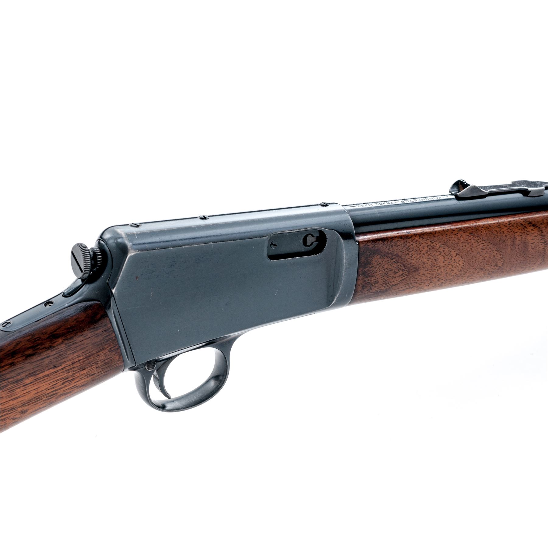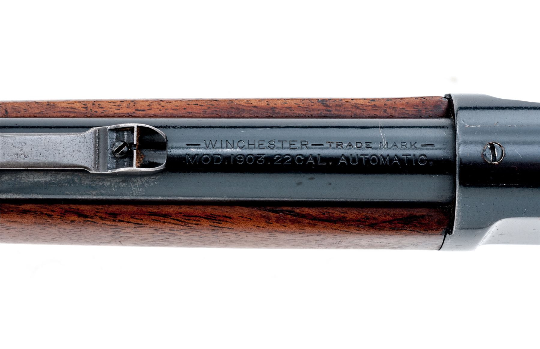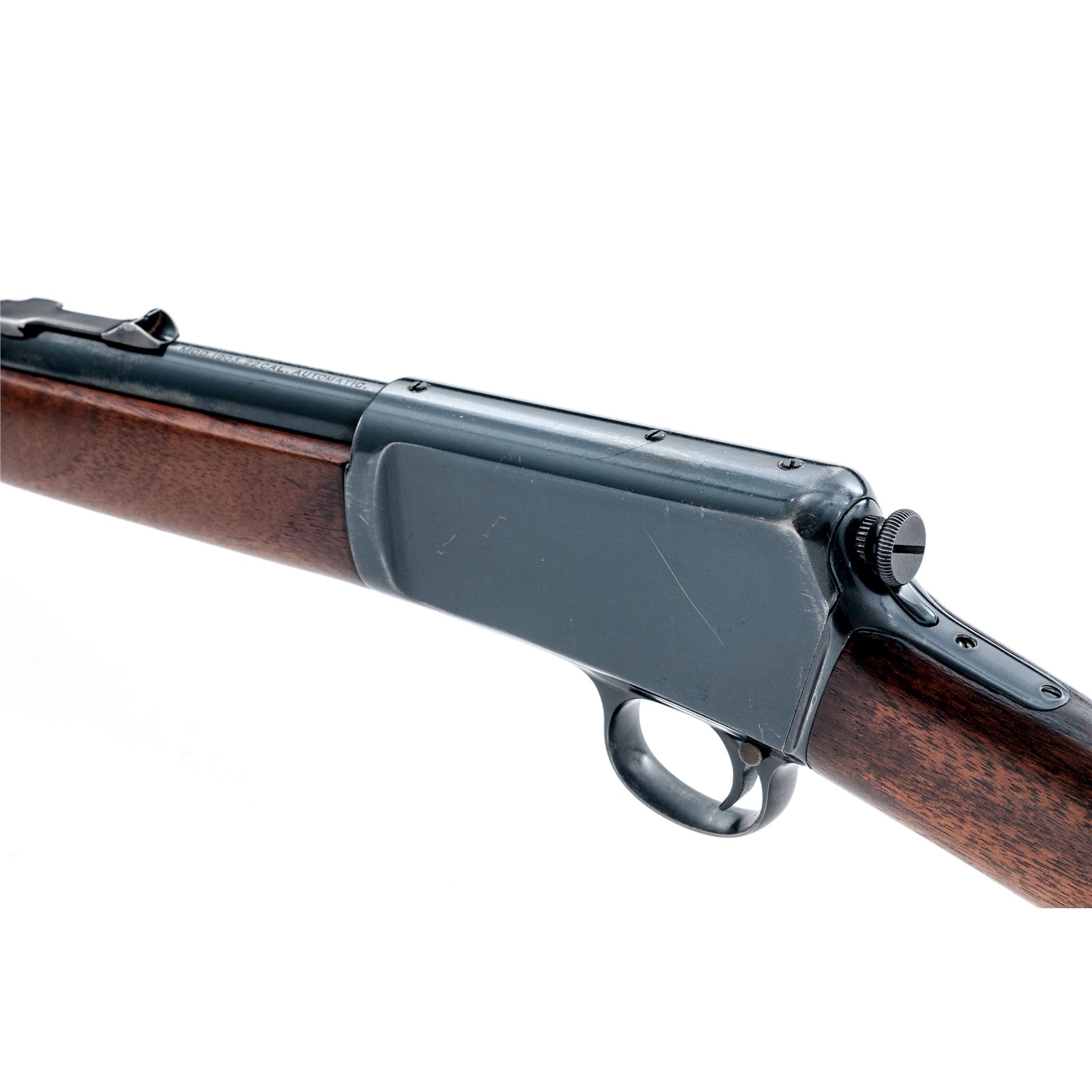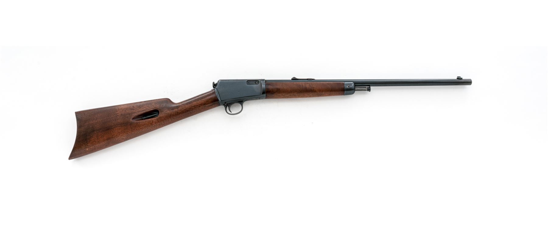Winchester Model 1903 Semi-Automatic Carbine, #34903, .22 Win. Auto cal., 20'' barrel, blue finish, walnut stock and forend. Mfg'd 1907. Condition is very good as refinished, retaining approx. 94% blue, with three additional holes drilled and tapped into top of receiver. Stocks have been nicely refinished showing approx. 60% of the later-added varnish. Good action and bore. Est.: $300-$500. (C&R)