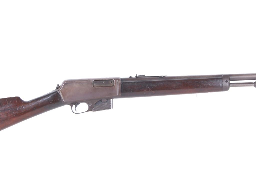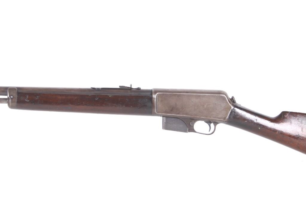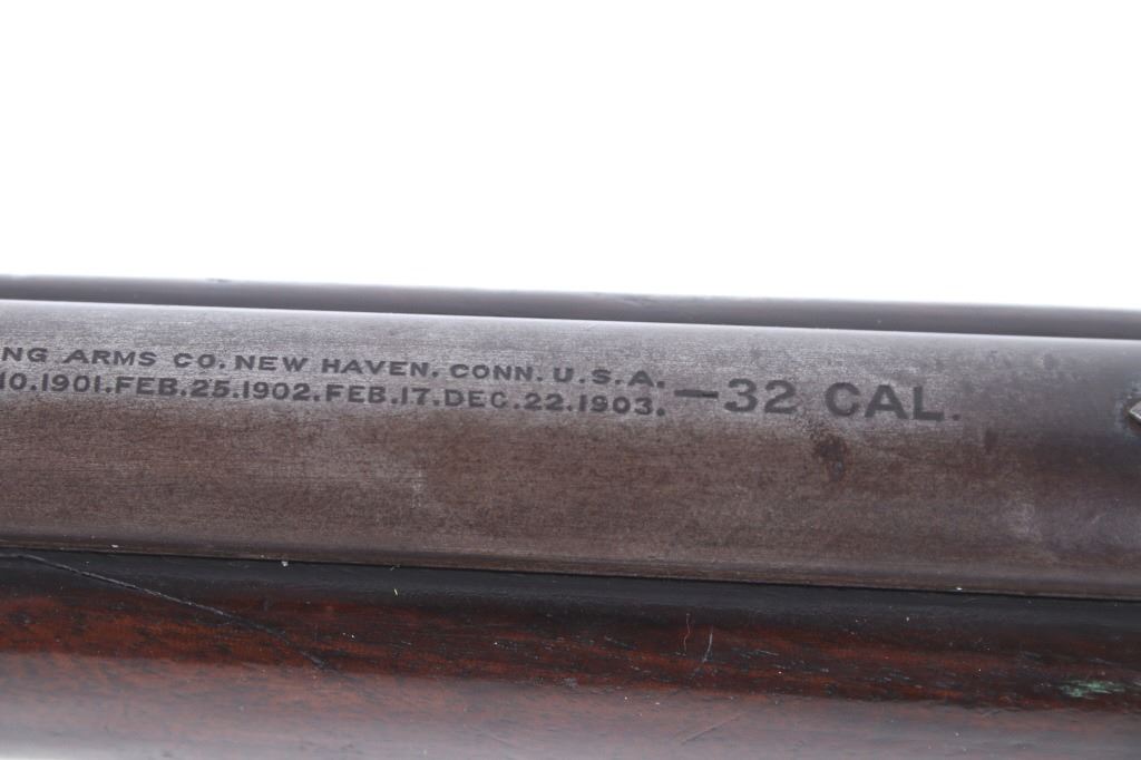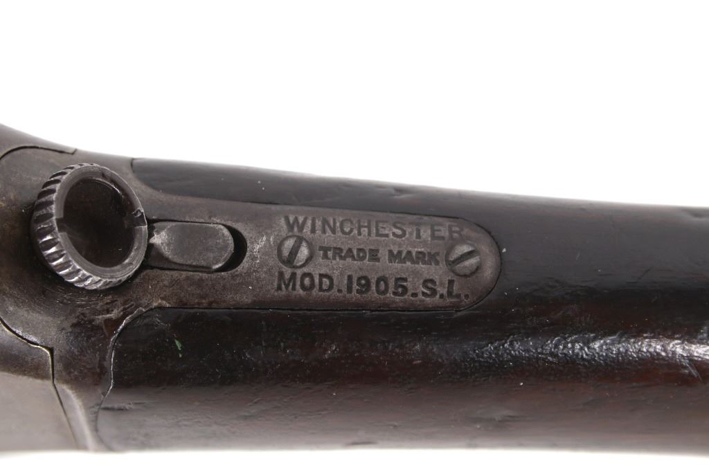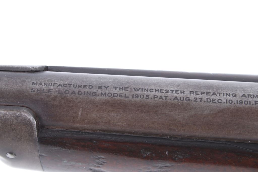 For your consideration is a Winchester Model 1905 .32 caliber semi-automatic rifle. This rifle utilizes a 22" round blue'd barrel with dovetailed blade front sight and adjustable rear elevation sight. The barrel is marked "Manufactured by The Winchester Repeating Arms Co. New Haven Conn. U.S.A. Self Loading Model 1905 Pat. Aug. 27. Dec. 10. 1901. Feb. 25. 1902. Feb. 17. Dec. 22. 1903. - 32 Cal." The straight grain hardwood stock and fore grip is in good condition showing minor loss to finish associated with use. Manufacture date of 1906. Serial Number: 18139. This firearm qualifies as a Curio & Relic Long Gun, and requires FFL Transfer or NICS Background Check.