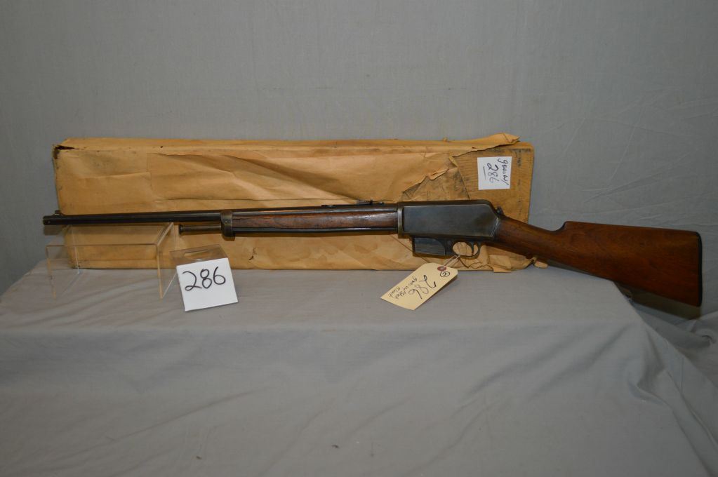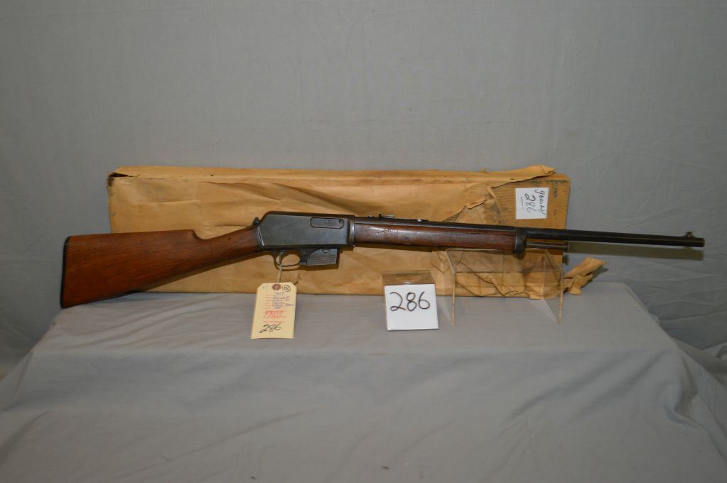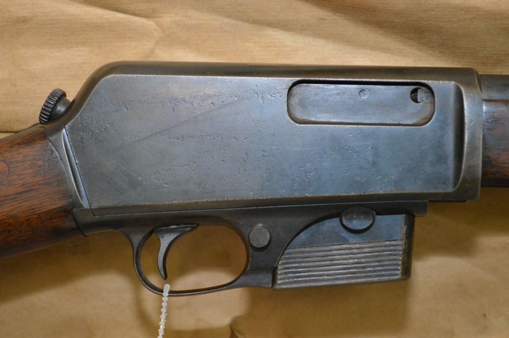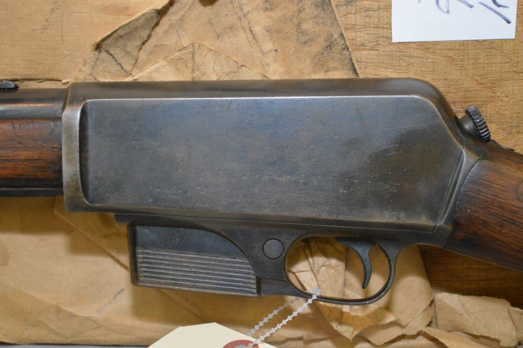 Winchester Model 1905 SL .35 SL cal Mag Fed Semi Auto Rifle w/ 22" bbl [ fading blue finish, barrel sights, stock repaired thru wrist, tapped hole thru upper tang, note; crack & broken forewood, c/w stock blank to repair the forewood, note : low serial number Early First Year of Production 1905 ] Ser # 908