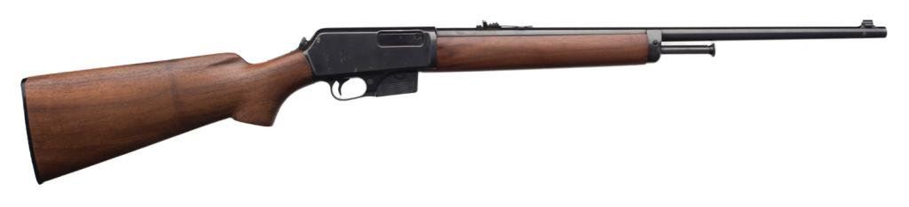 *Winchester Model 1905 Self Loader semi-automatic rifle, .351 Winchester cal., serial #12046. The rifle is overall very good condition with a 22” blued barrel. The barrel and receiver retain the majority of an old, quality re-blue with flaking and loss of finish on the receiver and at the muzzle. The smooth wood stocks are in overall very good condition showing only minor handling marks. The black plastic Winchester butt plate is a replacement and does not fit correctly. The rifle comes with one magazine. The bore is good, the action functions and the markings are sharp on this rifle. Est.: $300-$600.