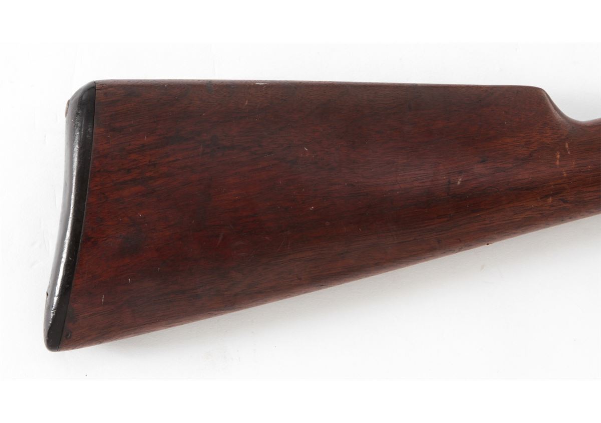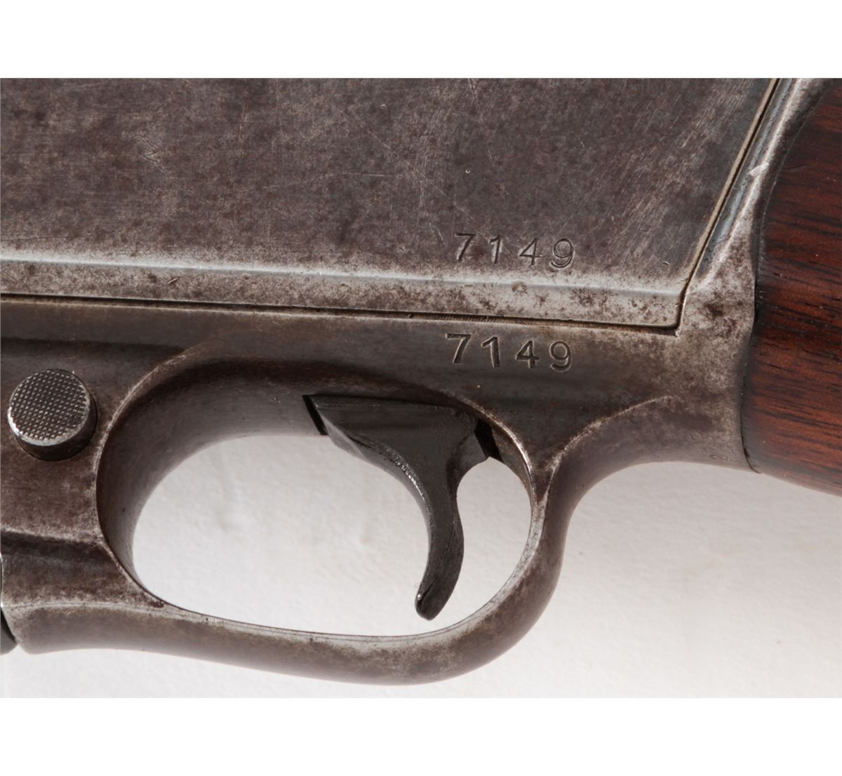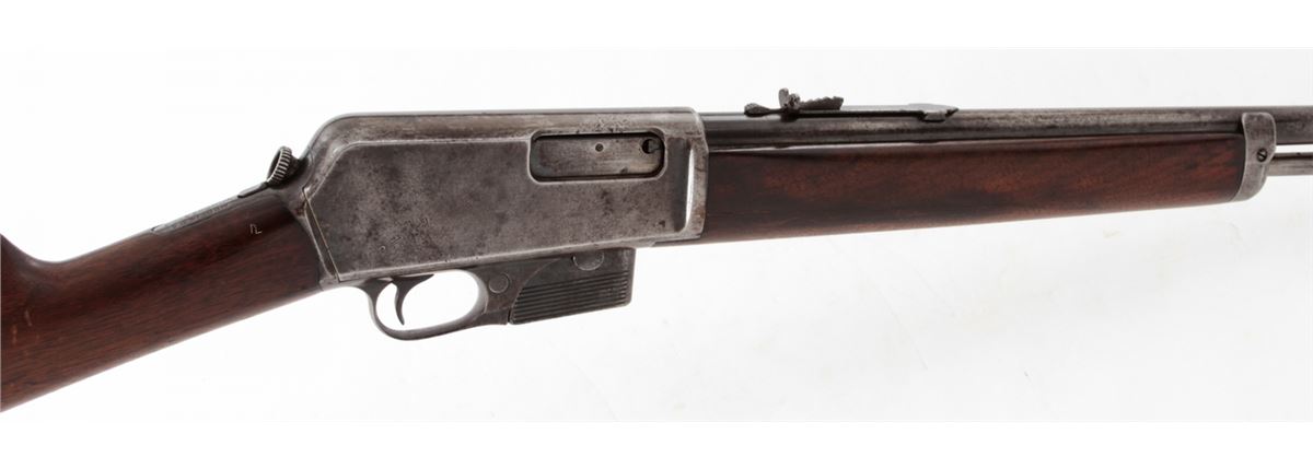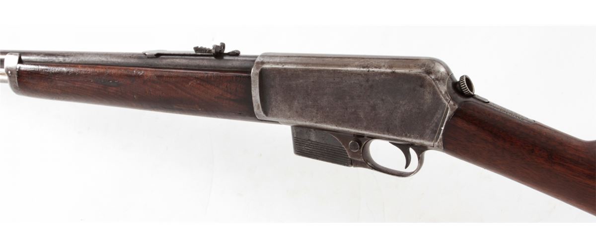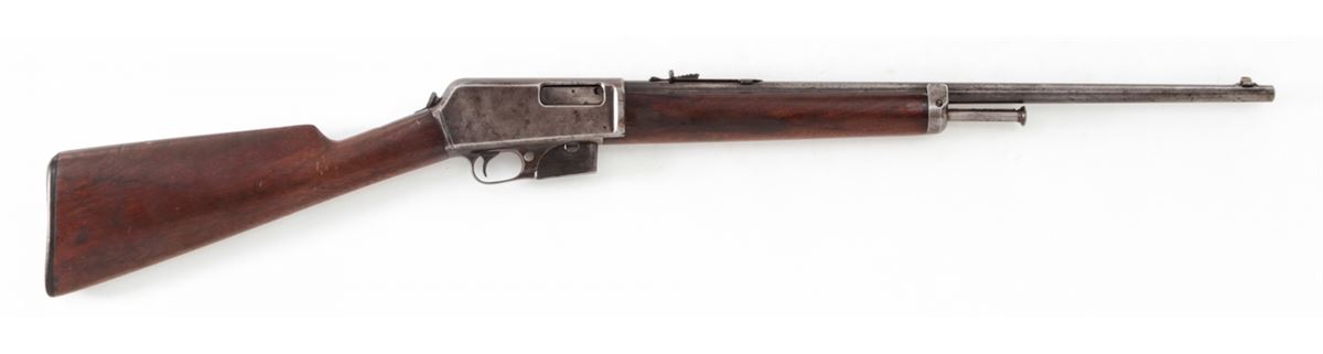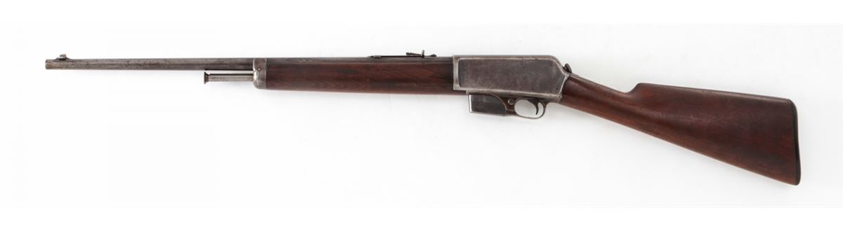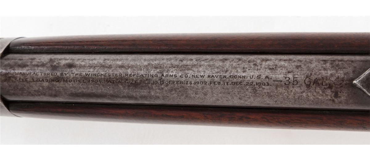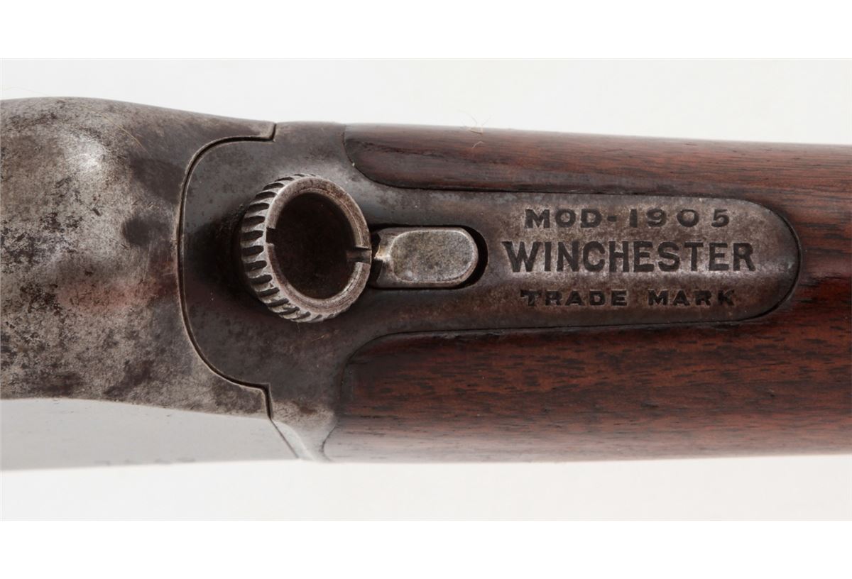 Winchester Model 1905 Self-Loading Rifle, #7149, .35 SL cal., 22'' barrel, blue finish, walnut stock, with one factory magazine. Mfg'd 1905. Condition is very good retaining approx. 50% original blue having thinned and toned considerably. Buttstock with moderate scuffs and pressure dings. Forend with repaired cracks and losses. Good action, fair to good bore. Est.: $250-$450. (C&R)
