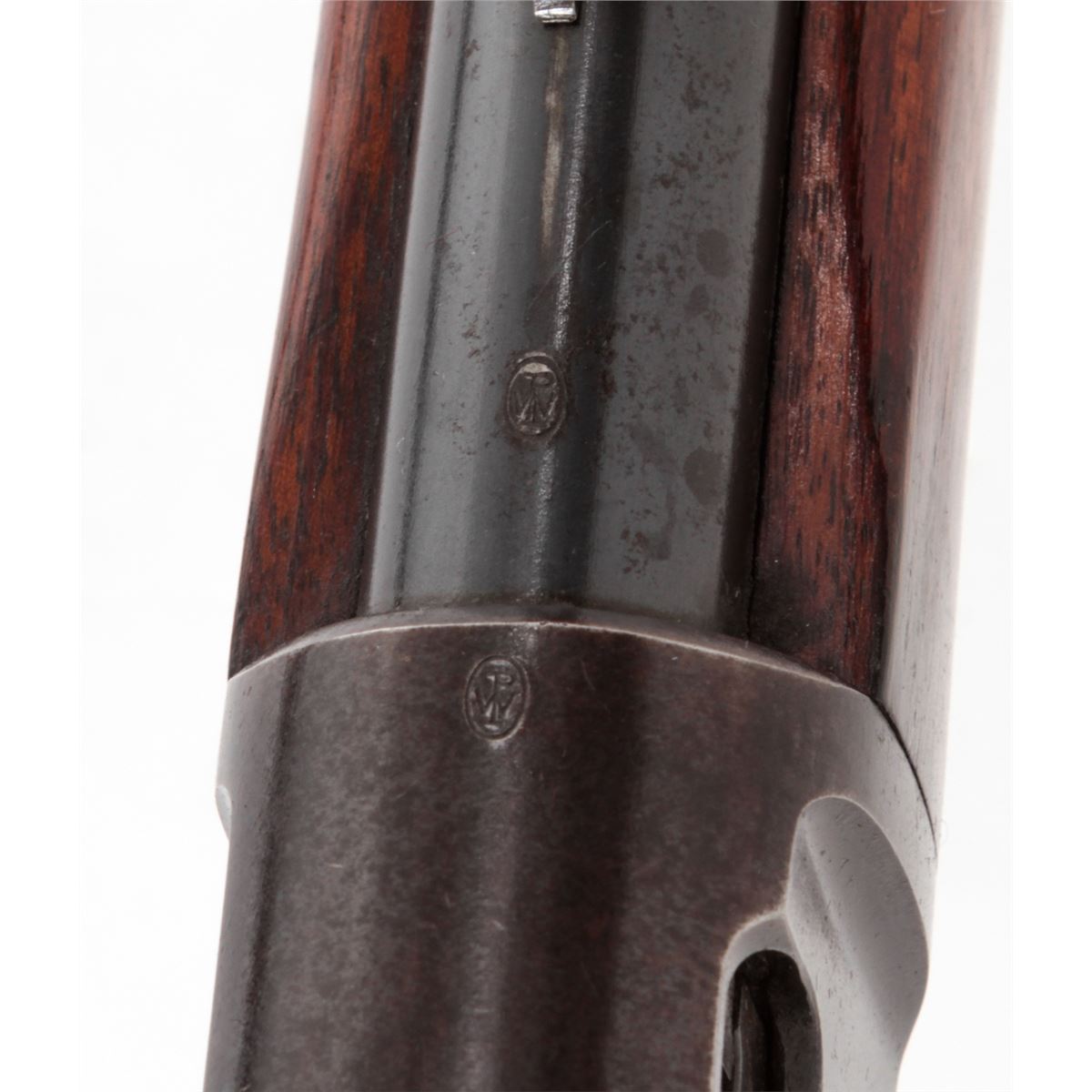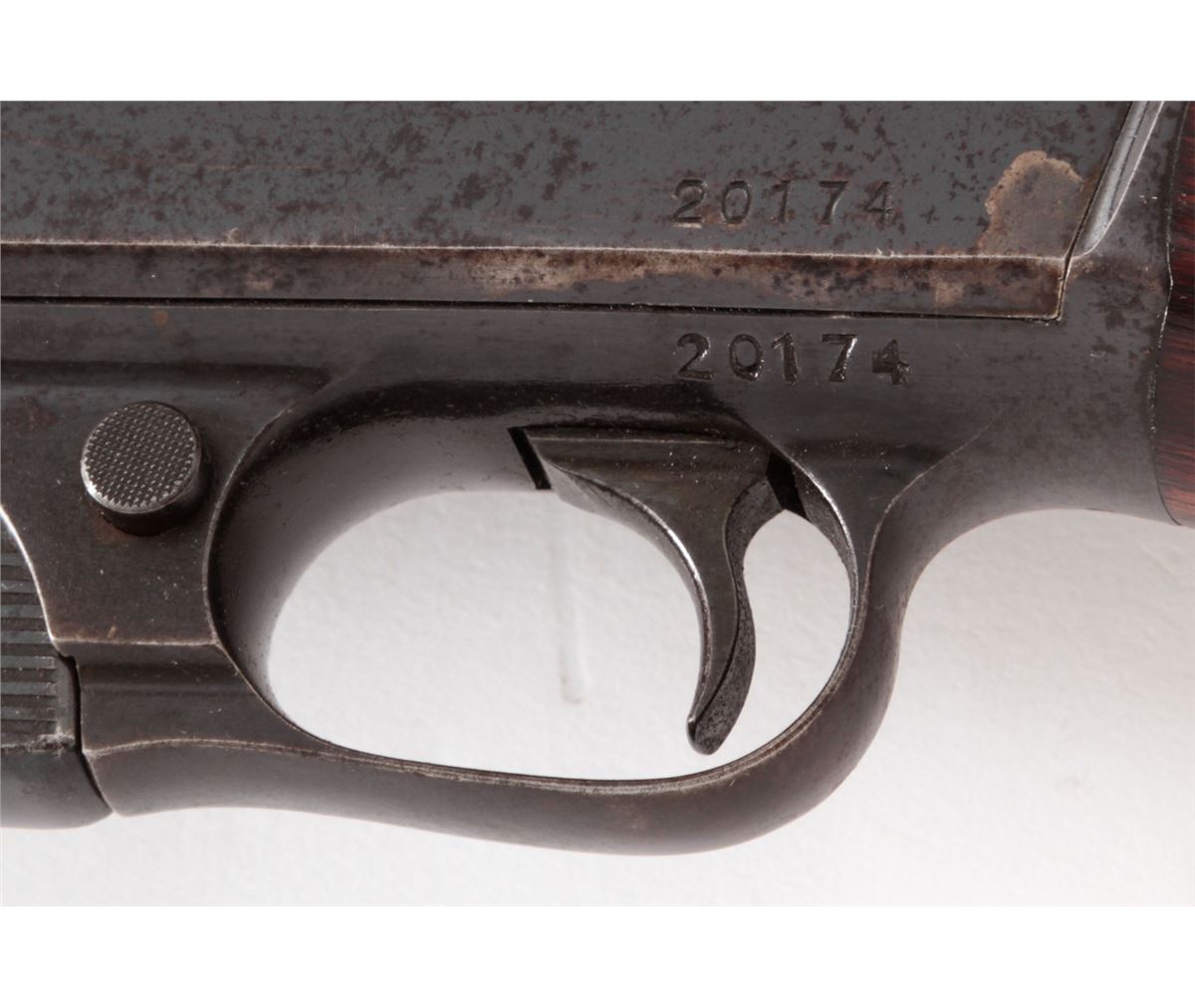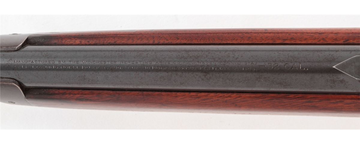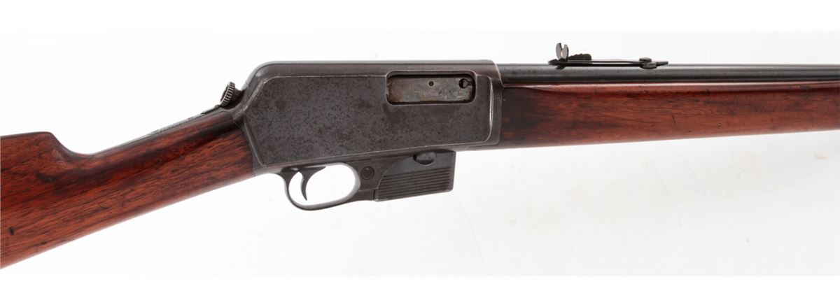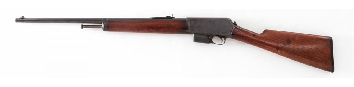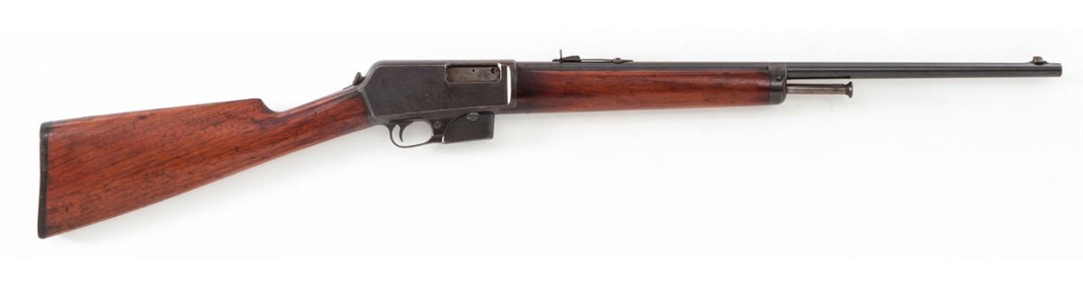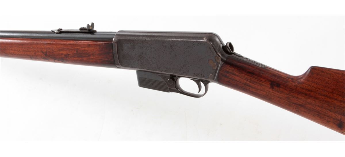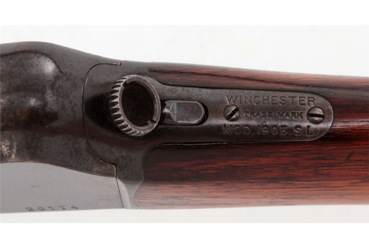 Winchester Model 1905 Self-Loading Rifle, #20174, .32 SL cal., 22'' barrel, blue finish, walnut stock and forend, with one factory five-round magazine. Mfg'd 1907. Condition is very good to near fine retaining approx. 85% thinning and toning blue. Stock with moderate scuffs and scratches and oil darkening near metal surfaces. Action is good, bore is at least very good with minor frosting in the grooves. Est.: $450-$600. (C&R)