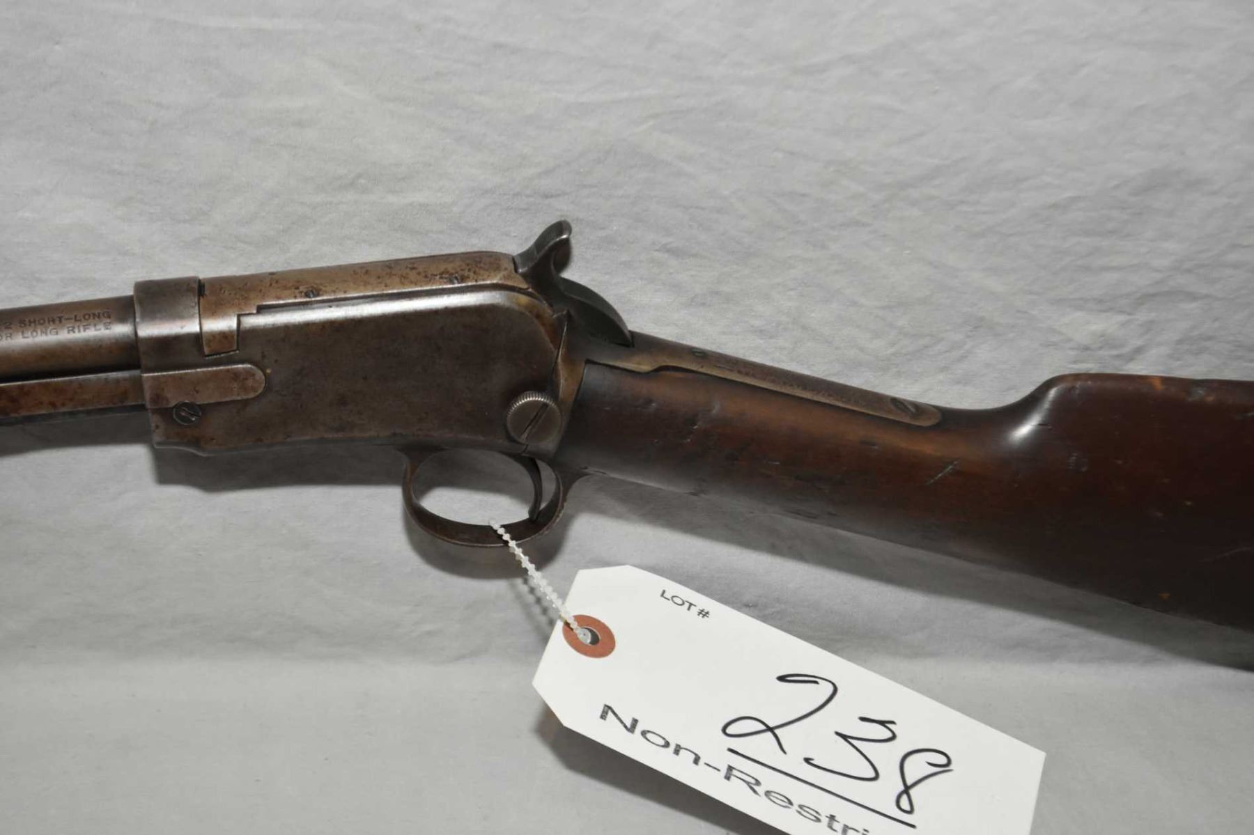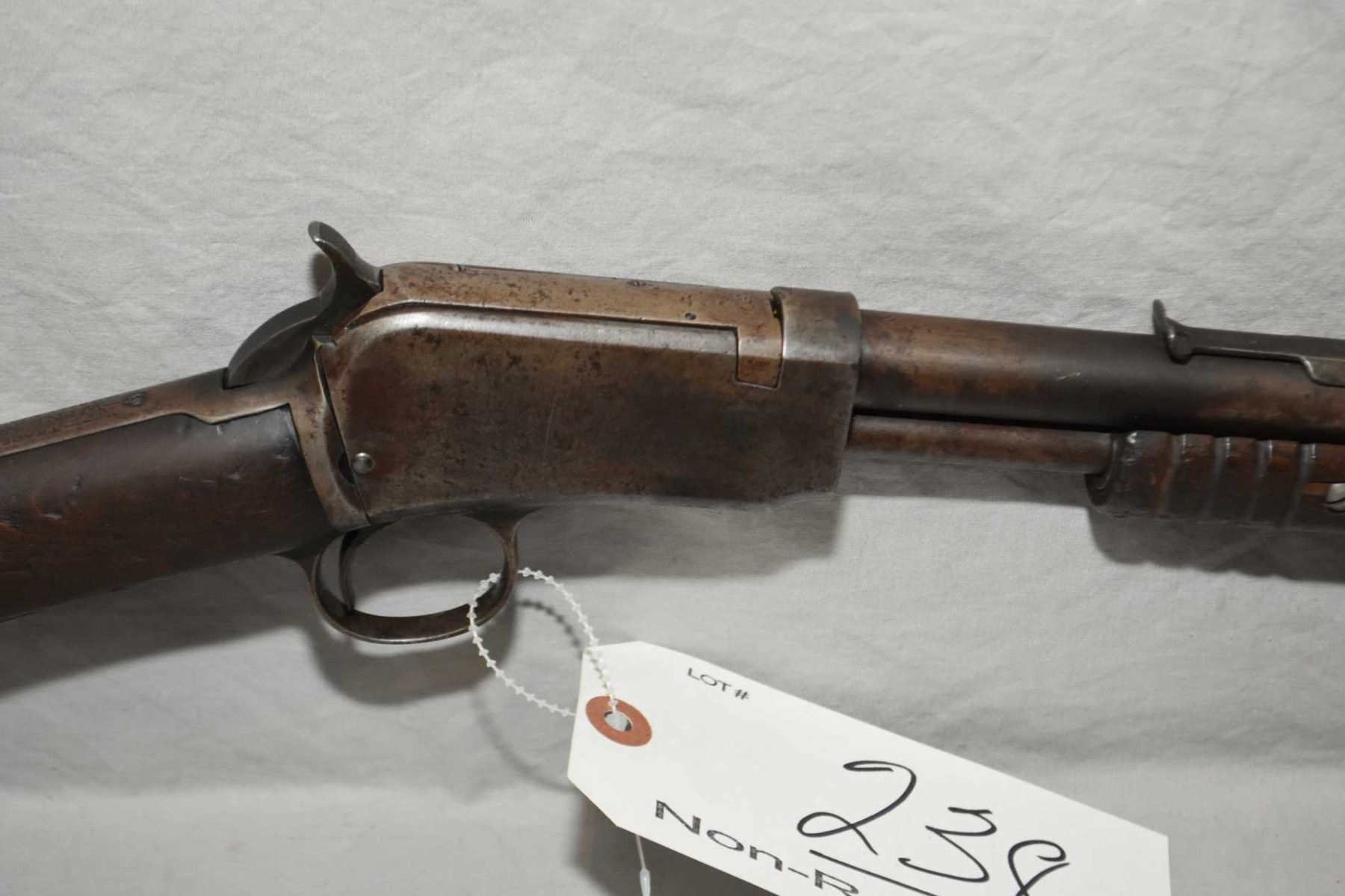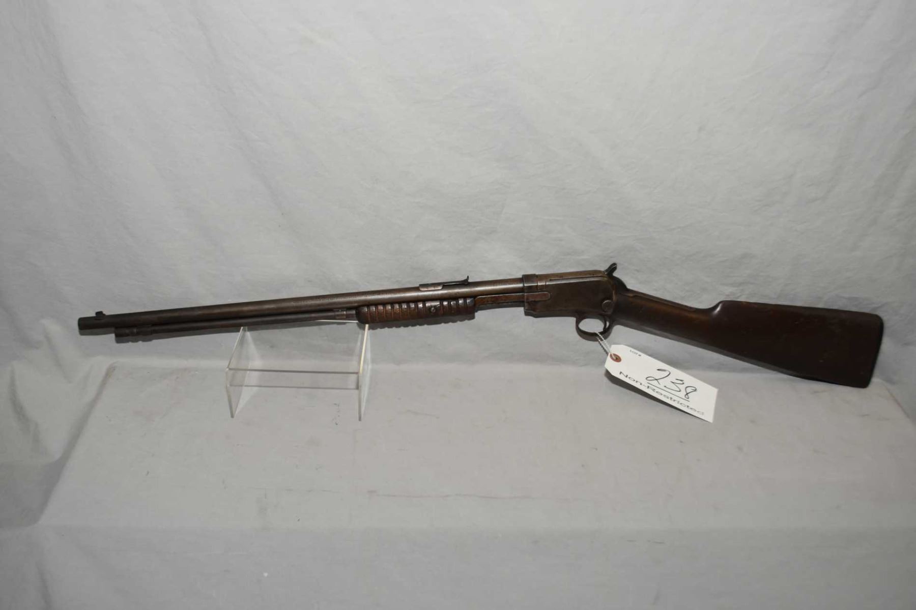 Winchester Model 1906 .22 LR Cal Tube Fed Pump Action w/ 20" round bbl [ patchy blue finish turning brown, some marks and scratches, mottled looking finish, old worn and beaten wood with marks and gouges, old Winchester butt plate, Definately used as a tool, but still functions well ! Circa 1916 ] Ser # 456237