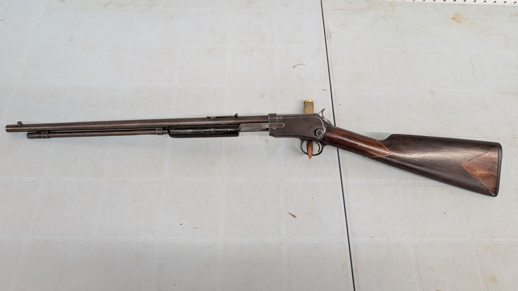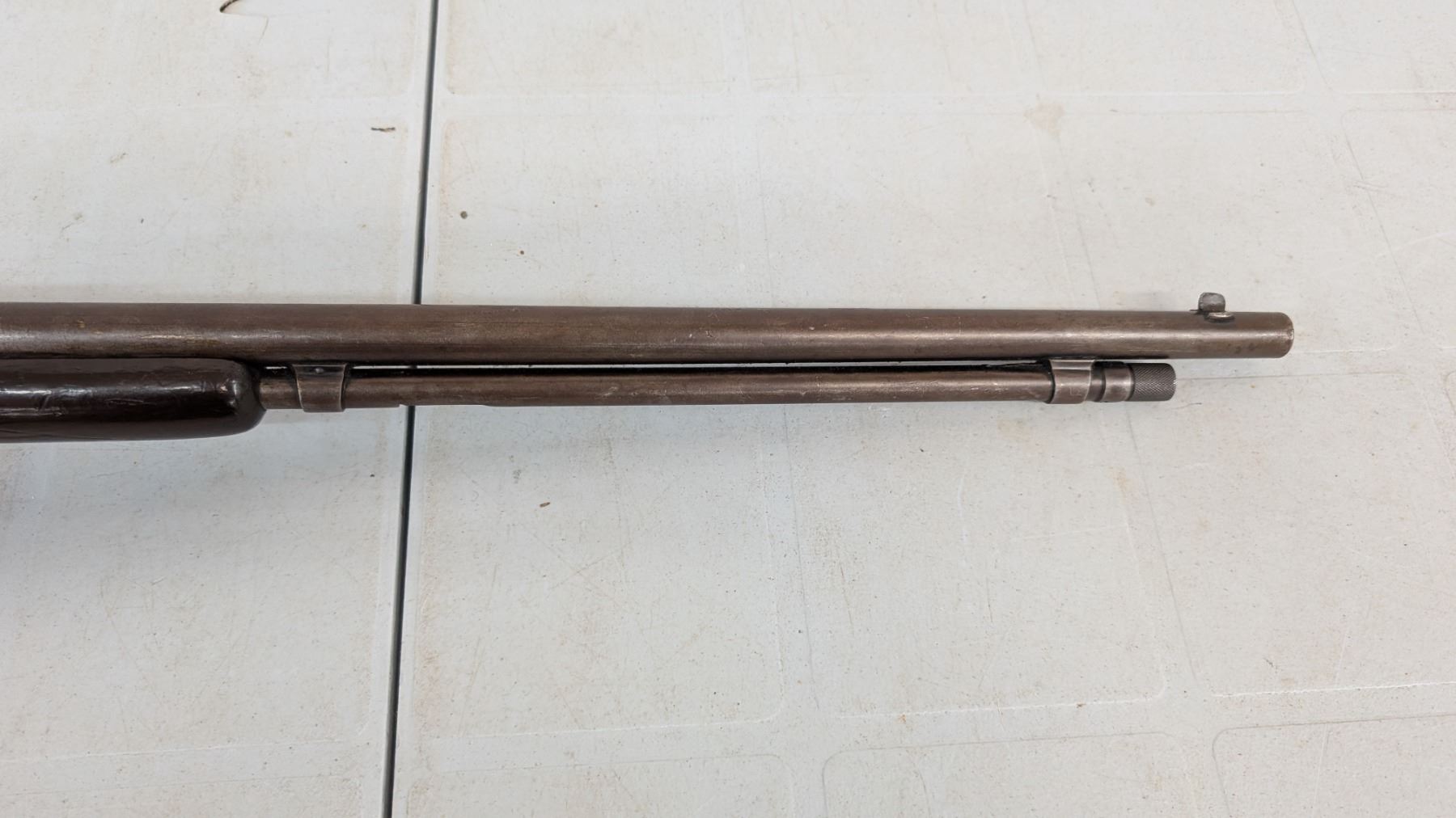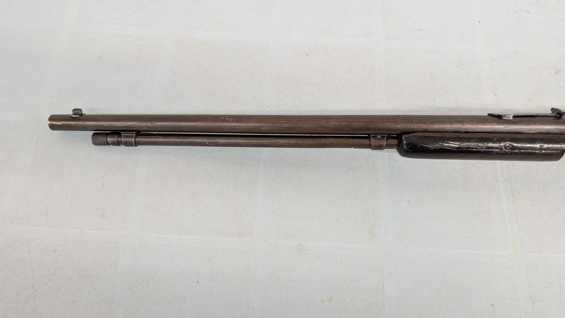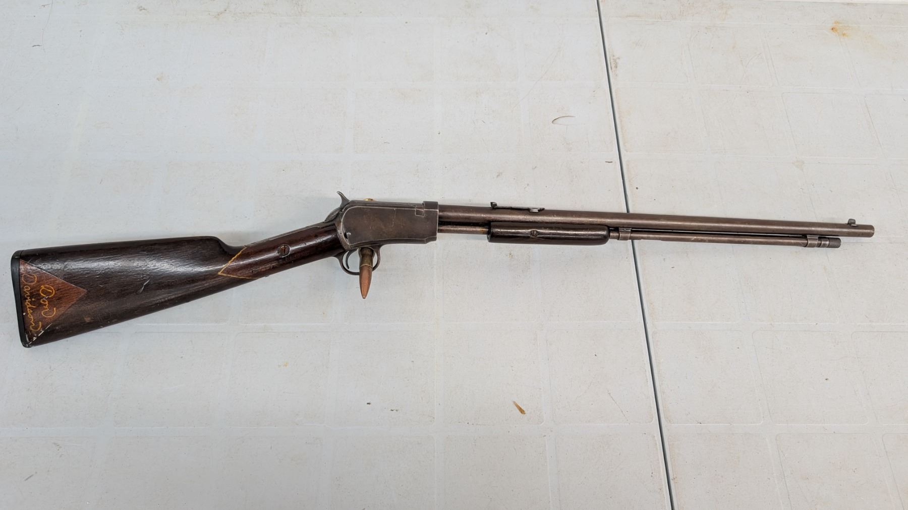 Pump Action,Bore is excellent, shiny with lots of soft riffling. Retains very little of original finish, turning to plum. stock in excellent condition, rear stock has been personalized.