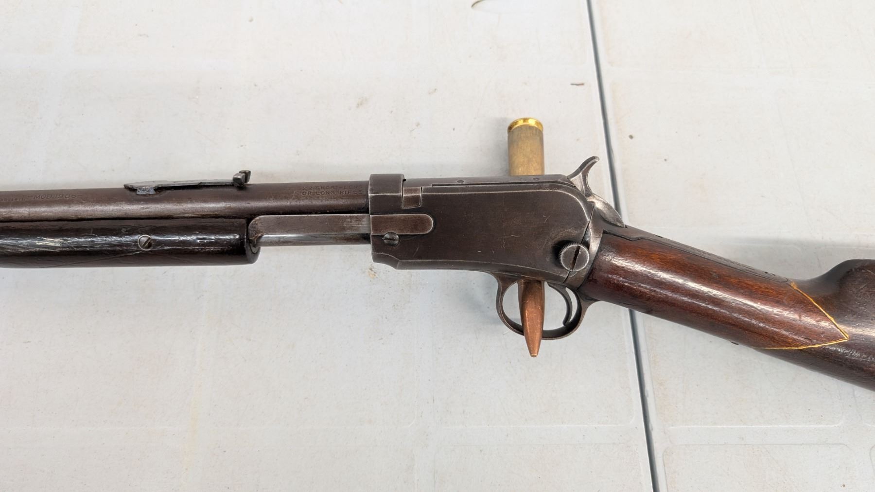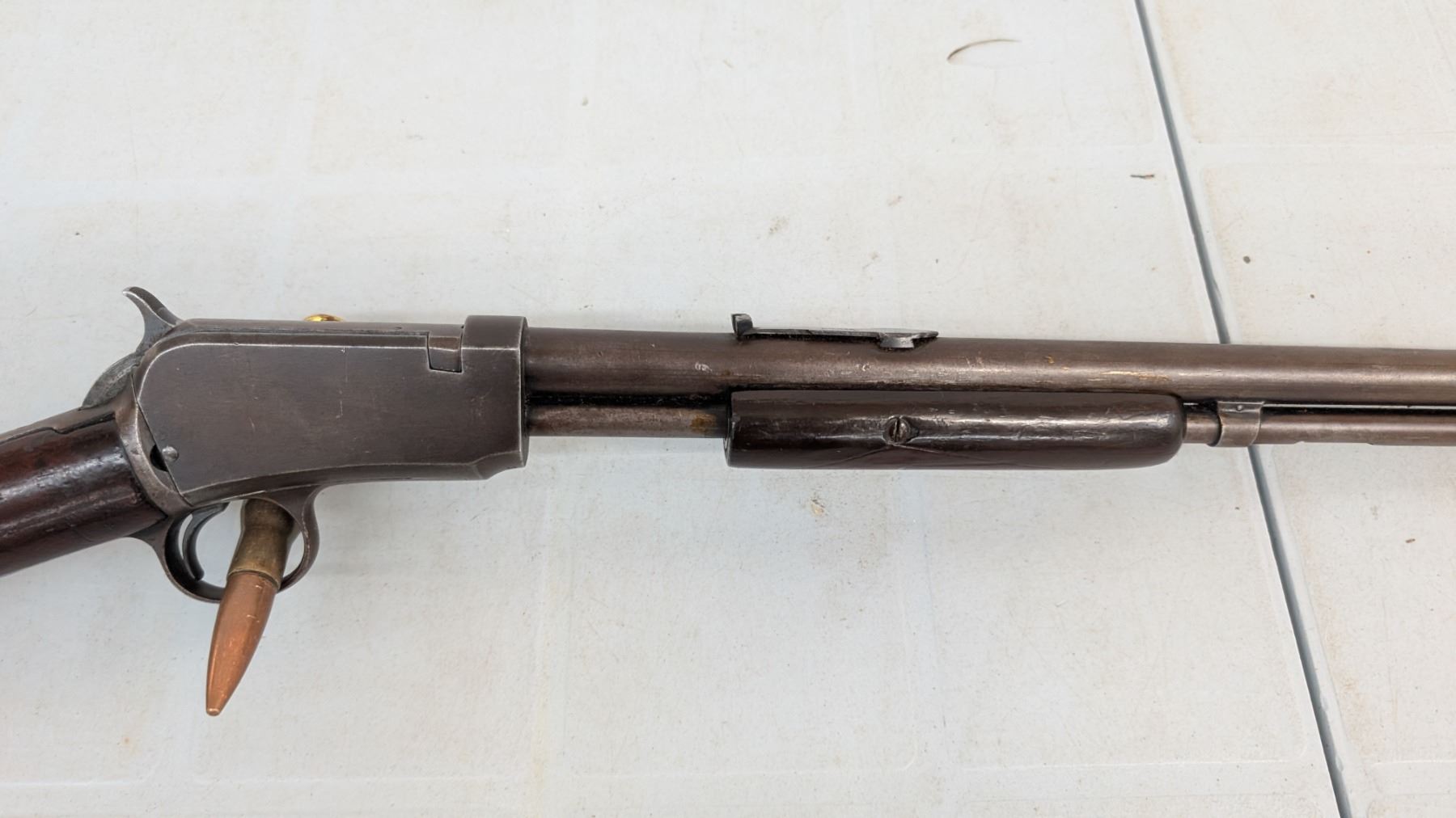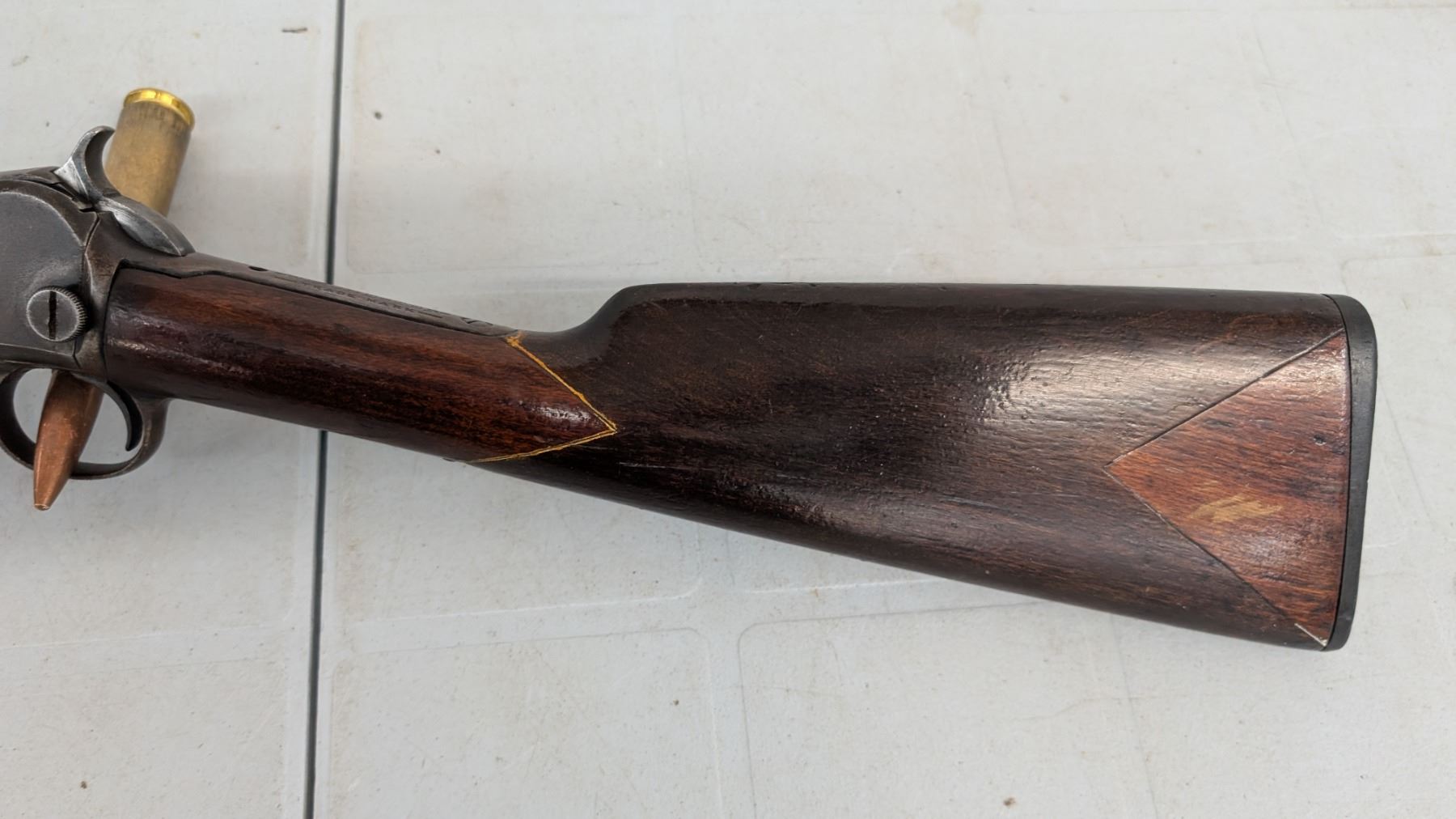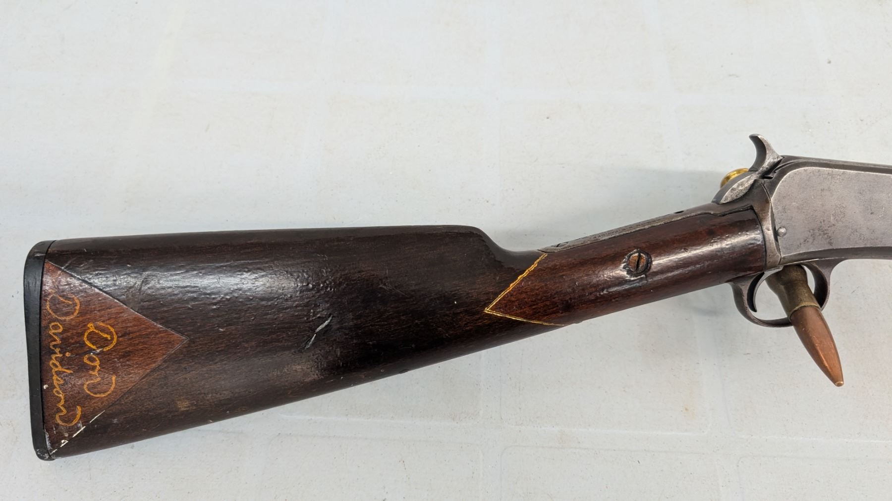 Pump Action,Bore is excellent, shiny with lots of soft riffling. Retains very little of original finish, turning to plum. stock in excellent condition, rear stock has been personalized.
