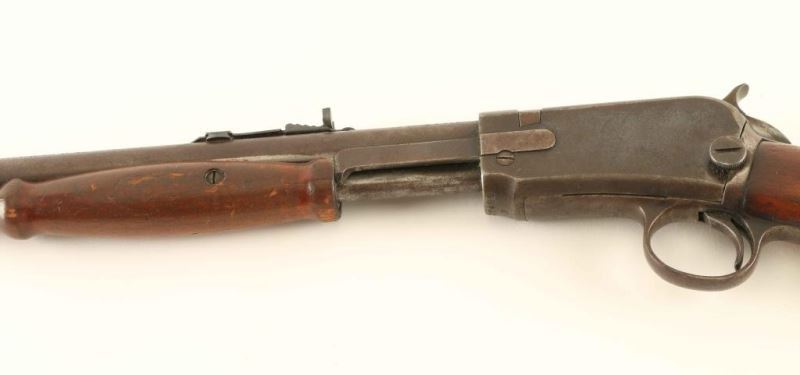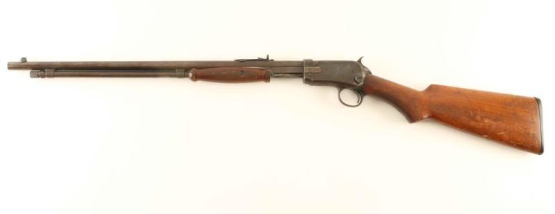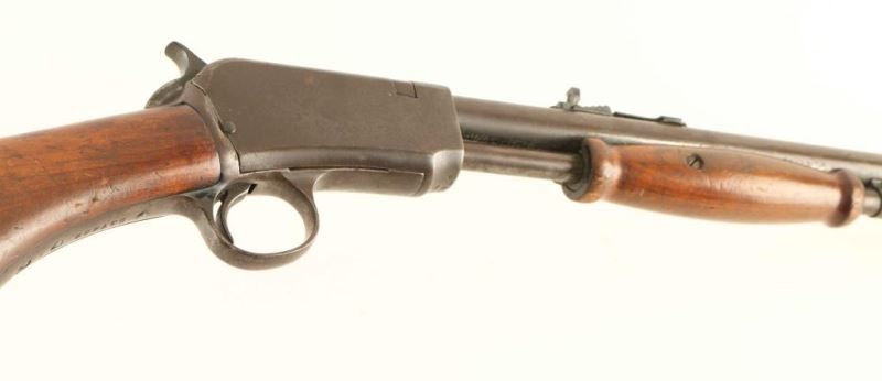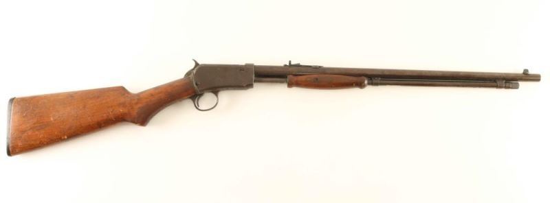 Pump action 22 S/L/LR with a 20" barrel and a blued finish with a 10Rd tube magazine. Barrel exhibits 30% of its original finish. Bore is dark. Scattered pitting on receiver and magazine tube. Hardwood stock with scattered gouges and scratches. NRA Fair ***Modern Firearm***