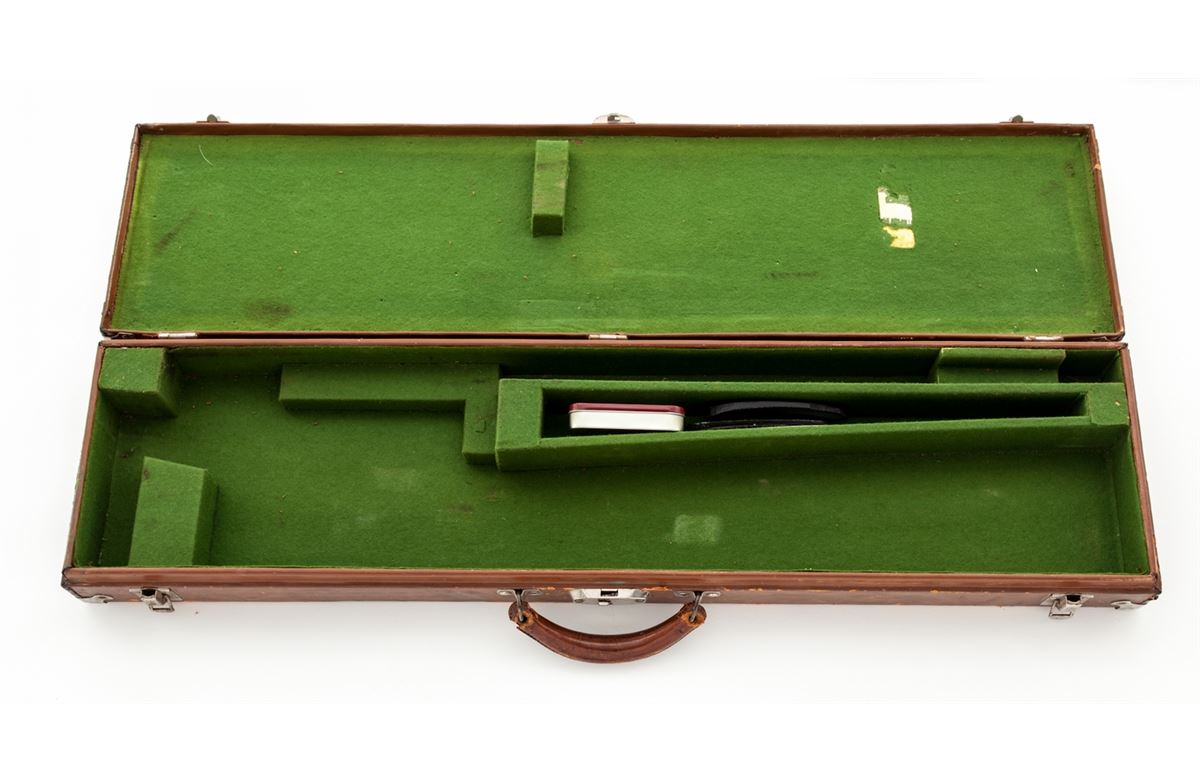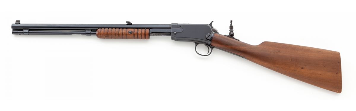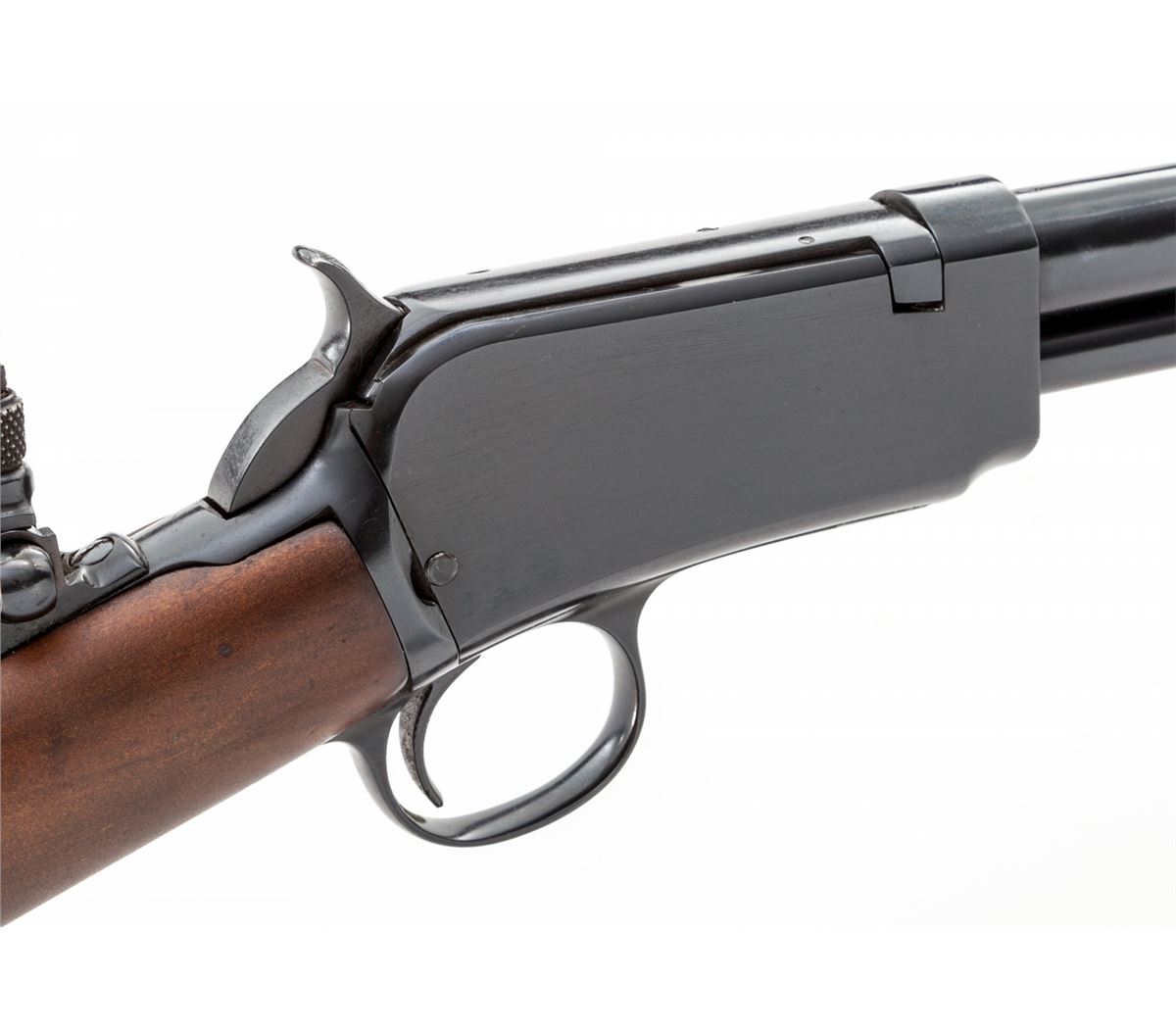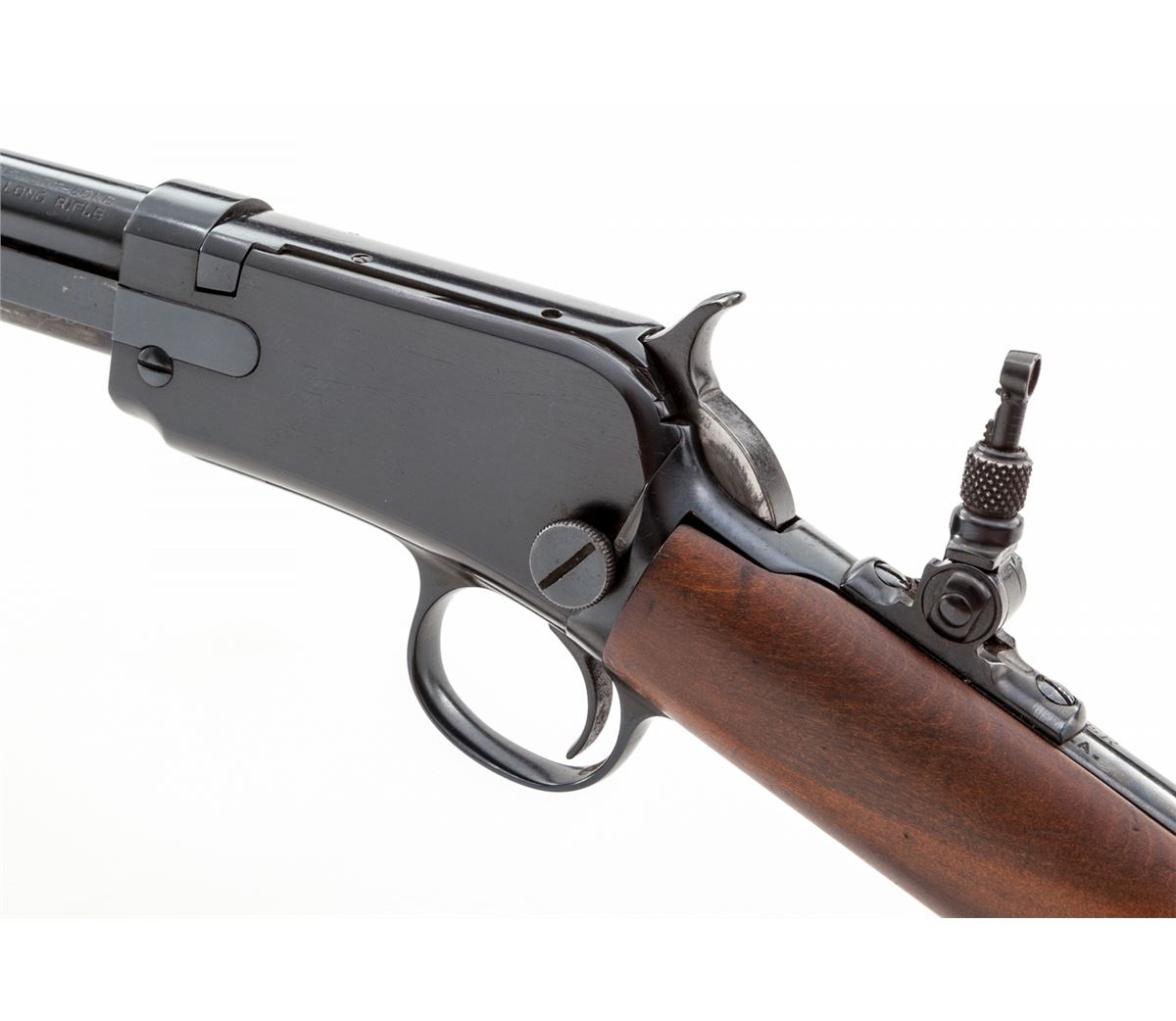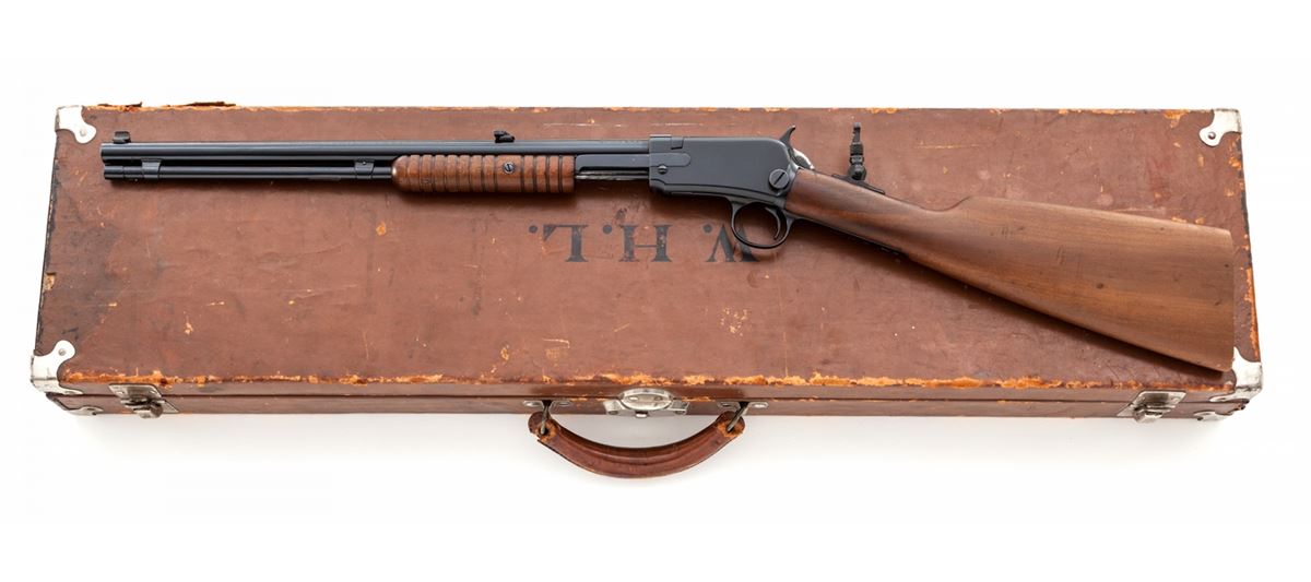 Winchester Model 1906 Pump Action Rifle, #846165, .22 SL/LR cal., 16'' barrel, blue finish, gumwood stock, with Marbles tang sight, late model 1894 rear sight, and brass bead front sight. In pre-war Denver retailer's case. Buttplate and spacers have been removed but are present inside one of the case compartments, as is original tang screw. Exceptionally high serial number may indicate a later parts clean-up rifle. Condition is excellent as shortened and refinished, retaining approx. 97% immersion type blue. Stocks with light scuffs and dings. Good action, bright bore. Exterior of case with moderate scuffs and losses, with initials ''WHL'' in center of lid. Est.: $500-$750. (C&R)