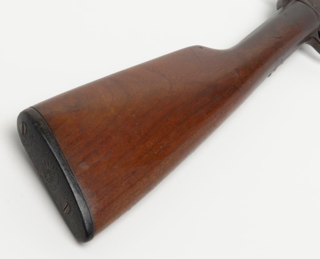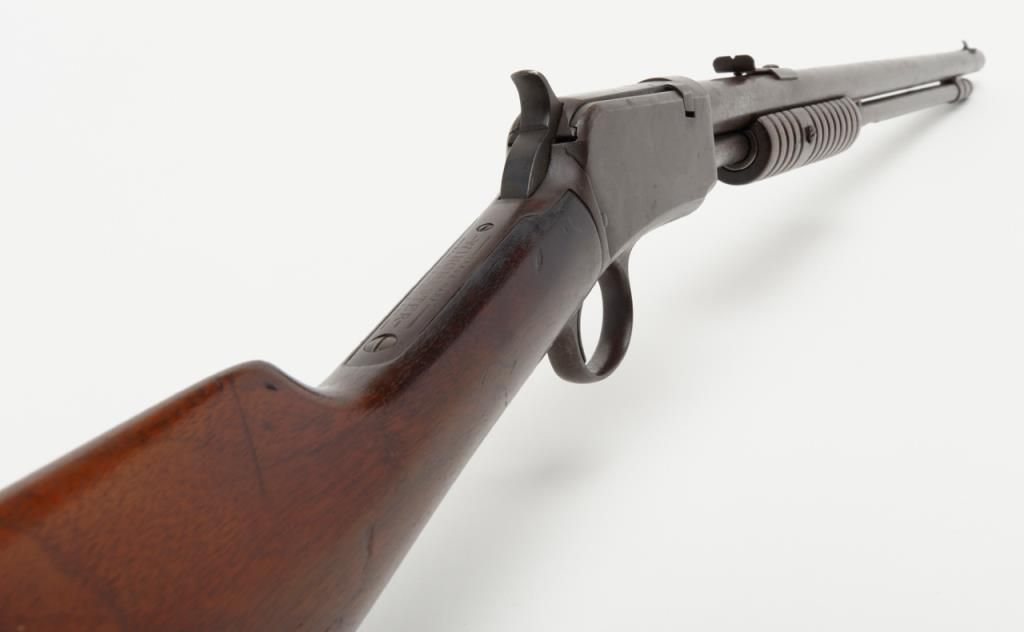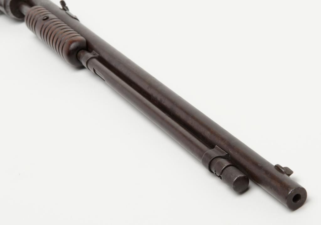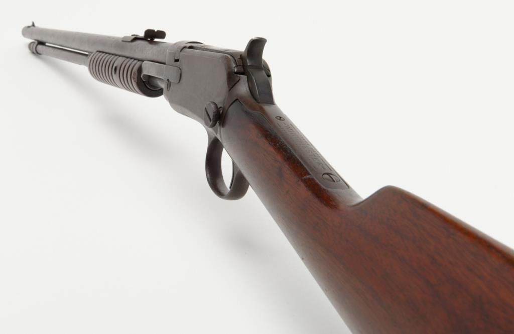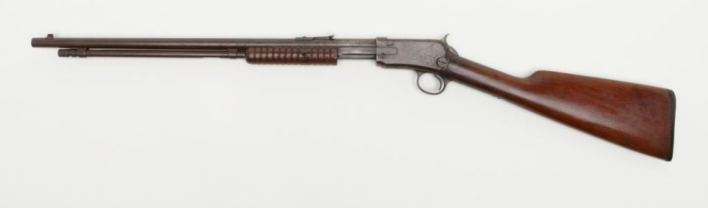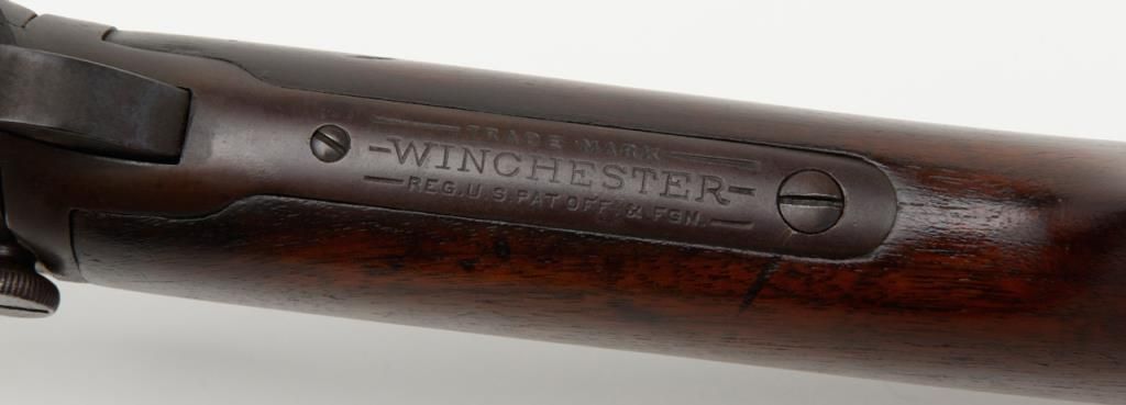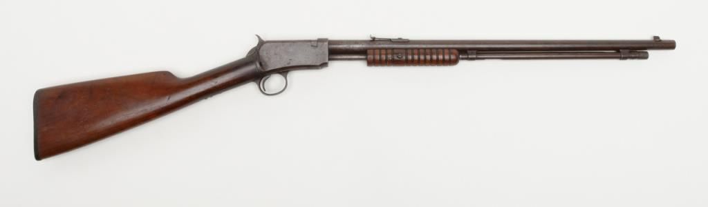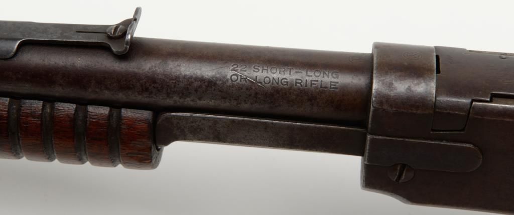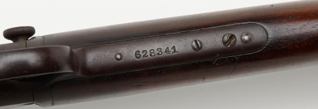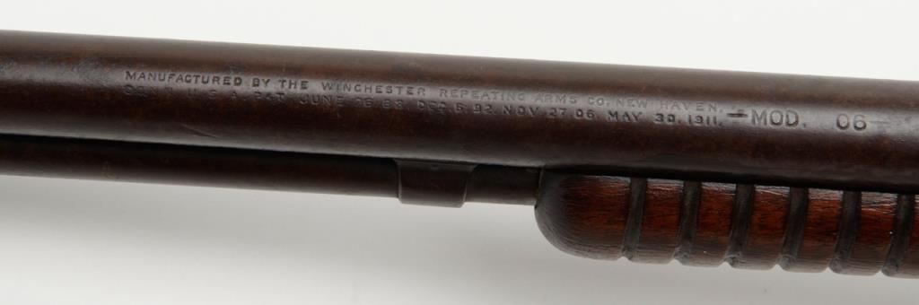 Winchester Model 1906 Takedown pump action rifle, cal. .22 Long Rifle, Long or Short, Serial #628341. The rifle is in overall good condition with a 20" blued barrel. The straight grip gumwood stock is in overall good condition, thebutt plate is black plastic, Winchester marked. The rifles finish has gone to an overall plum patina with light surface erosion on the magazine tube and barrel. The bore is fair and may clean to good. The action is marked with the suffix "B"at the base of the action, under the serial #. The markings remain legible and the action is crisp. (C+R/PPT). Est.: $250-$500.
