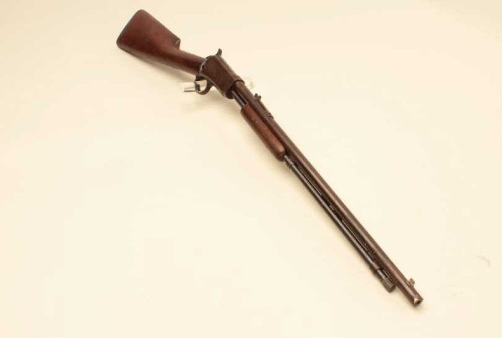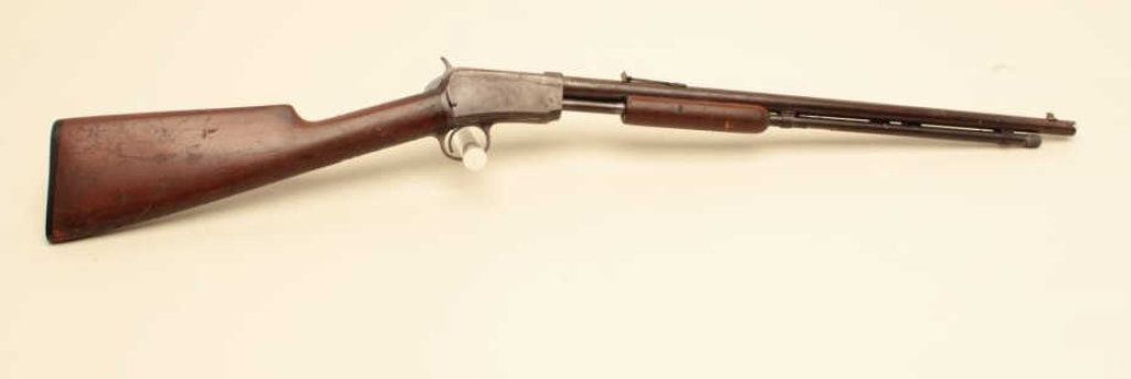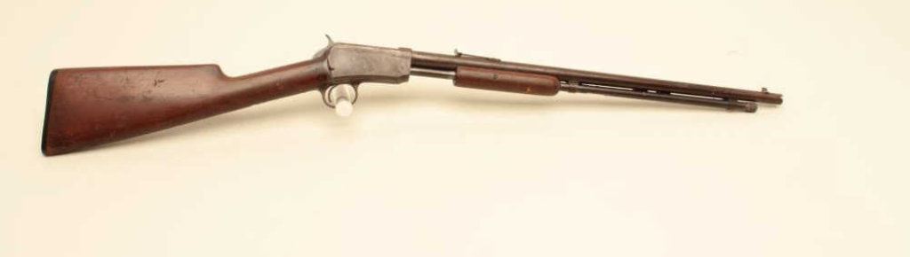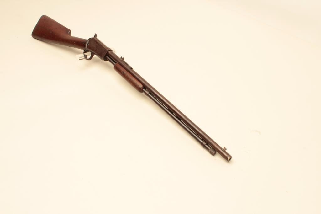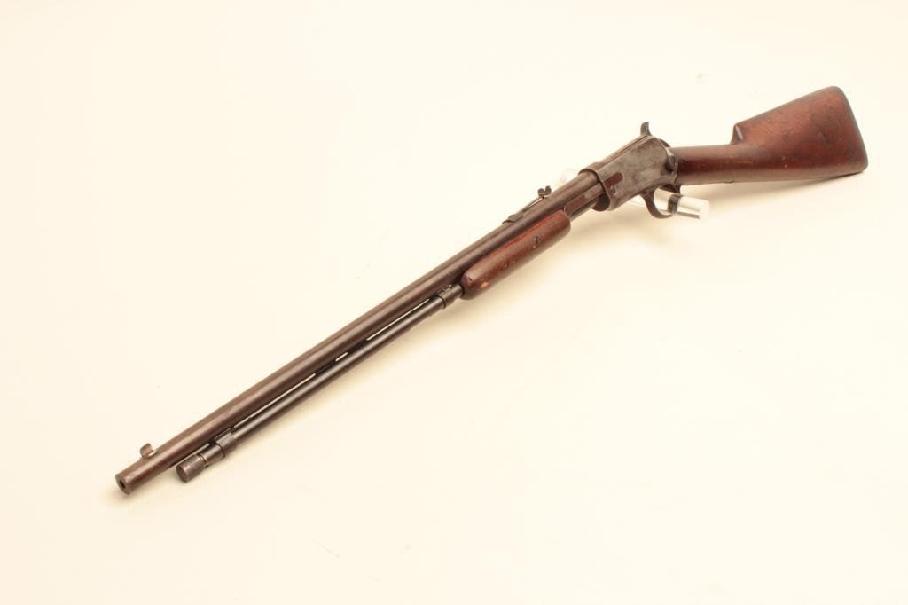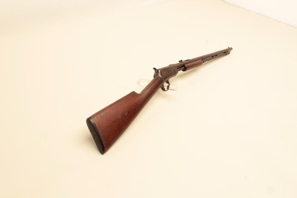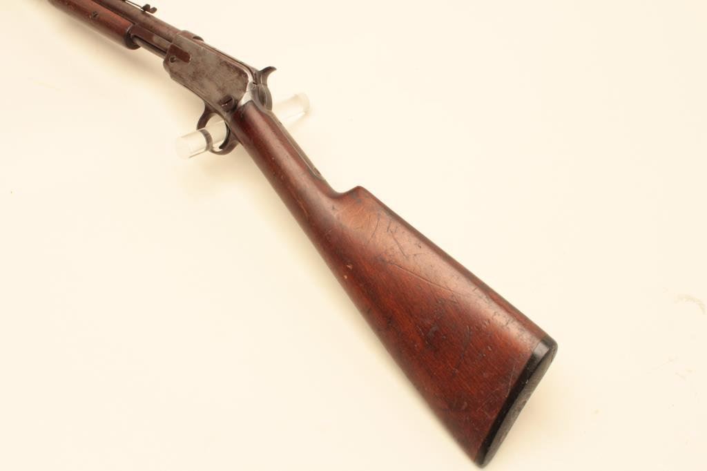 The rifle is in fair overall condition with a 20” round barrel. The barrel has gone to a plum patina with some white paint spatter and light to moderate surface erosion. The receiver has been cleaned on the left side which left light scratches and a grey patina while the right side is darker and uncleaned. The smooth wood stock is in fair condition with mars and compressions from use. The butt ends with a Winchester marked hard rubber butt plate. The bore is rough and may clean to fair, the action is crisp and markings are legible. Est.: $150-$300. (C+R).