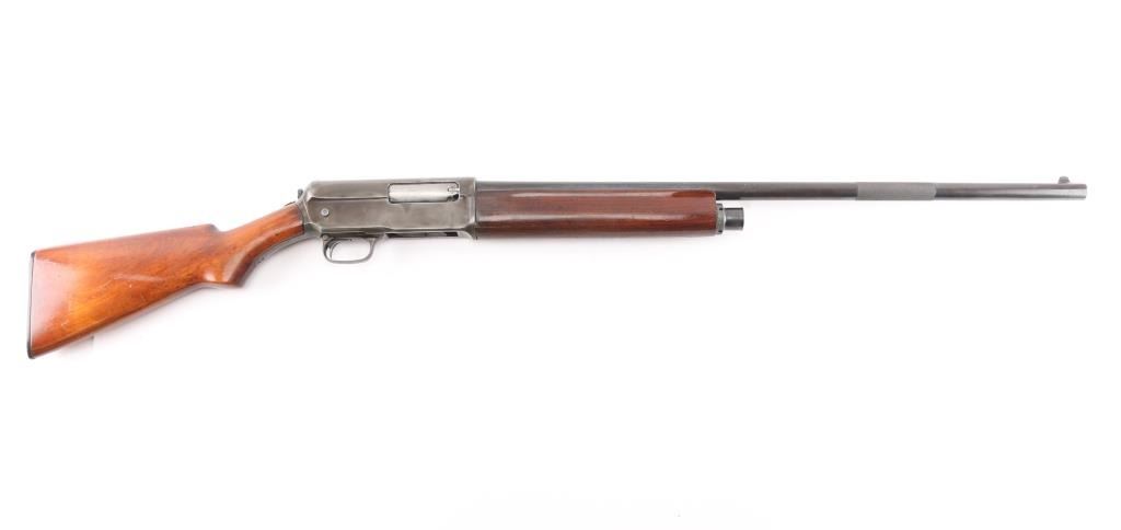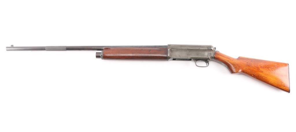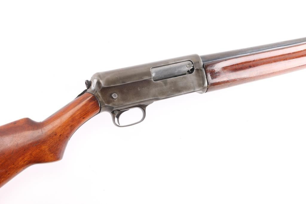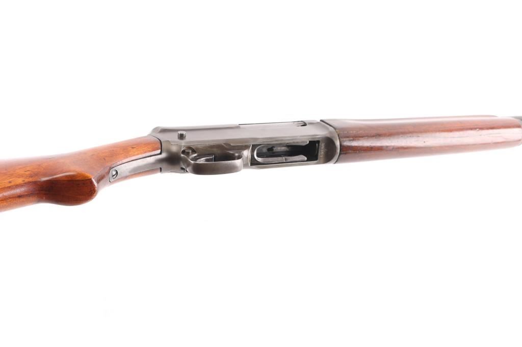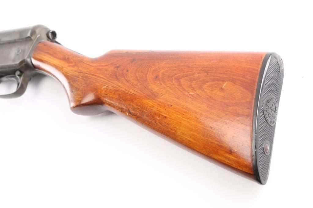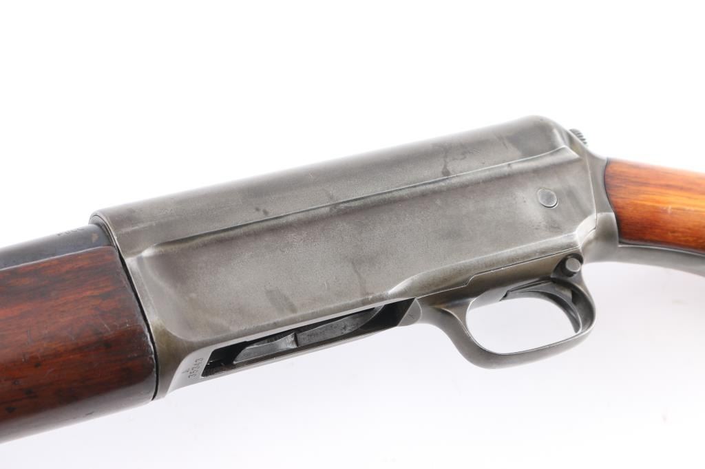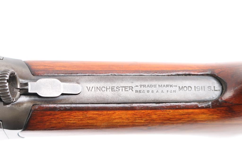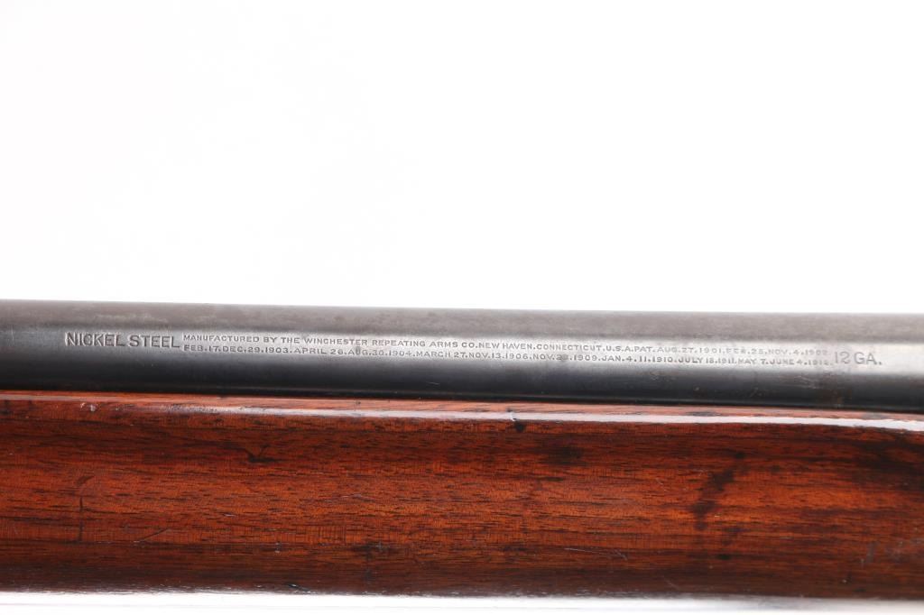 Note* Upon inspection of this shotgun, we have found that upon charging, it slam fires making it unsafe to load/shot. Please have it seen by a competent gunsmith before attempting to load it as it is currently unsafe. Self-Loading. 5-rd Capacity. "The Widow Maker'. Manufactured 1911-1925. This one made second year of manufacture 1912. Long recoil action. 28" barrel with blade sight. Fed from tubular magazine. Triggerguard mounted safety. Standard Winchester markings on tang, and barrel. Factory hard rubber buttplate. Shotgun charged by pulling back the barrel by the checkered section with it pointed in a safe direction. Some users mistakenly cycled the weapon by placing the butt on the ground, and forcing the the barrel down. In this position, the muzzle would be pointing towards the face of the user, with potential for slam fire. Thus the nickname. There of documented cases of people being killed in this manner. Bore is excellent/bright. Plunger action is a little stiff. Wood is overall very good/sound with minor scratches/dents, has been varnished. Blued finish has dulled somewhat, and is about 40%, with handling wear, mostly on the receiver and barrel. LOP is 13 3/4". Full choke.