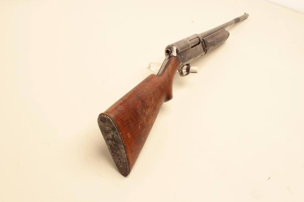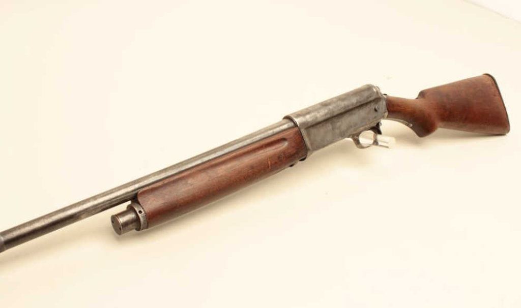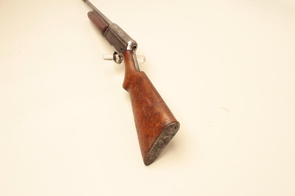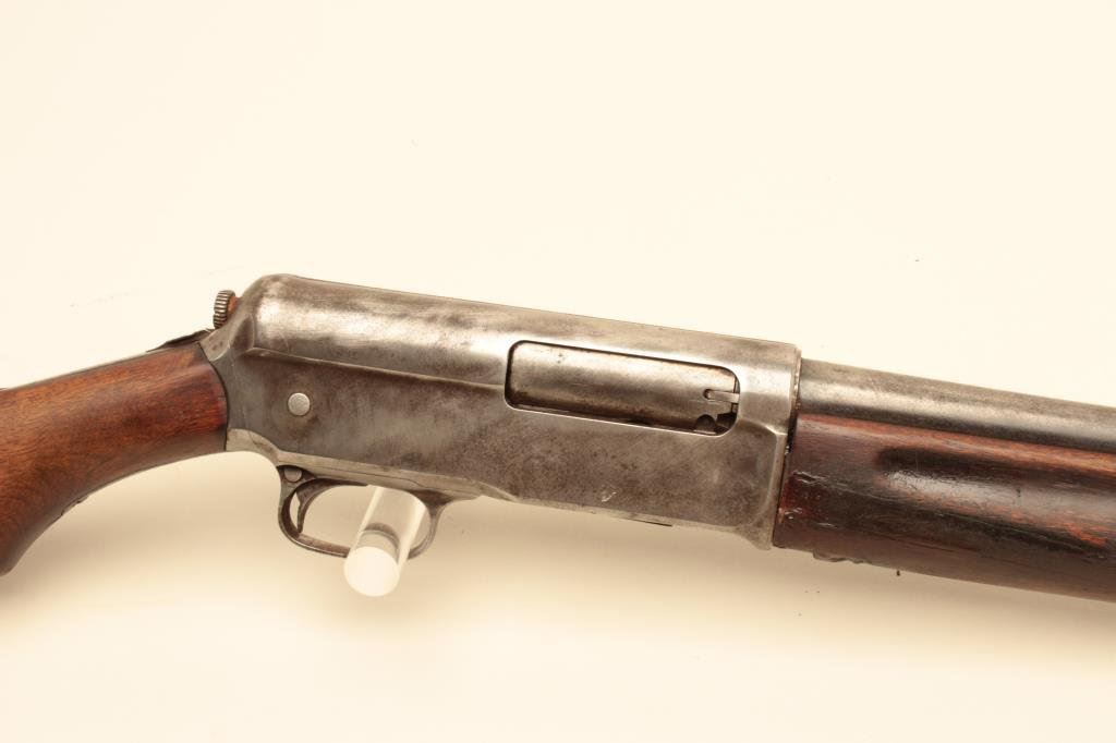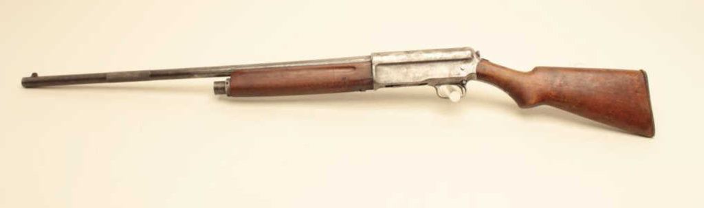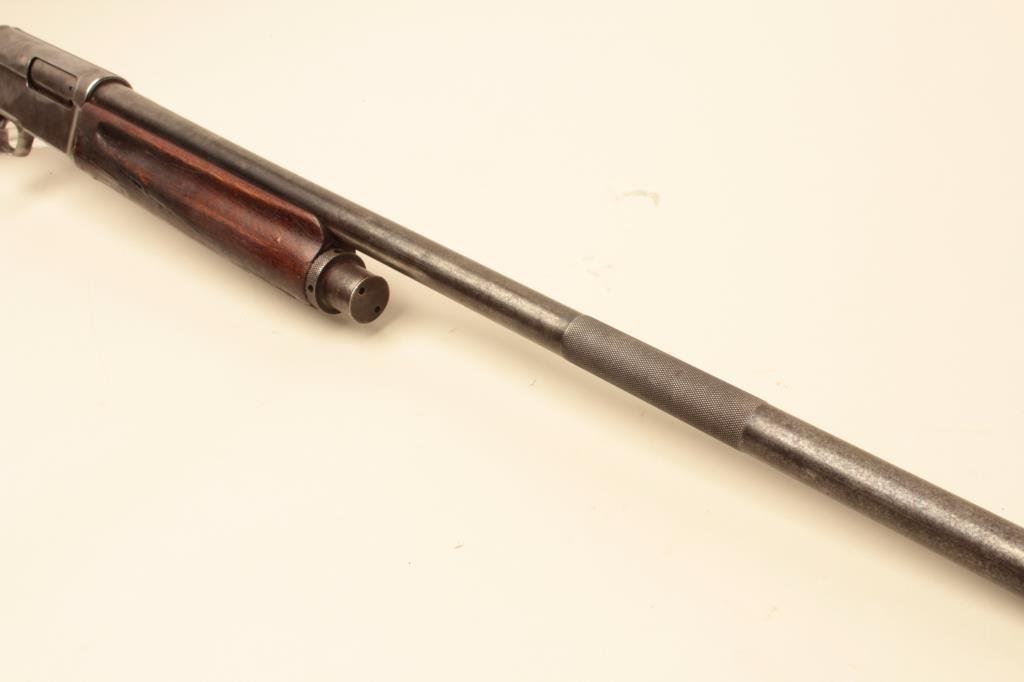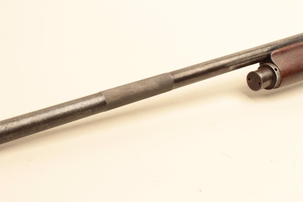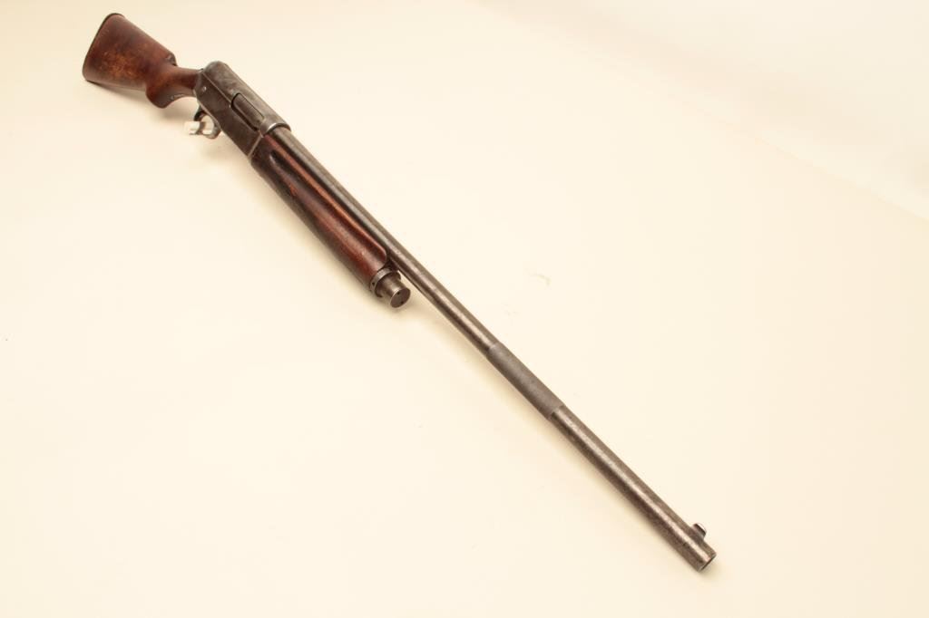 shotgun is in fair overall condition with a 28” barrel with a blade front sight and stippling approximately 7” from the muzzle. The barrel has gone primarily to grey patina with some blue in protected areas and light surface erosion evident. The receiver has been polished to silver with small amounts of thinning blue in the protected areas. The smooth wood stocks are in poor condition showing heavy use with large repairs on the fore end, including a 10” lateral crack. The butt stock ends with a smooth steel butt plate and a 13 ½” LOP. The bore is fair, the action functions and markings are legible. Est.: $175-$350. (C+R).