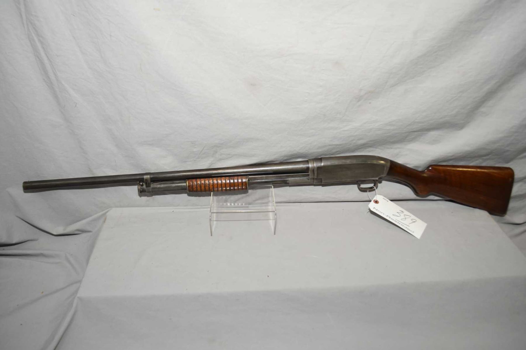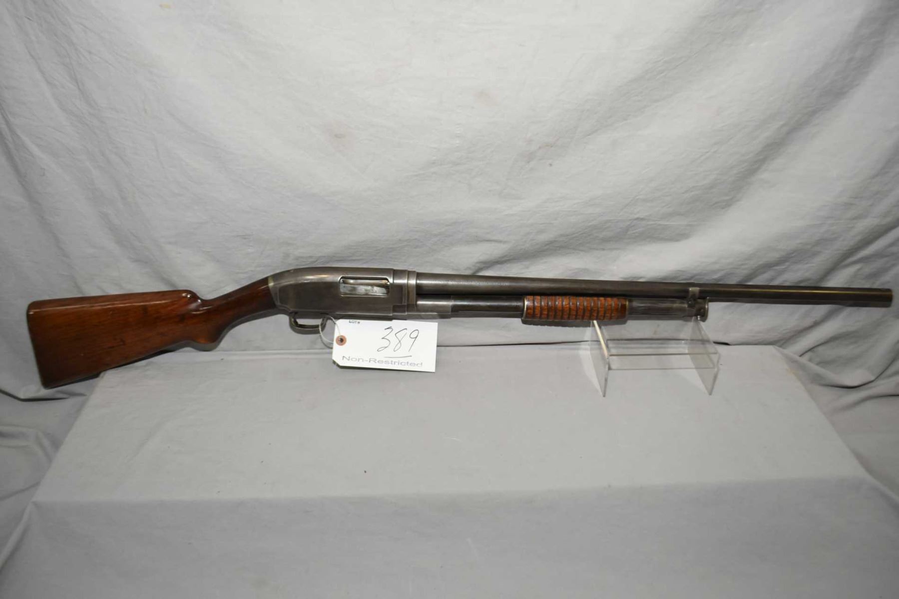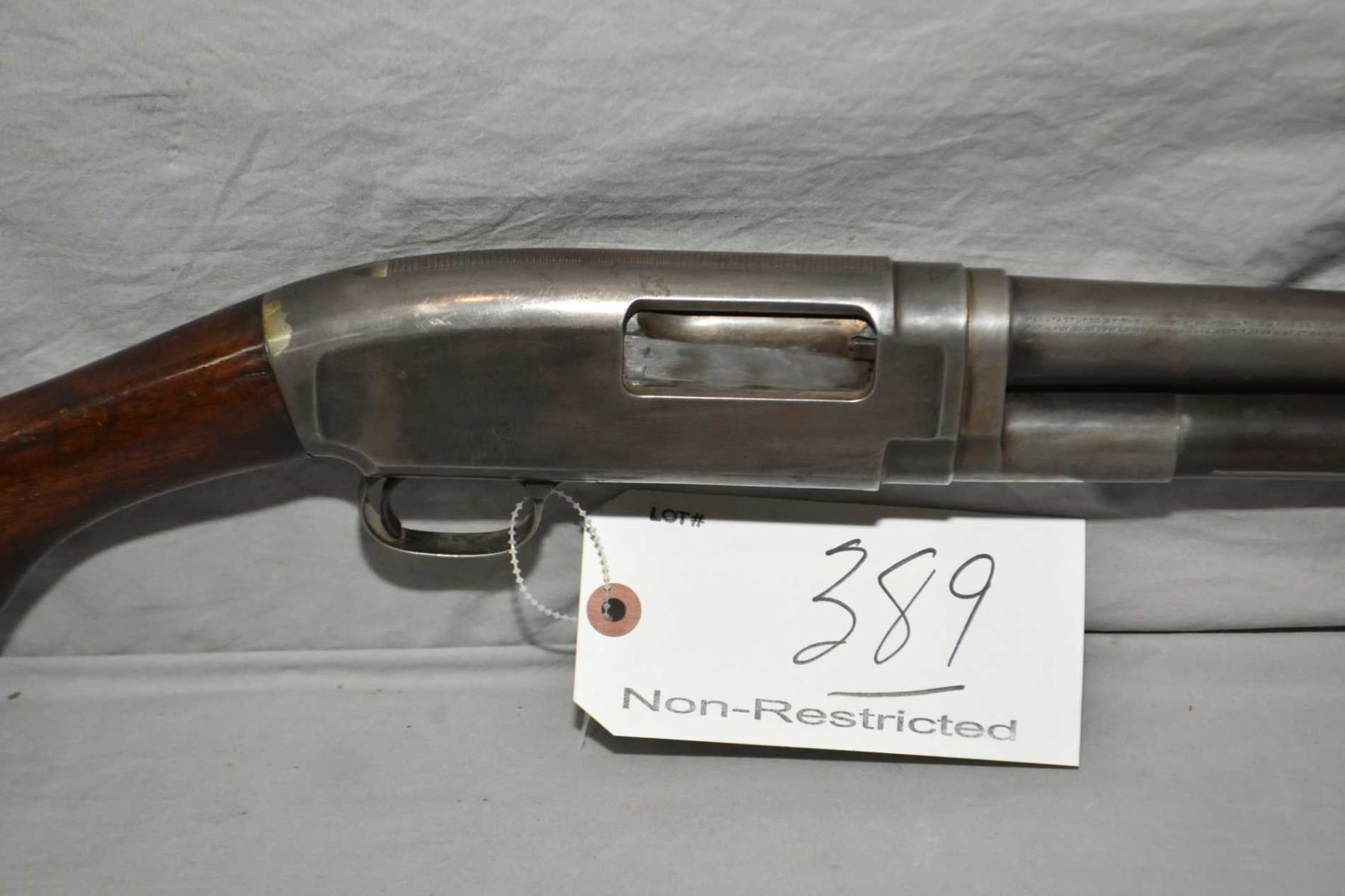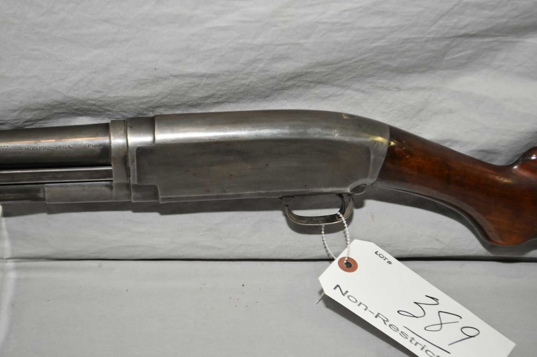 Winchester Model 1912 .16 Ga Pump Action Shotgun w/ 26" bbl [ fading blue finish, more in protected areas, some marks and light pitting, plain pistol grip stock with some marks, and a crack by toe, repaired along with the Winchester Repeating Arms butt plate, good grooved forewood with few marks, Circa 1912 1 St Year of Production ] Ser # 5200