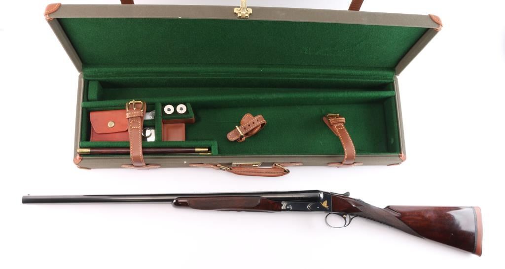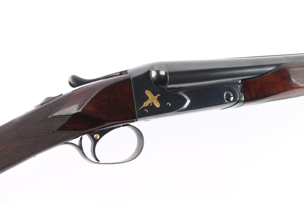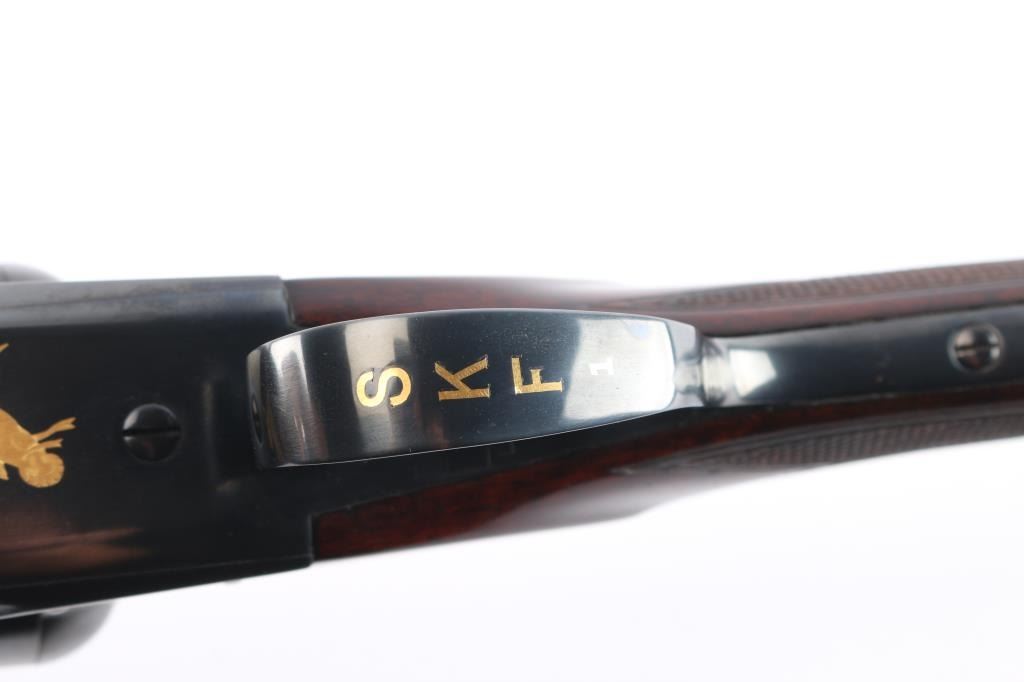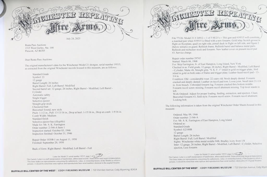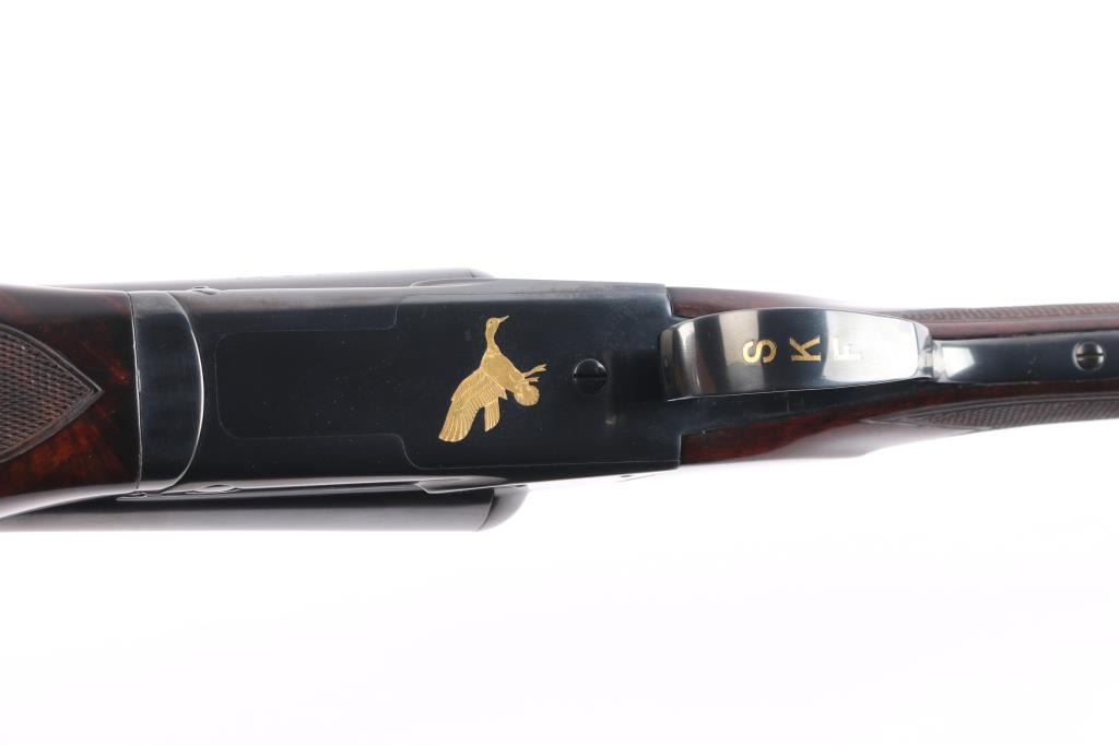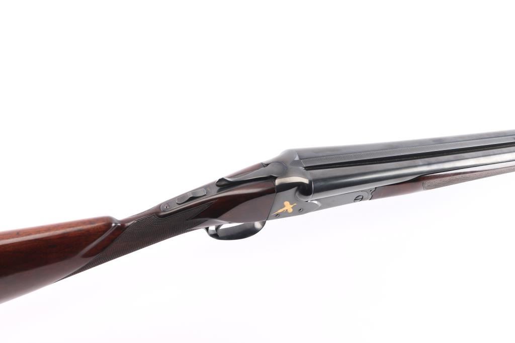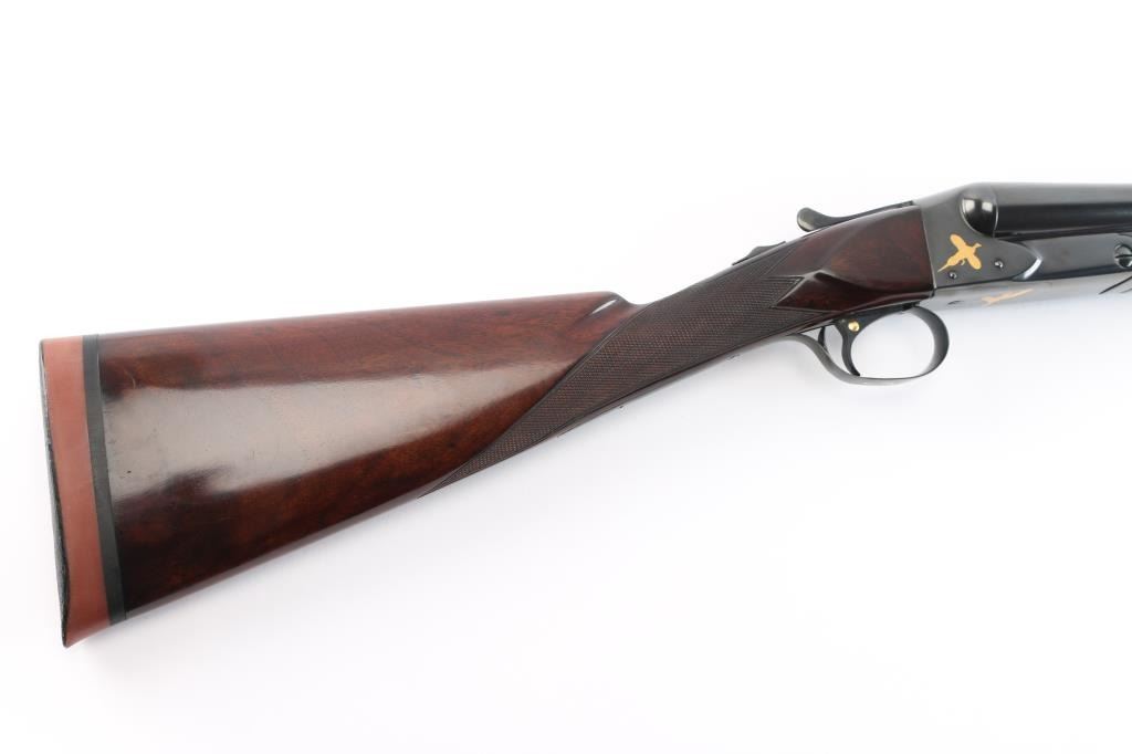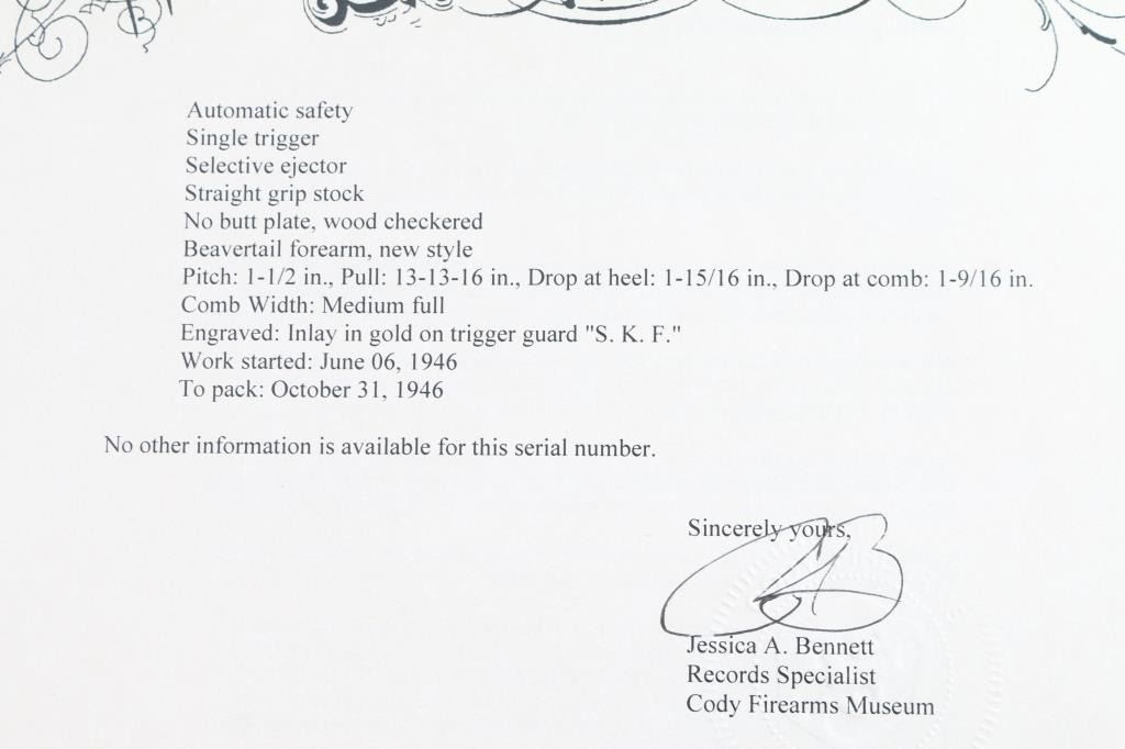 Factory refinished & gold inlaid side-by-side double barrel boxlock shotgun chambered for 2 3/4" & 3” 12 gauge shells. Manufactured in New Haven, CT circa 1946 as a ‘Standard Grade’ for S. K. Farrington and subsequently returned to the factory in 1968 for repairs & embellishments. The accompanying Cody letter states this gun & #24912 “will constitute a matched pair” with identical embellishments. Features a blued refinish with gold inlaid Scotch grouse, pintail duck & quail on the receiver / trigger plate & “S / K / F / 1” on the triggerguard , 26" barrels with matted solid rib & fixed Mod / Full chokes, selective ejectors, Bradley ivory front sight, steel mid-bead, single trigger with push button barrel selector, automatic tang safety with gold filled "SAFE", knurled top lever, gloss finished walnut beavertail forend with kidney pattern checkering and straight grip shoulder stock with a leather faced red recoil pad. Stock dimensions – drop at comb 1 5/8”, drop at heel 1 15/16 ”, length of pull 13 3/4” and cast-off approx. ¼”. Matching serial numbers are found on the receiver, barrels, forend and forend metal. Includes a Cody letter stating it was “Made for: Mr. S. K. Farrington of East Hampton, Long Island” and detailing its order & repair order details. Also includes a canvas wrapped, partitioned trunk case with snap caps, oiler bottle & cleaning tools. Selwyn Kip Farrington 1904-1983 is most known for his writings and big game fishing. He served as fishing editor of Field & Stream from 1937 to 1972 and was friends with Ernest Hemingway and Alfred Glassell. He wrote over 20 books including “Ducks Came Back, the story of Ducks Unlimited” and “Fishing with Hemingway and Glassell”. Shotgun retains approximately 99% of its refinish blue showing superficial handling marks with no major wear observed. The action is tight with the top lever standing right of center, the bores are excellent / bright and the walnut stocks are near excellent with minor imperfections.