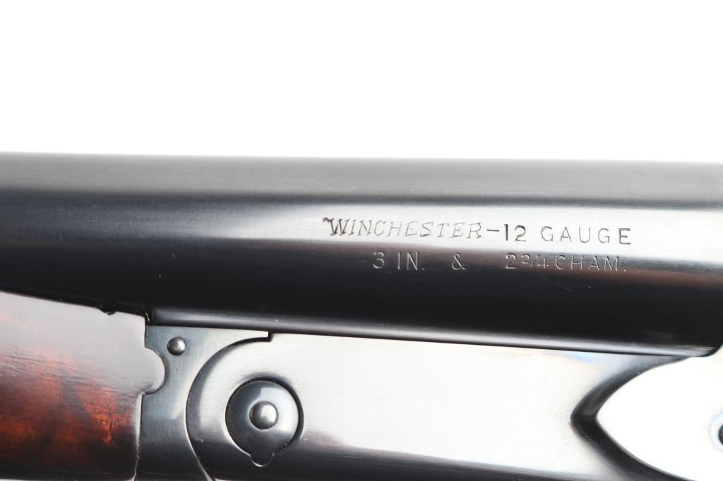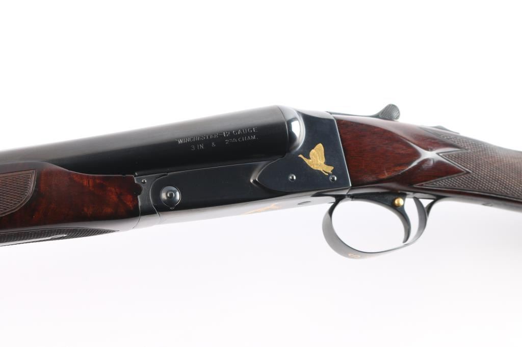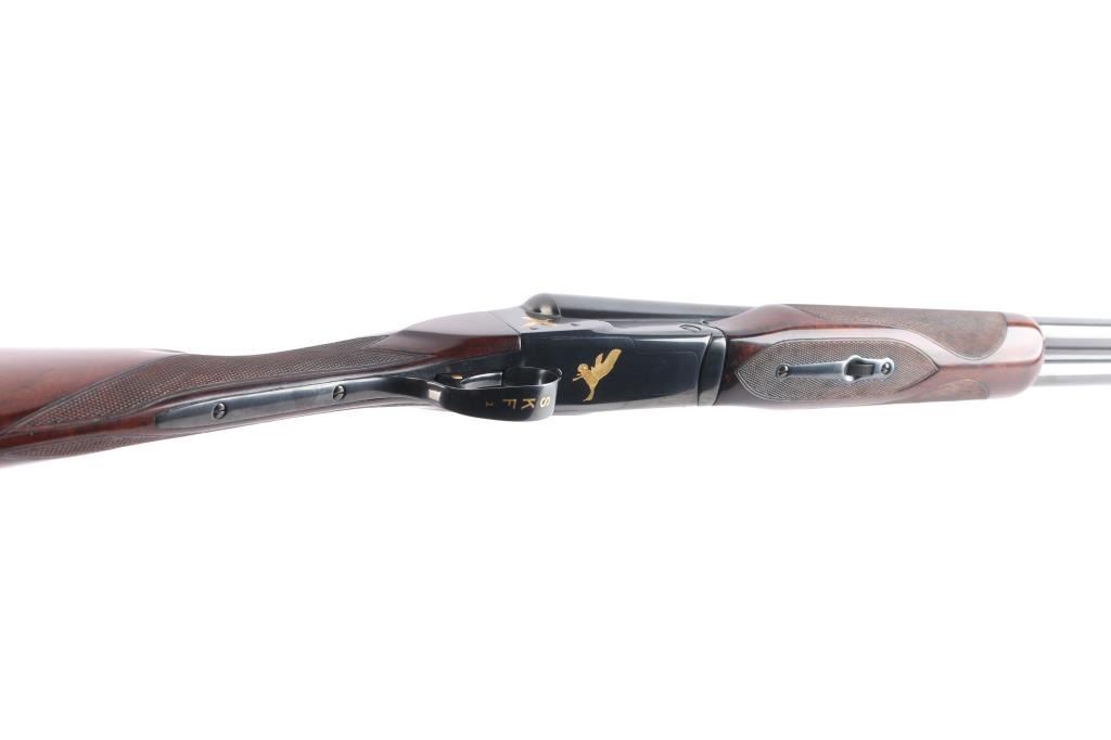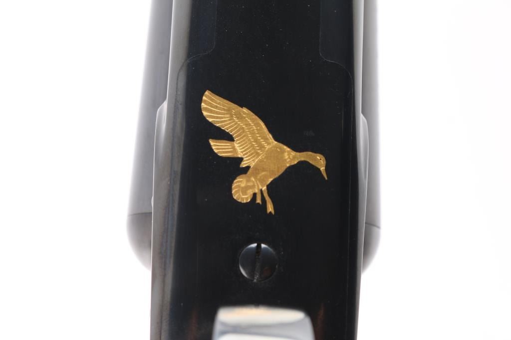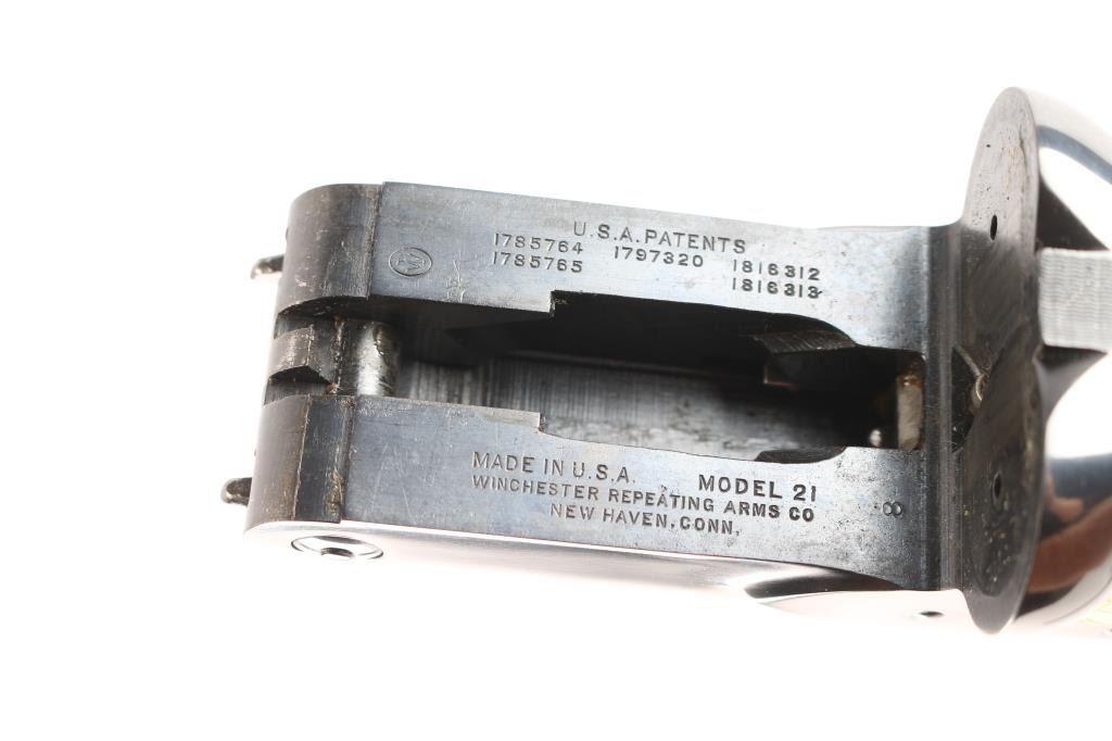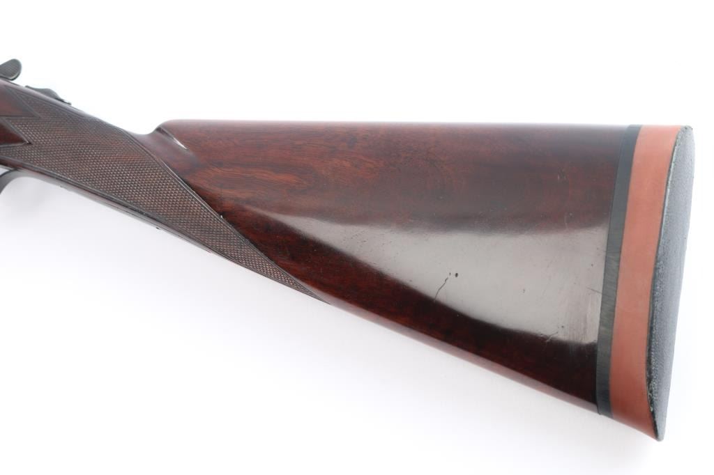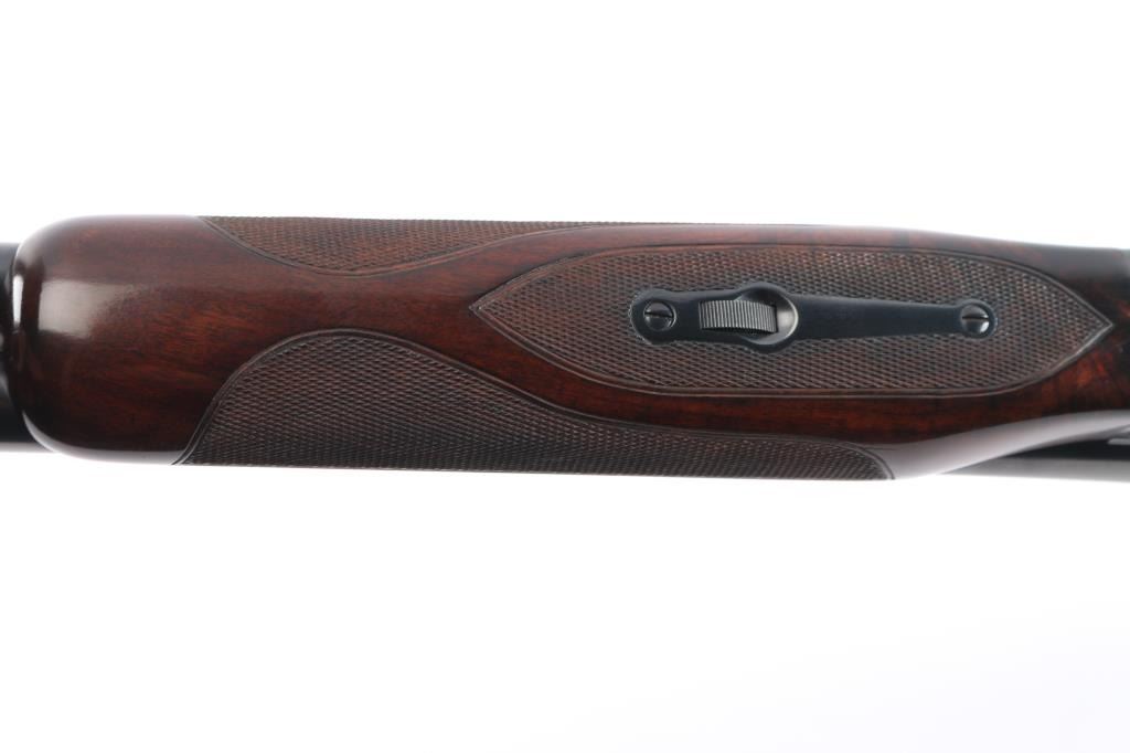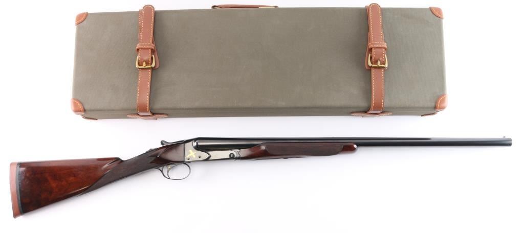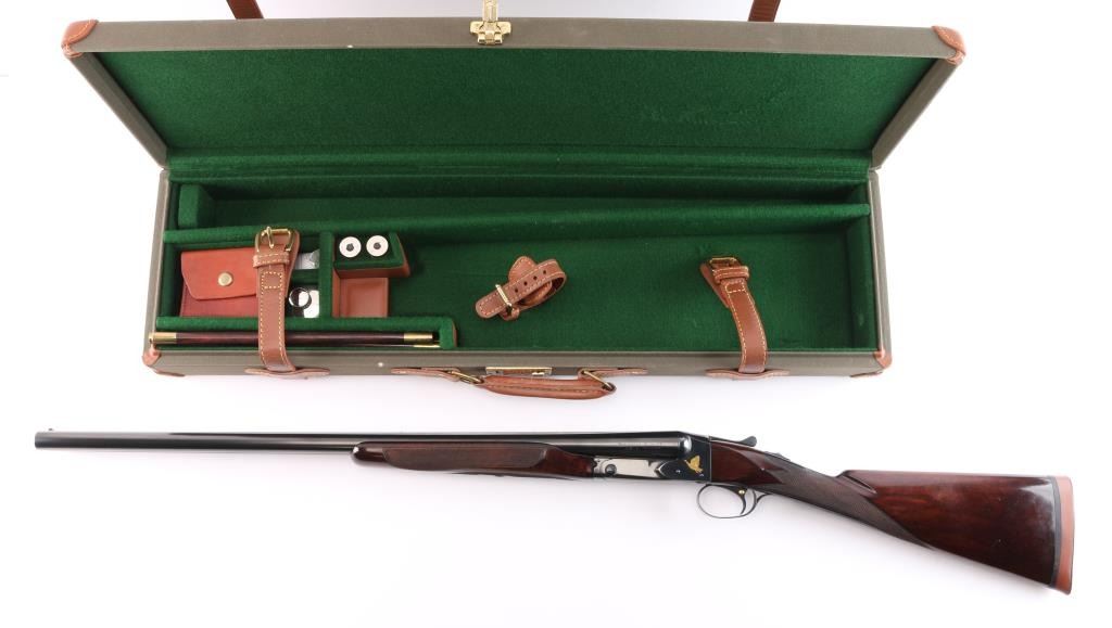 Factory refinished & gold inlaid side-by-side double barrel boxlock shotgun chambered for 2 3/4" & 3” 12 gauge shells. Manufactured in New Haven, CT circa 1946 as a ‘Standard Grade’ for S. K. Farrington and subsequently returned to the factory in 1968 for repairs & embellishments. The accompanying Cody letter states this gun & #24912 “will constitute a matched pair” with identical embellishments. Features a blued refinish with gold inlaid Scotch grouse, pintail duck & quail on the receiver / trigger plate & “S / K / F / 1” on the triggerguard , 26" barrels with matted solid rib & fixed Mod / Full chokes, selective ejectors, Bradley ivory front sight, steel mid-bead, single trigger with push button barrel selector, automatic tang safety with gold filled "SAFE", knurled top lever, gloss finished walnut beavertail forend with kidney pattern checkering and straight grip shoulder stock with a leather faced red recoil pad. Stock dimensions – drop at comb 1 5/8”, drop at heel 1 15/16 ”, length of pull 13 3/4” and cast-off approx. ¼”. Matching serial numbers are found on the receiver, barrels, forend and forend metal. Includes a Cody letter stating it was “Made for: Mr. S. K. Farrington of East Hampton, Long Island” and detailing its order & repair order details. Also includes a canvas wrapped, partitioned trunk case with snap caps, oiler bottle & cleaning tools. Selwyn Kip Farrington 1904-1983 is most known for his writings and big game fishing. He served as fishing editor of Field & Stream from 1937 to 1972 and was friends with Ernest Hemingway and Alfred Glassell. He wrote over 20 books including “Ducks Came Back, the story of Ducks Unlimited” and “Fishing with Hemingway and Glassell”. Shotgun retains approximately 99% of its refinish blue showing superficial handling marks with no major wear observed. The action is tight with the top lever standing right of center, the bores are excellent / bright and the walnut stocks are near excellent with minor imperfections.