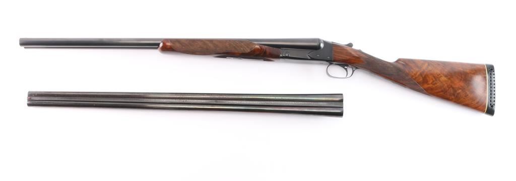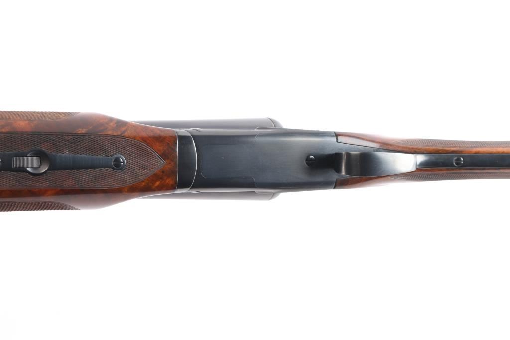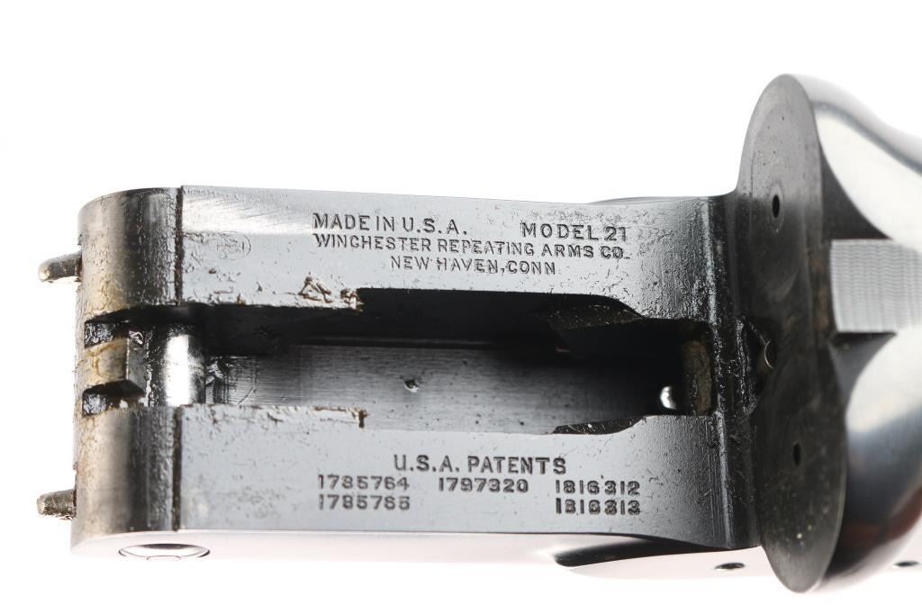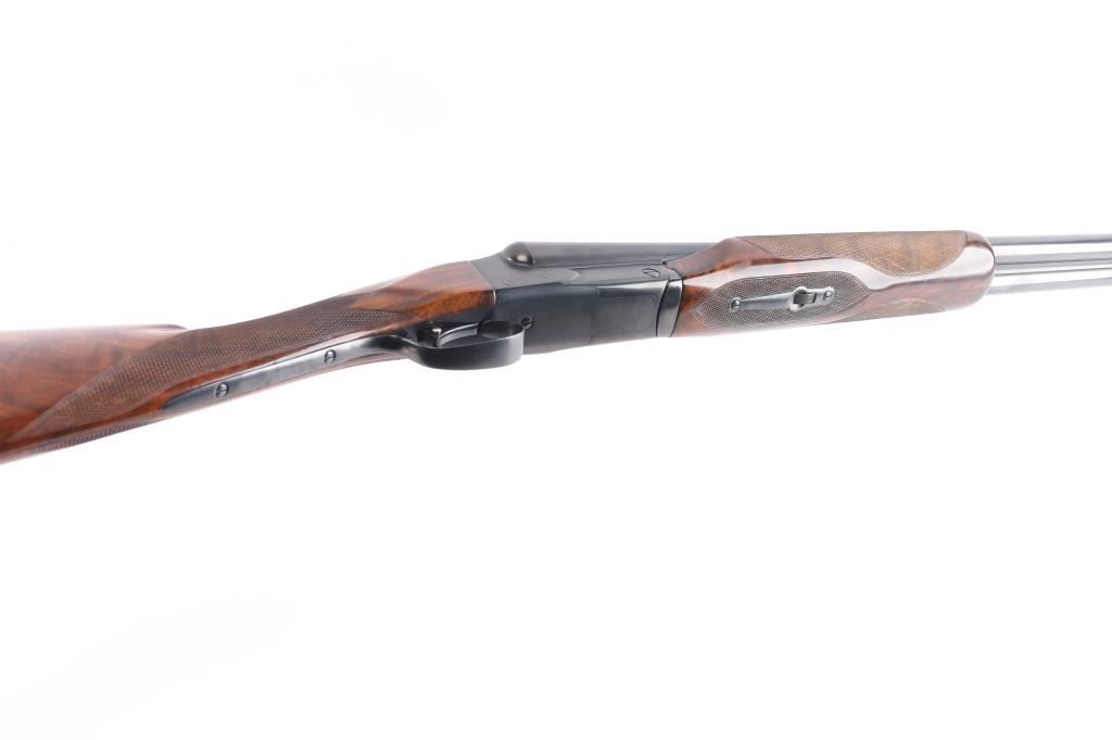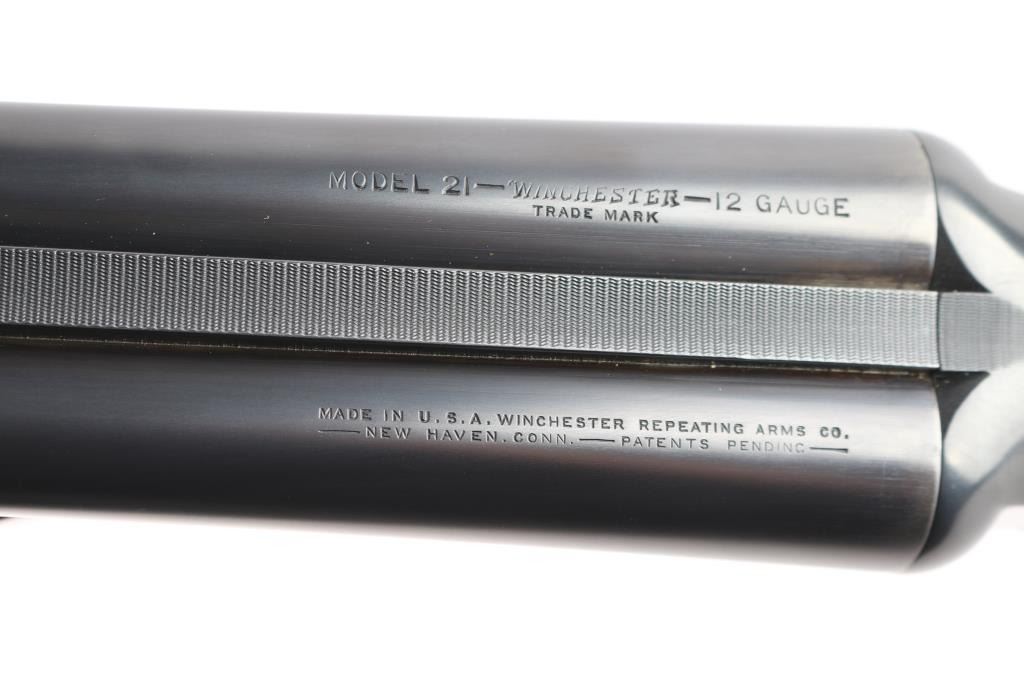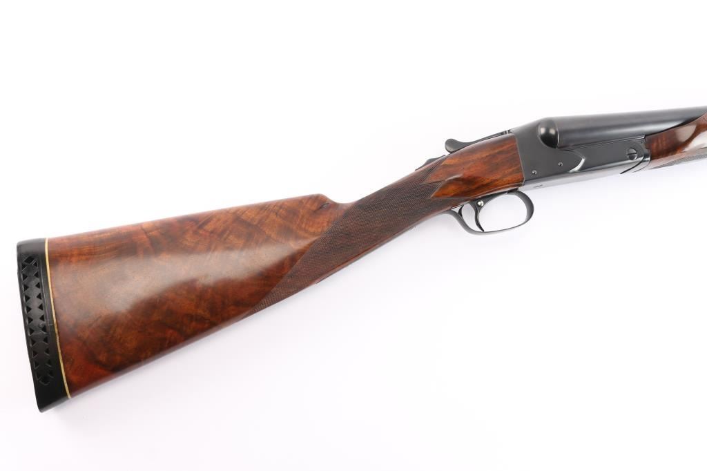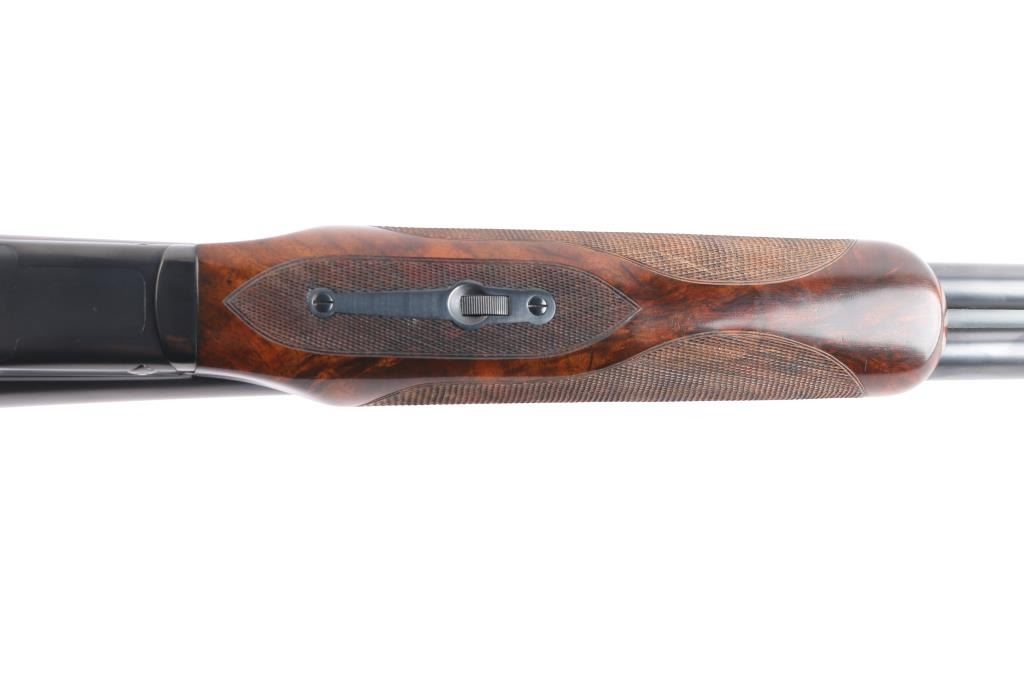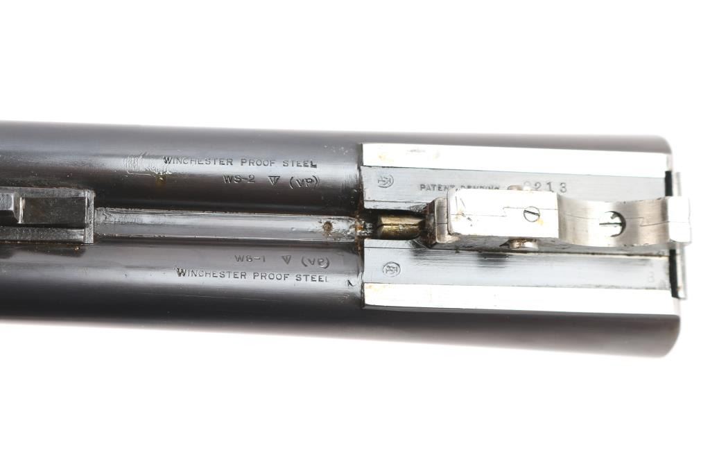 Features a blued refinish, 26" barrels with matted solid rib & fixed chokes marked WS-2 / WS-1, selective ejectors, red Bradley front sight, white mid-bead, single trigger with push button barrel selector, non-automatic tang safety with gold filled "SAFE", knurled top lever, gloss finished walnut beavertail forend with kidney pattern checkering and straight grip shoulder stock with Winchester recoil pad.