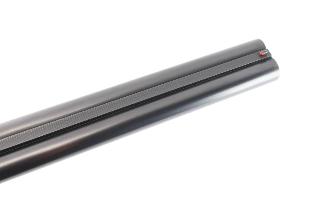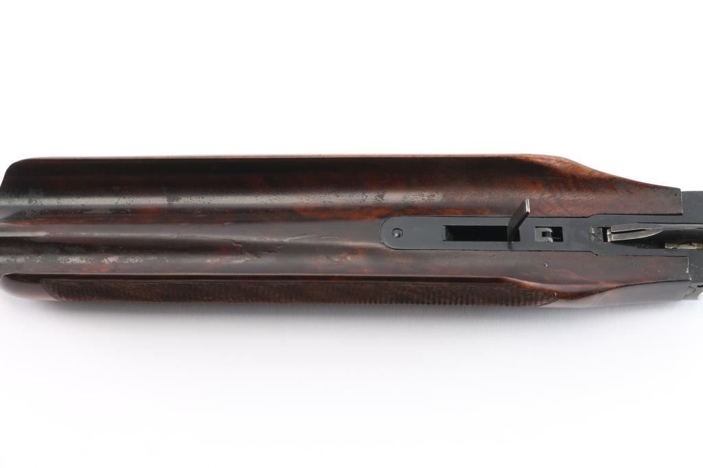 Shotgun retains approximately 95% of its refinish blue showing edge wear and the front sight canted down slightly. The action has minor play with the top lever standing left of center but it otherwise functional, the bores are excellent / bright measuring Mod / Cyl with a drop in choke gauge and the walnut stocks are very good with a dent on the underside of the forend, a small repair on the right side of the forend near the shoe & the back of the forend reshaped (likely to address a previous loss).