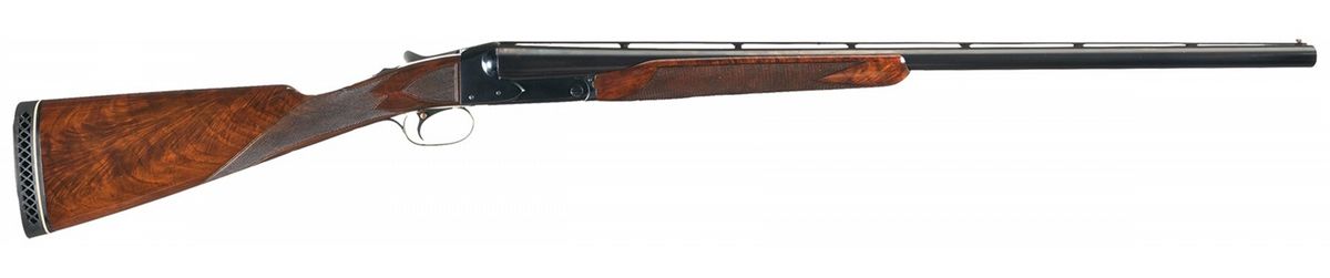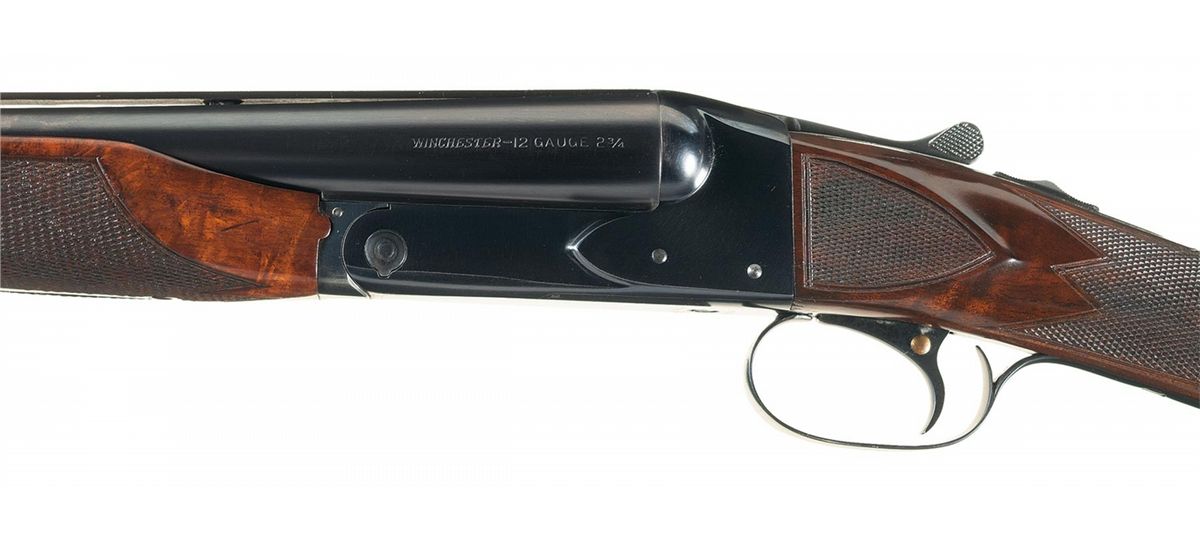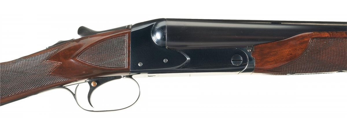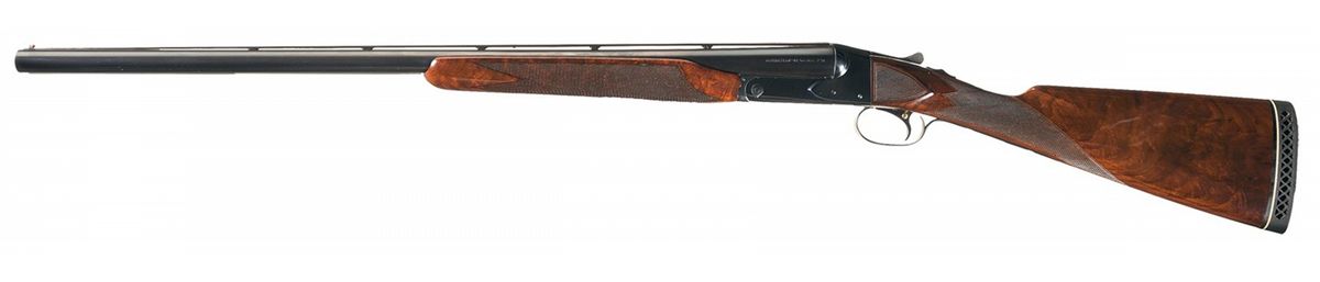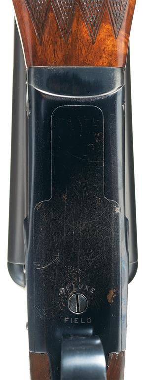 Manufactured from 1931 to 1959, the Model 21 represents the top of the line in Winchester's domestic double barrel production. Red bead front and ivory mid bead sights, with the left rear barrel marked "WINCHESTER-12 GAUGE 2 3/4". The serial number is marked on the upper tang and the matching number is marked on the barrel flat. The water table is marked "MADE IN U,S,A, MODEL 21/WINCHESTER REPEATING ARMS CO/NEW HAVEN, CONN.", the water table and barrels have the Winchester oval proof and the Winchester proof steel barrels are both marked "WS-1". The breech end of the barrels are marked "C/272". The trigger guard plate is marked "DELUXE/FIELD". 2 3/4 inch chambers, the barrels gauge at a cylinder/cylinder and ejectors. Mounted with a multi-point checkered walnut forearm and straight grip stock with checkered flats and vented Pachmayr White Line recoil pad. Length of pull is 14 1/8 inches.