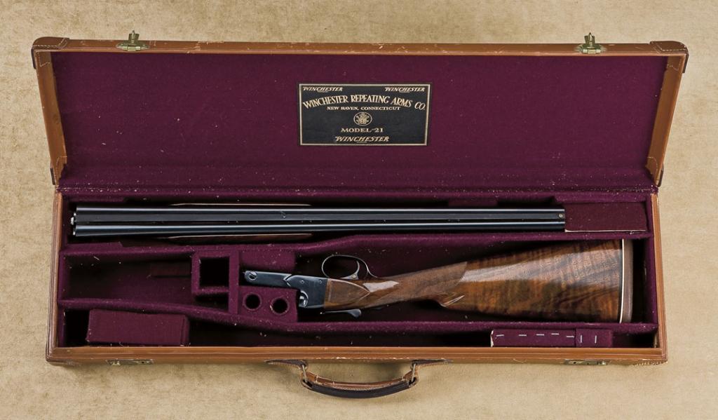 Winchester Model 21 Deluxe Skeet, 20 gauge, 26” bbls, single trigger, auto ejector, vent-rib, finely restocked and refinished in trunk case with Winchester label #12141. The gun has been expertly refinished with correct color and edges left sharp, markings good. The stocking is also expertly done similar to factory style with fancy checkering pattern. The stock measures 14 ½” to end of pad, 14 ¾” to end of rubber, the action tight, choked WSI and WSII, bores near excellent. The case is good to very good and shows some carry and travel wear but nothing serious. Est. $5,000-10,000