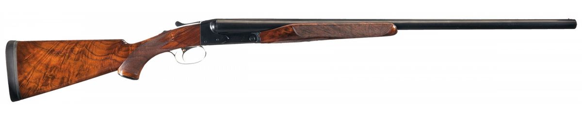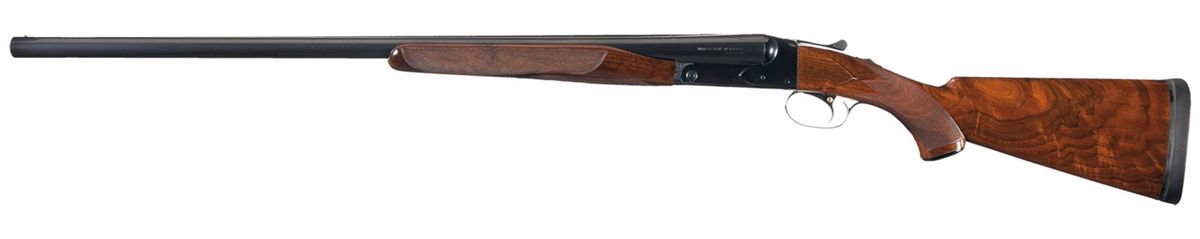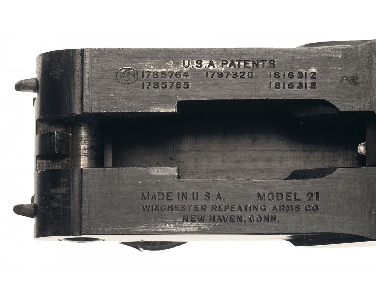 This Standard Grade shotgun was manufactured from 1936 to 1959 and features a single steel bead sight on a concave matte rib barrel with 2-3/4 inch chambers and choked full/modified with ejectors. The left barrel is marked "WINCHESTER - 12 GAUGE/2 3/4 CHAM." at the breech. The water table is marked with the U.S. patent numbers on the right side and model designation and address on the left side. Single selective trigger with push button selector, tang mounted manual safety and mounted with fancy grain checkered beaver-tail forearm and pistol grip stock with a hard rubber grip cap and solid Kickeez recoil pad. Length of pull is 13 3/4".